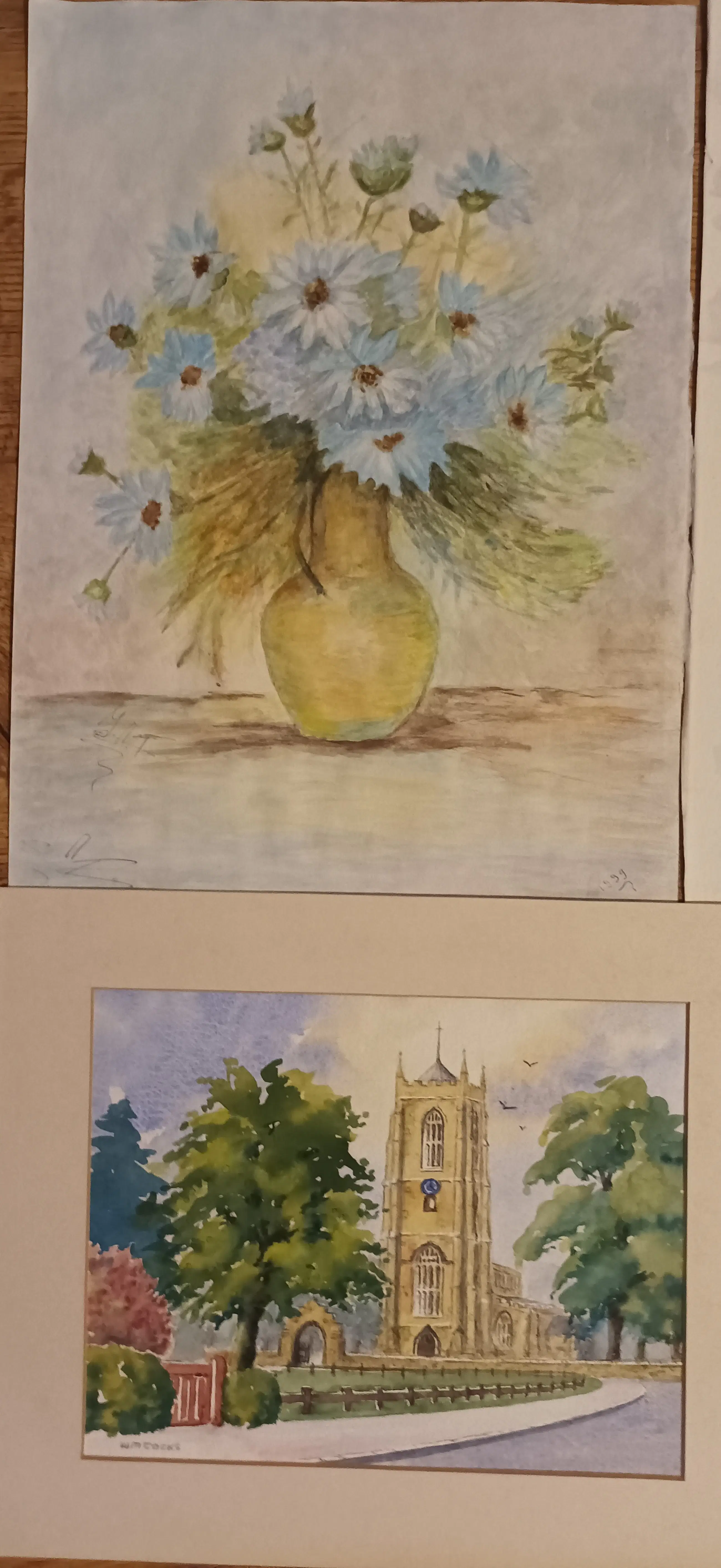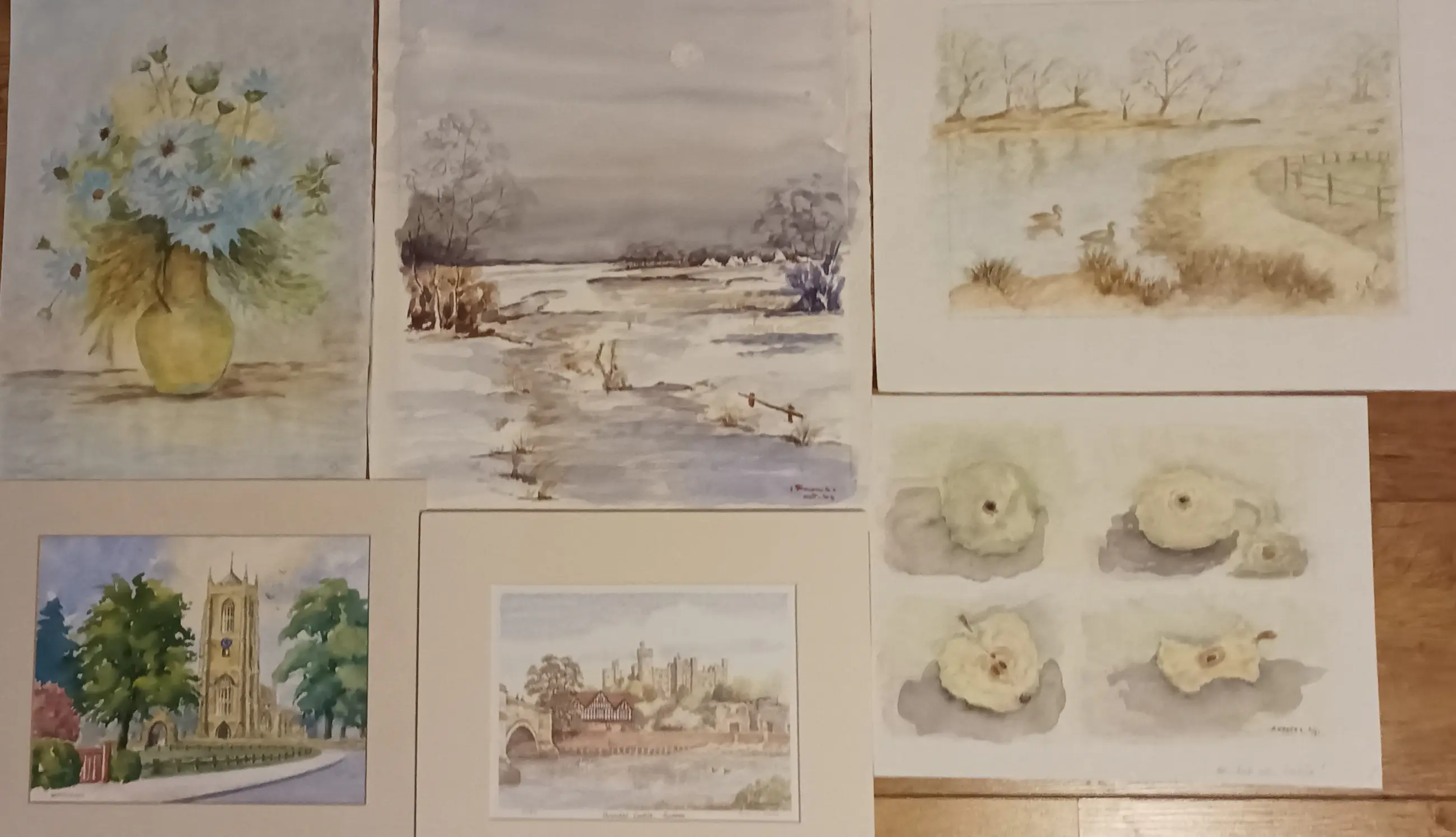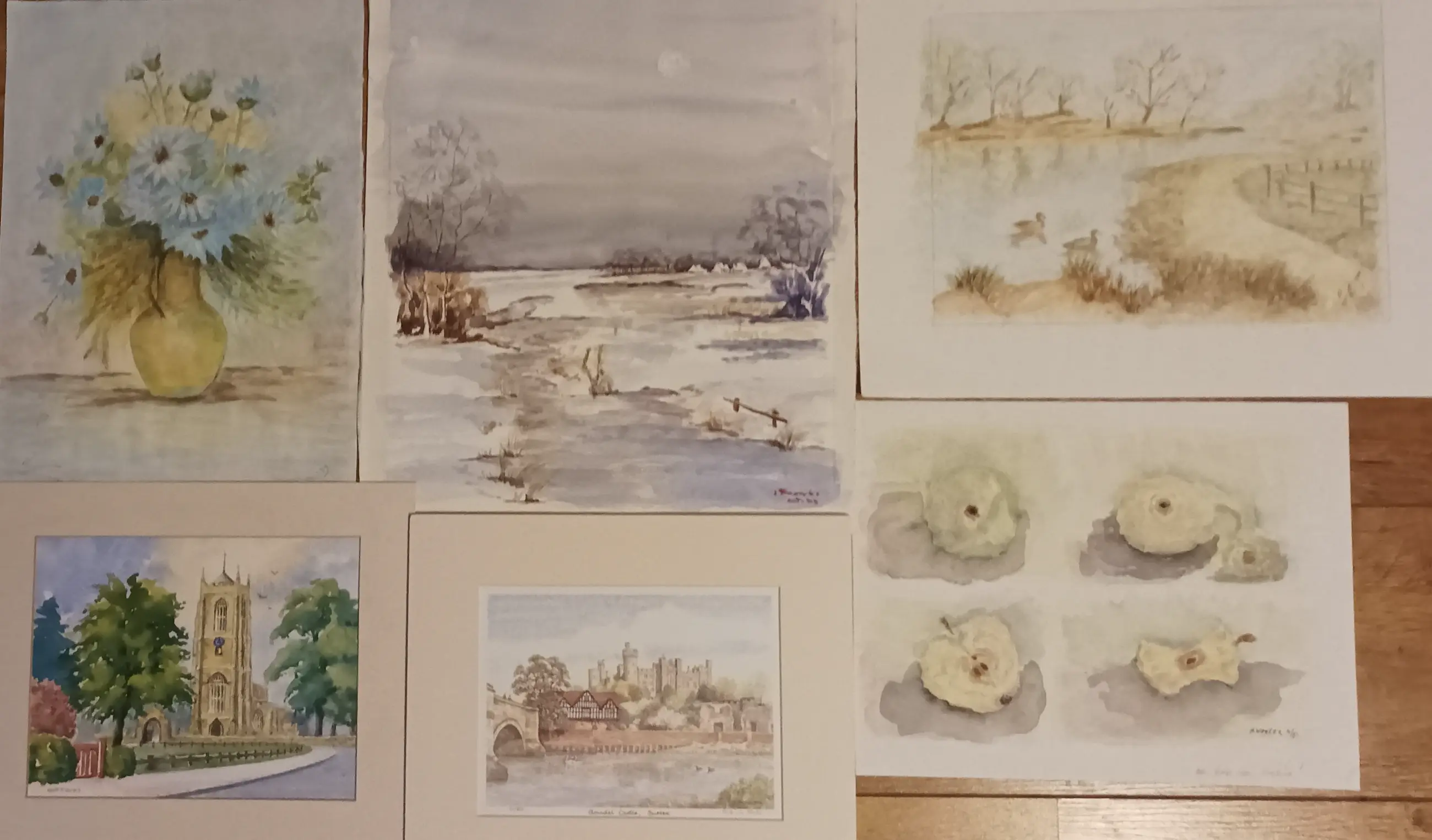 Zes Aquarellen Franks oct.03 Polderlandschap niet ingelijst zonder passe-partout 40 x 35cm. Niet leesbaar Vaas met bloemen niet ingelijst zonder passe-partout 36x26cm. M Cocks Engels Kerkgebouw niet ingelijst wel met passe-partout 30x26cm. Onleesbaar Herftslandschap niet ingelijst zonder passe-partout 40x30cm. H.Wester Afgekloven appel Niet ingelijst geen passe-partout 32x25cm. Patricia Hall Arundel Castle Sussex niet ingelijst wel passe-partout 30x25 c