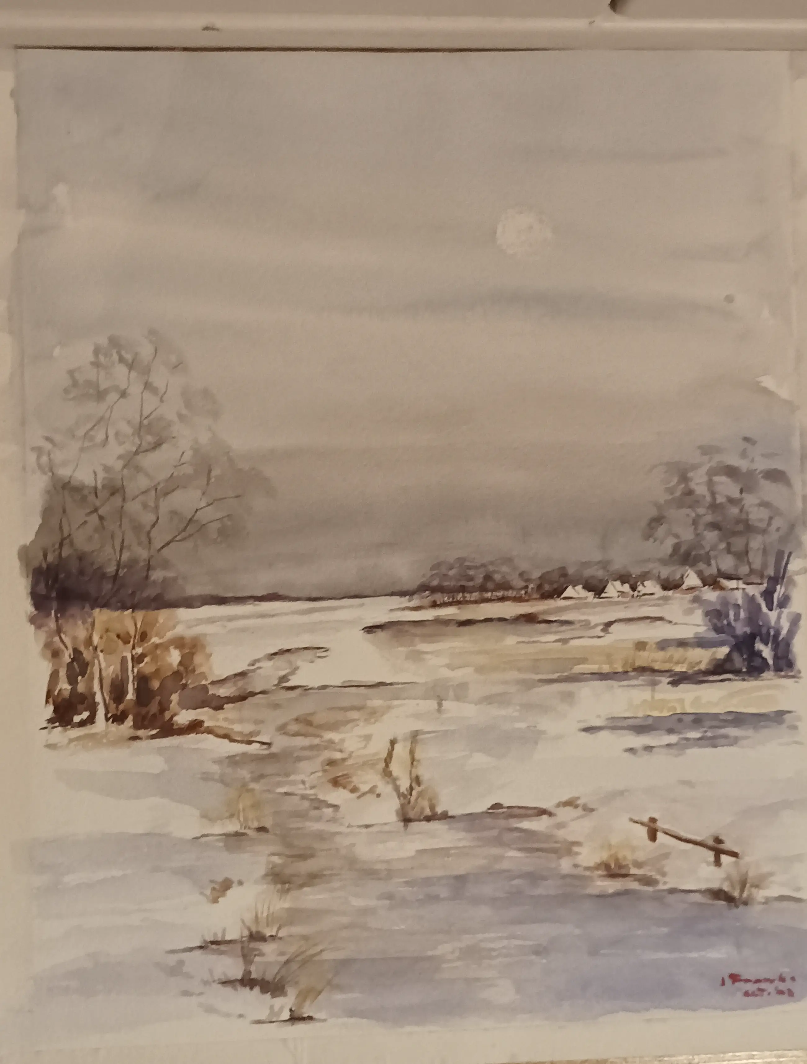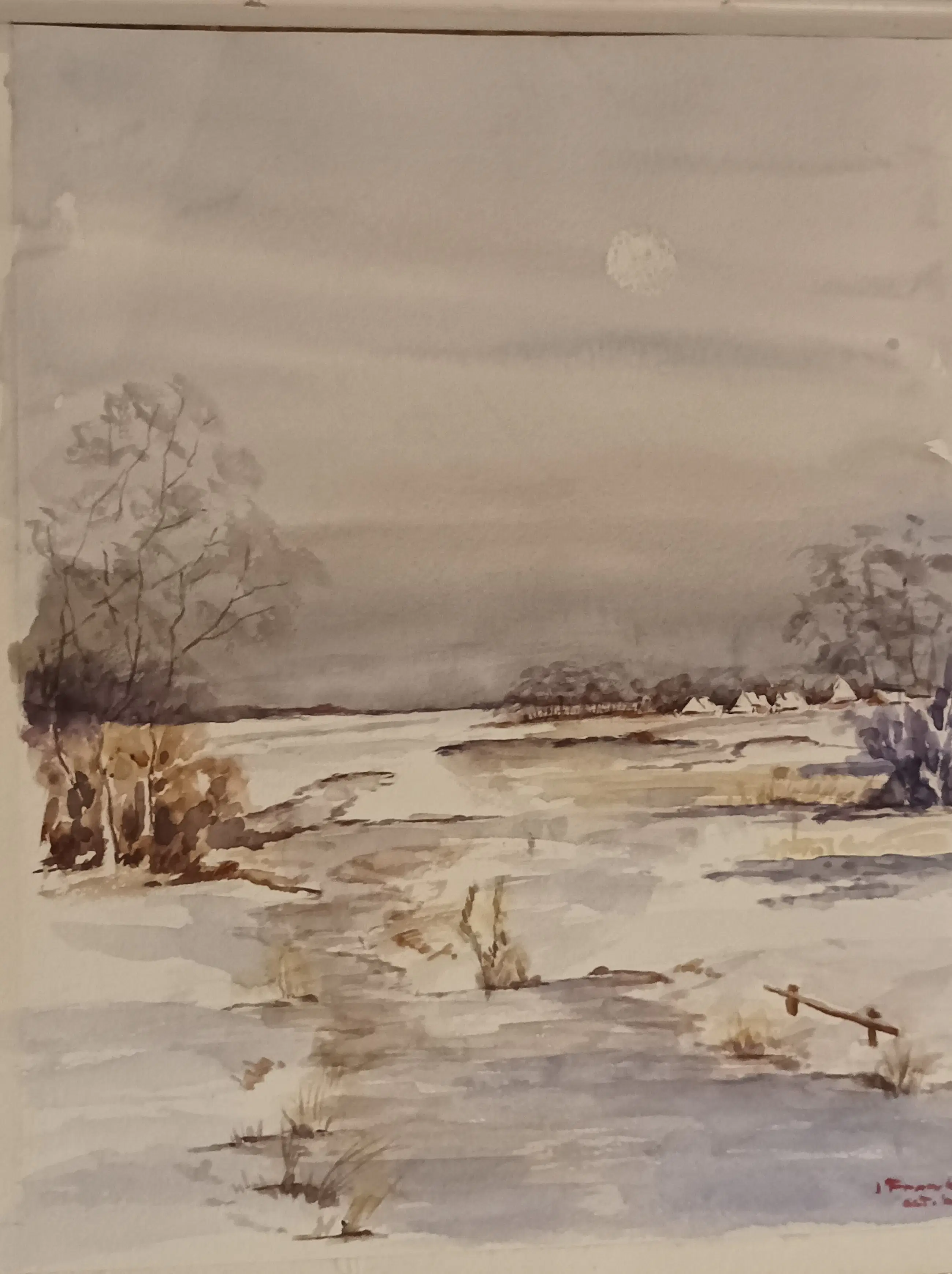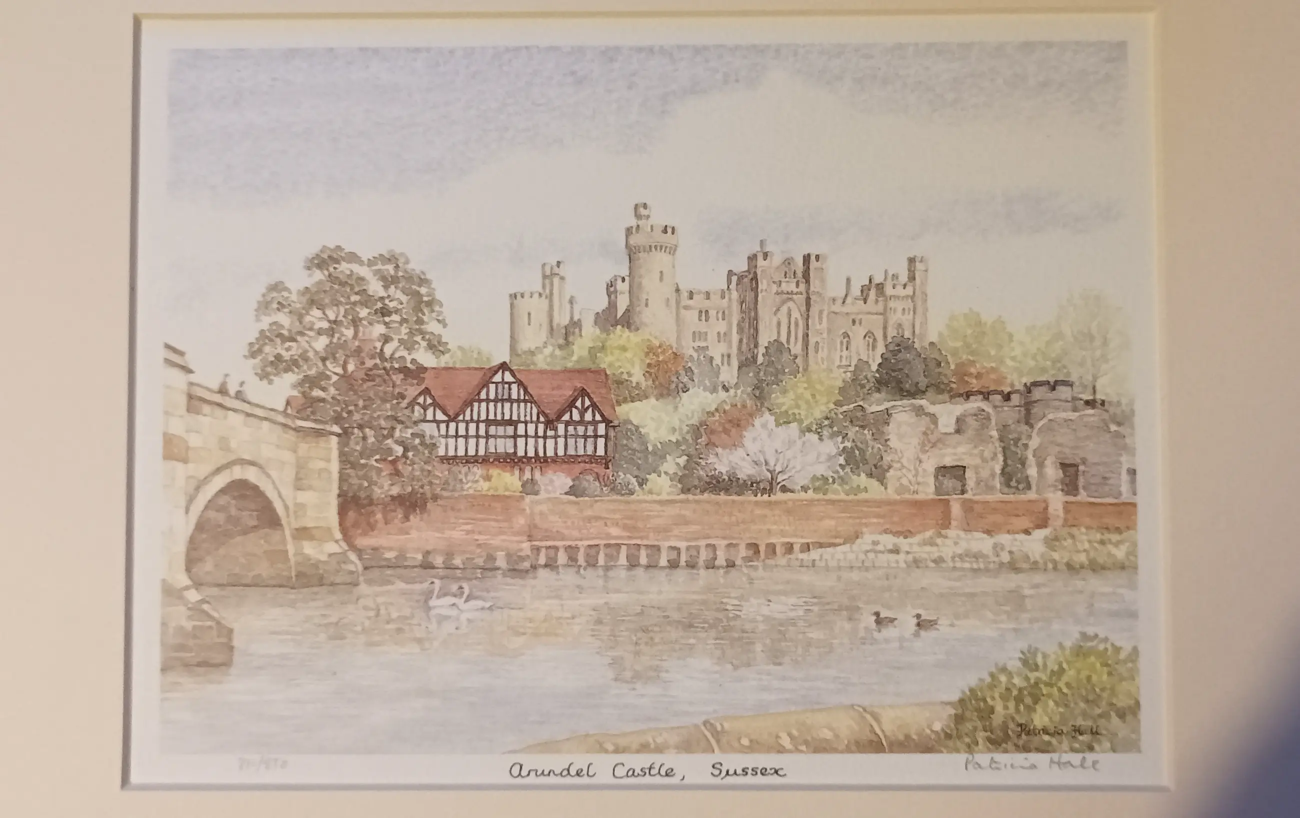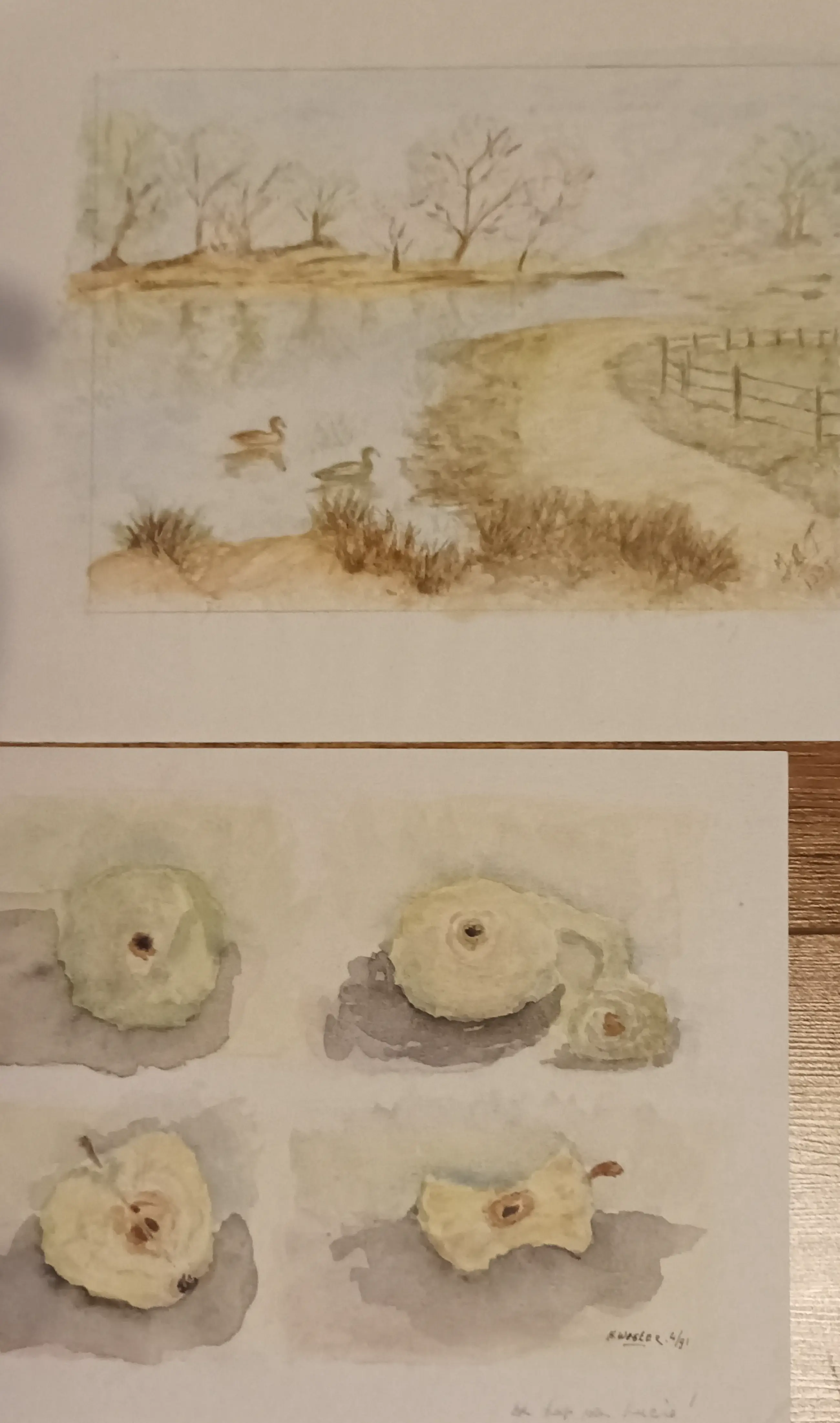 Zes Aquarellen Franks oct.03 Polderlandschap niet ingelijst zonder passe-partout 40 x 35cm. Niet leesbaar Vaas met bloemen niet ingelijst zonder passe-partout 36x26cm. M Cocks Engels Kerkgebouw niet ingelijst wel met passe-partout 30x26cm. Onleesbaar Herftslandschap niet ingelijst zonder passe-partout 40x30cm. H.Wester Afgekloven appel Niet ingelijst geen passe-partout 32x25cm. Patricia Hall Arundel Castle Sussex niet ingelijst wel passe-partout 30x25 c