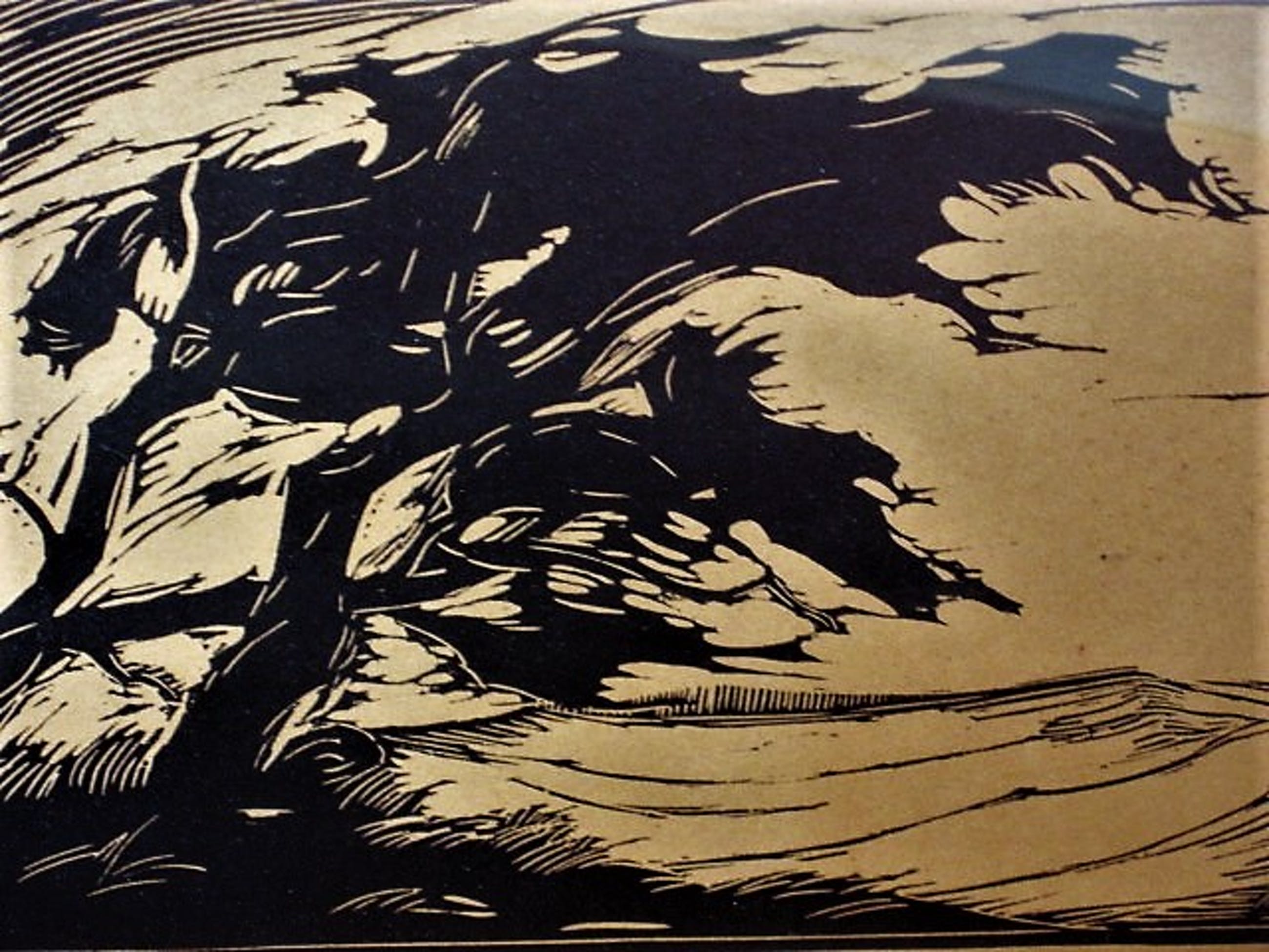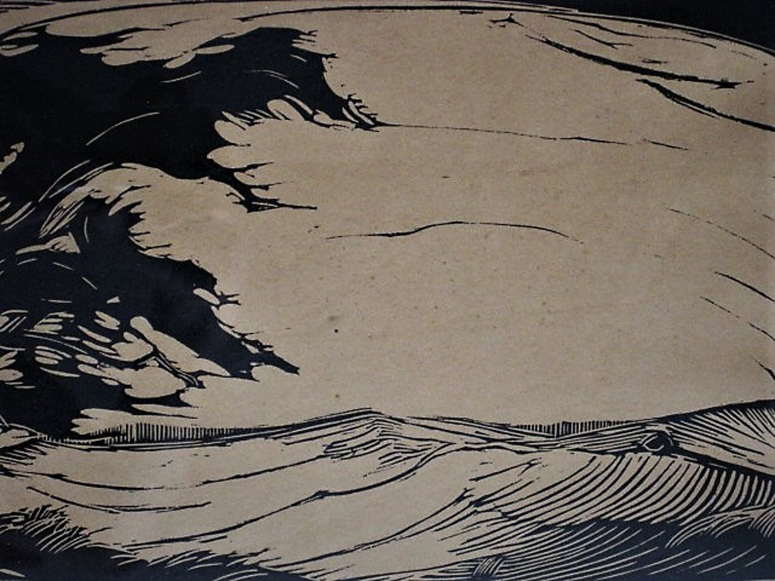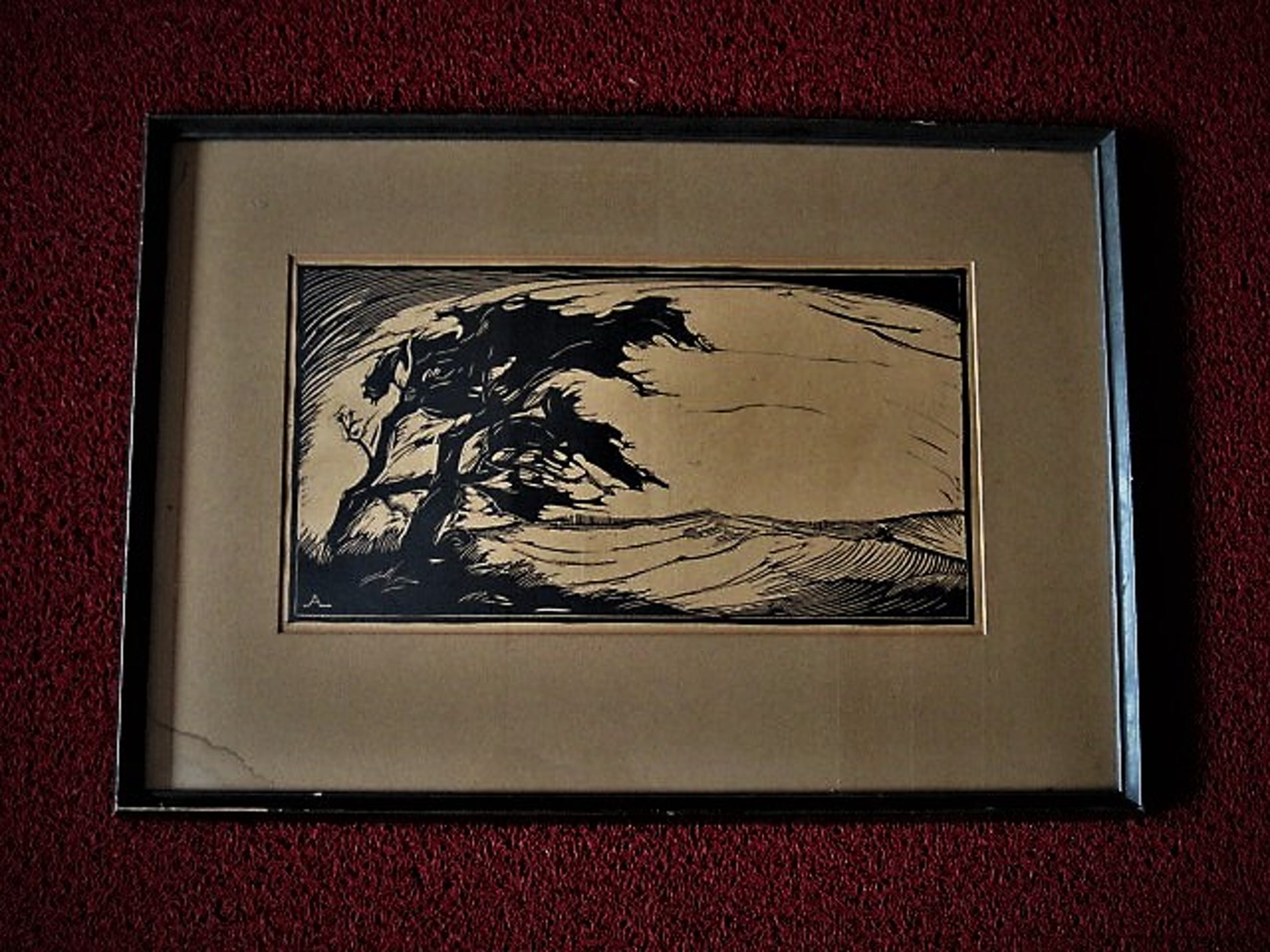 Het omliggende passe partout is wat verkleurd en vochtkring linksonder . Houtsnede en lijst in goede staat.
