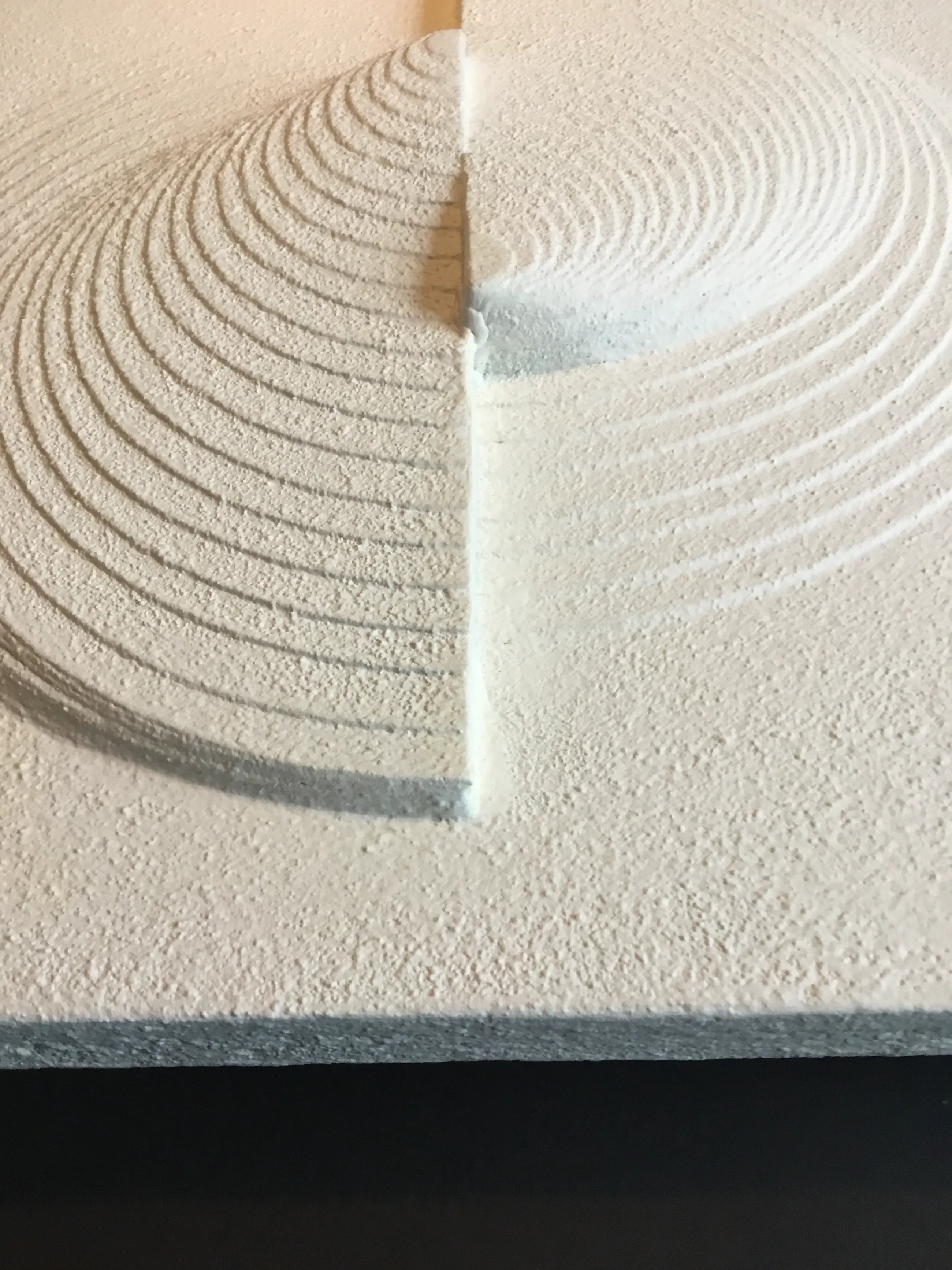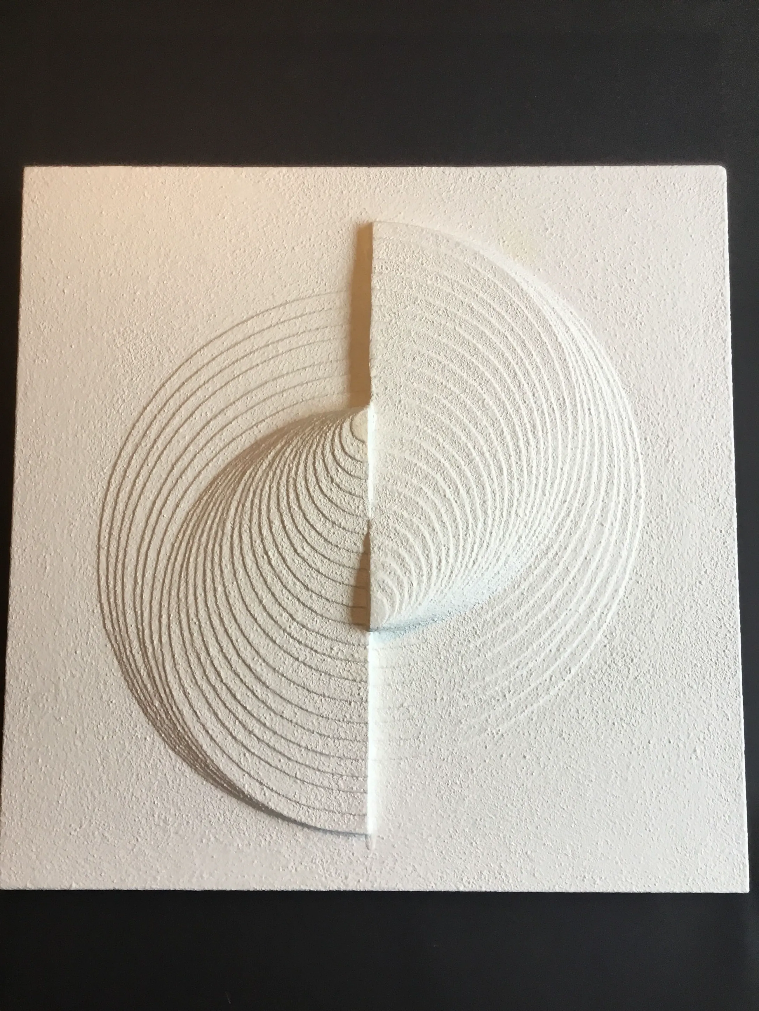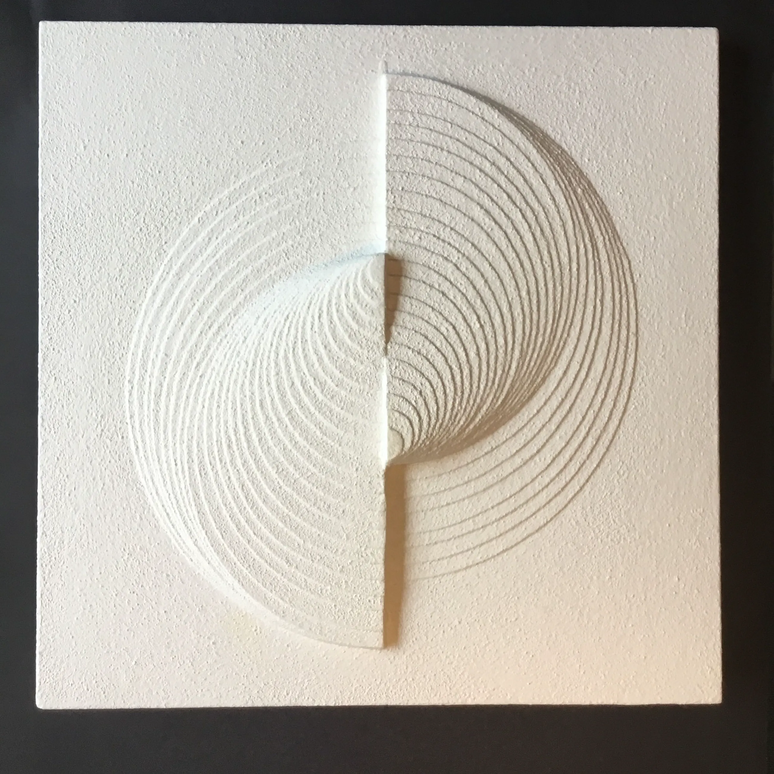 Het paneel is opgebouwd uit lagen houtfineer die wit geschilderd zijn. Het unieke werk geeft bij lichtval bijzondere shaduwlijnen.
