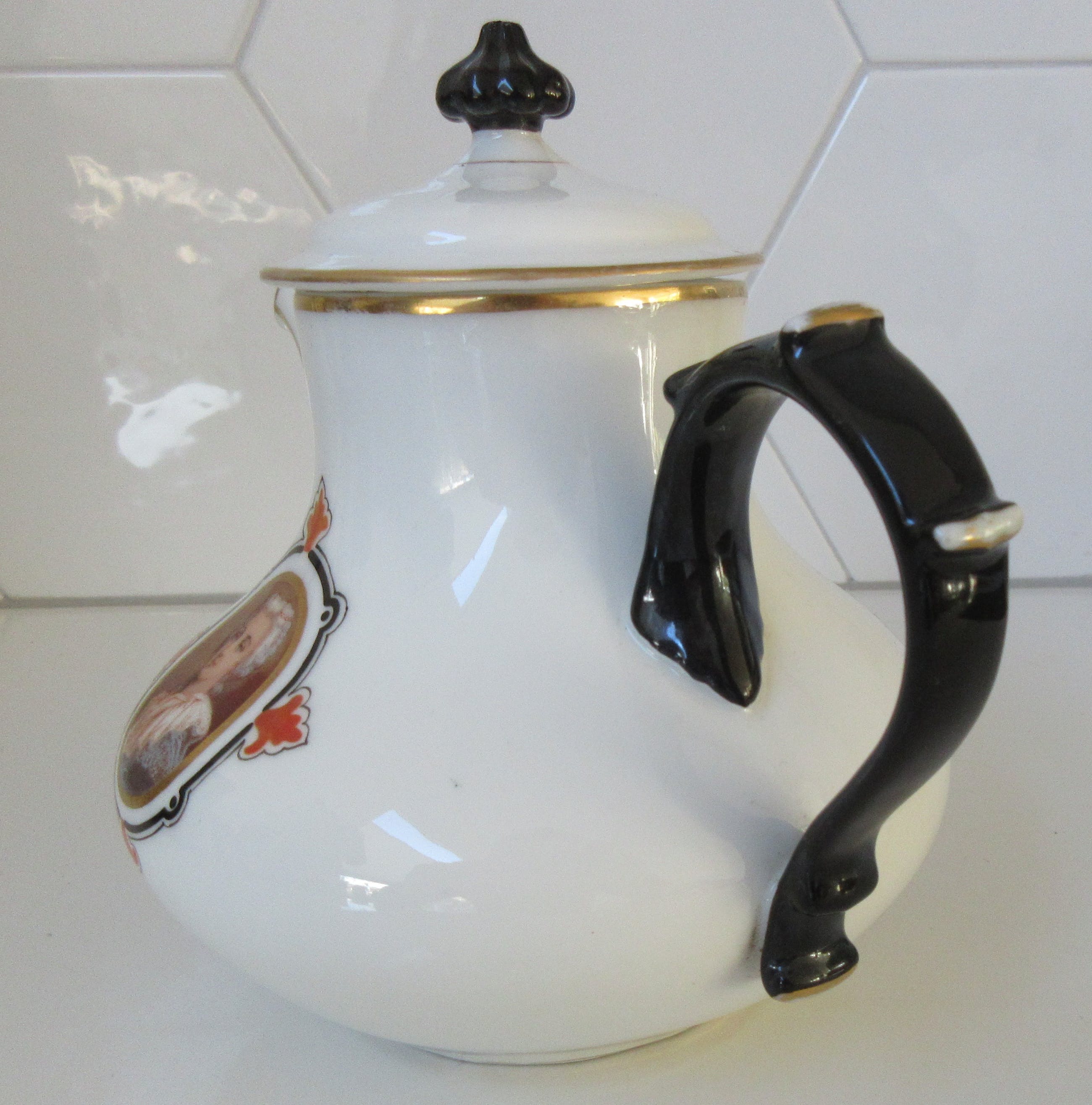 Mooie antieke Vieux Paris porseleinen theepot in directoire stijl voorzien van vergulde decoratie, zwarte knop en twee transfer afbeeldingen van Franse dames welke omlijst met zwarte en oranje decoratie. Niet gemerkt. De deksel heeft helaas een chipje aan de onderzijde en er is een klein van het knopje van de sluiting van de deksel af