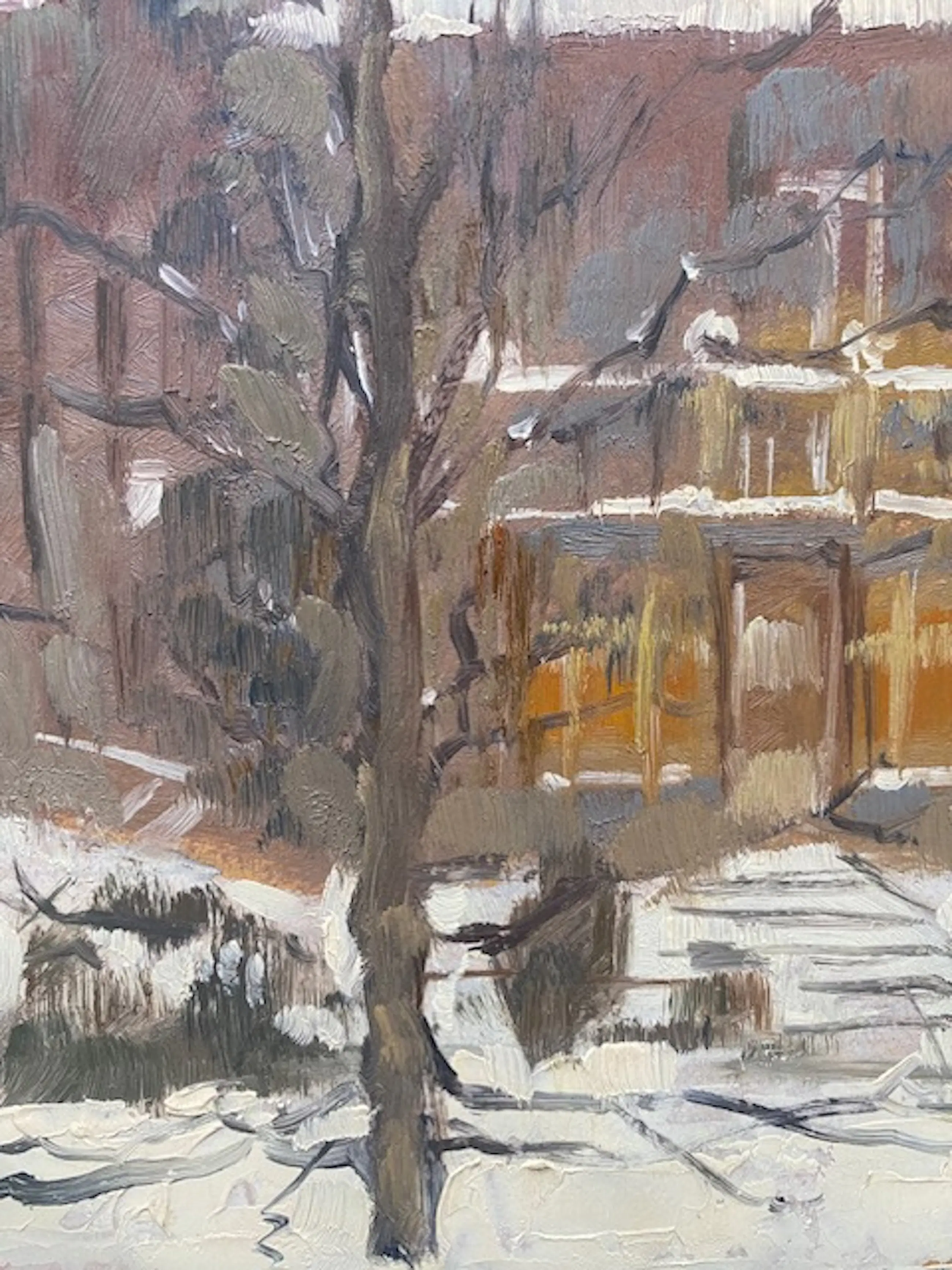 impressionistisch schilderij van een villa in de winter, moet nog naar believen ingelijst worden