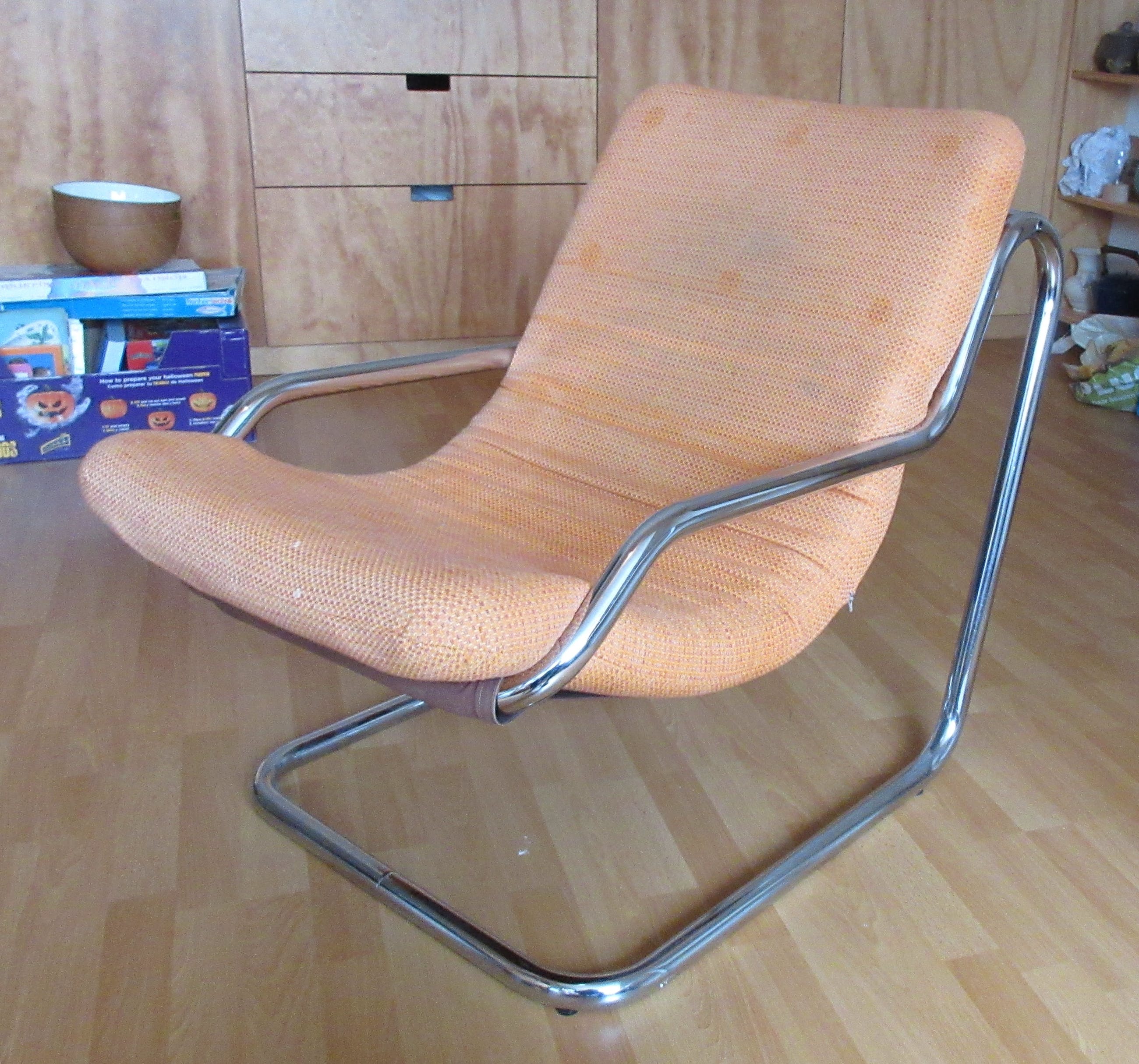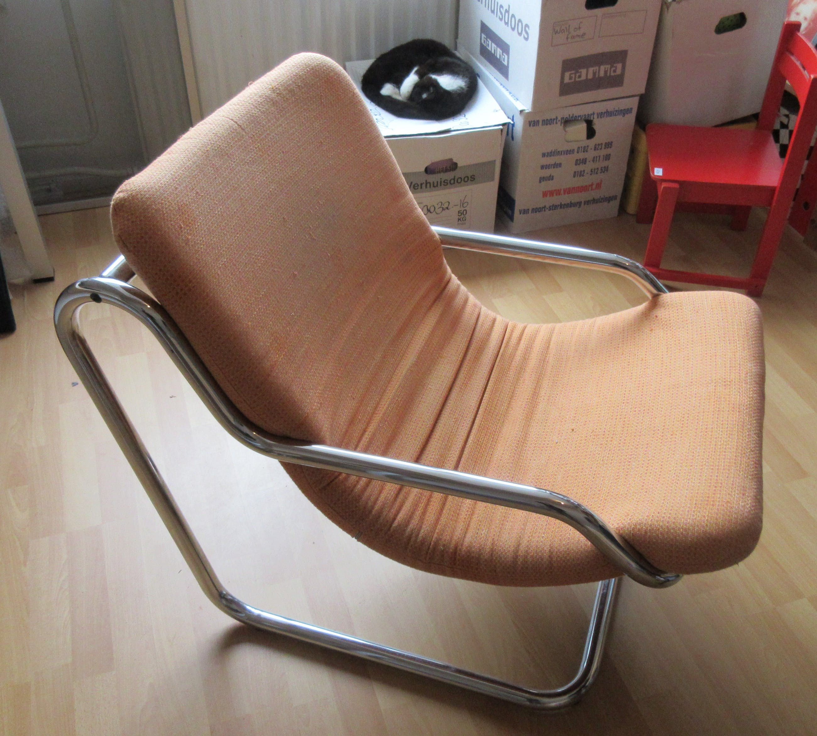 Vintage Buisframe fauteuil met stoffen zitting in goede gebruikte conditie. De zitting is los van het frame en de hoes is afritsbaar en dus ook wasbaar. De hoes is niet versleten of heeft gaten, maar is wel wat stoffig en zou goed gereinigd kunnen worden. De stoel is niet gemerkt, maar vermoedelijk van Hollandse of Scandinavische makelij