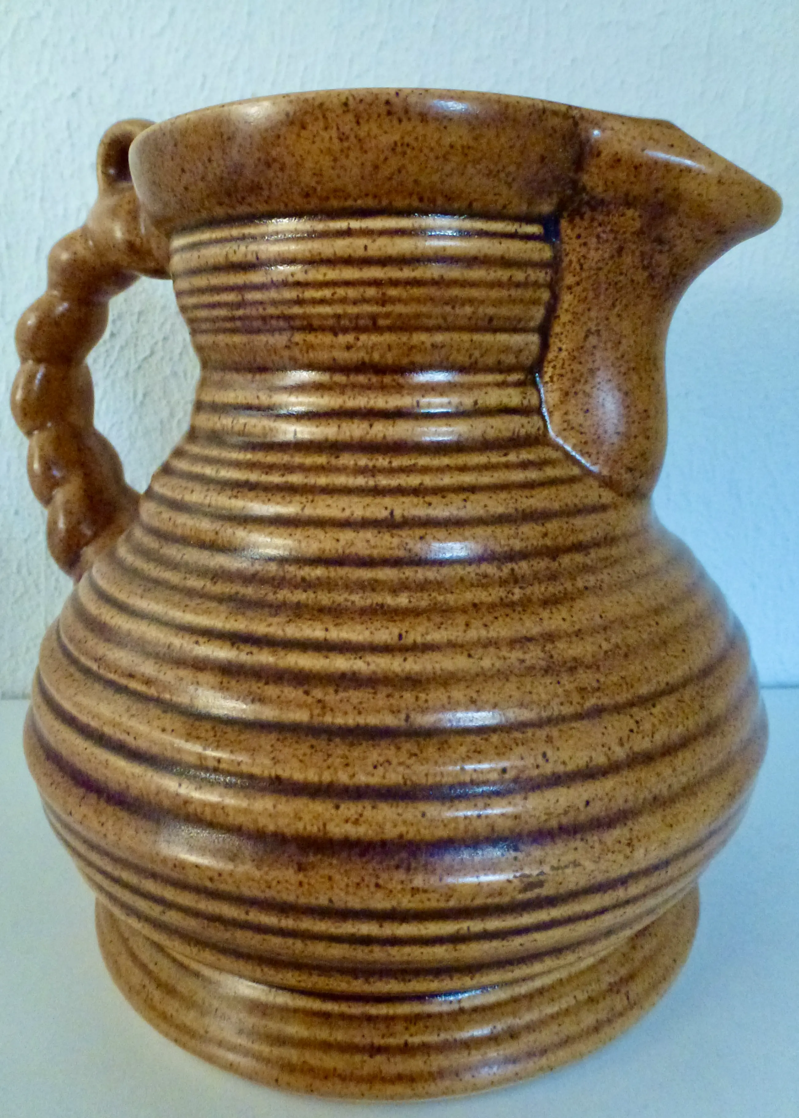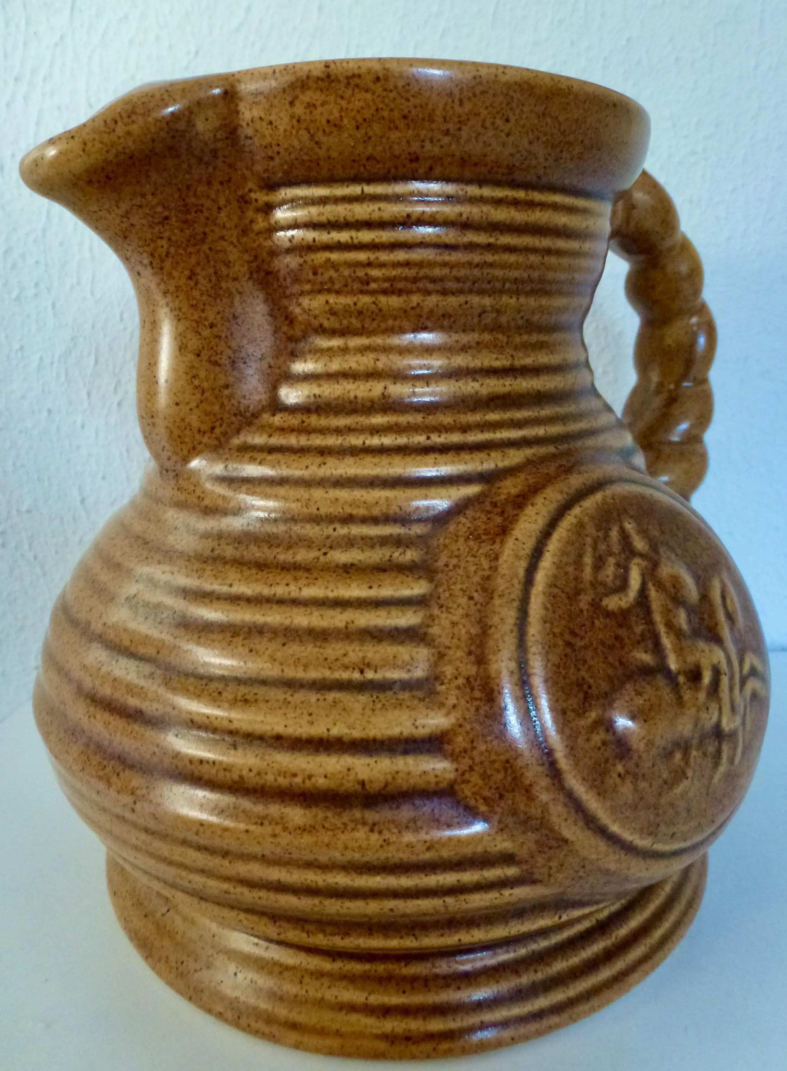 Mooie en grote Vintage Stoneware kruik met vele details, die het handwerk benadrukken dat het karakter geeft.