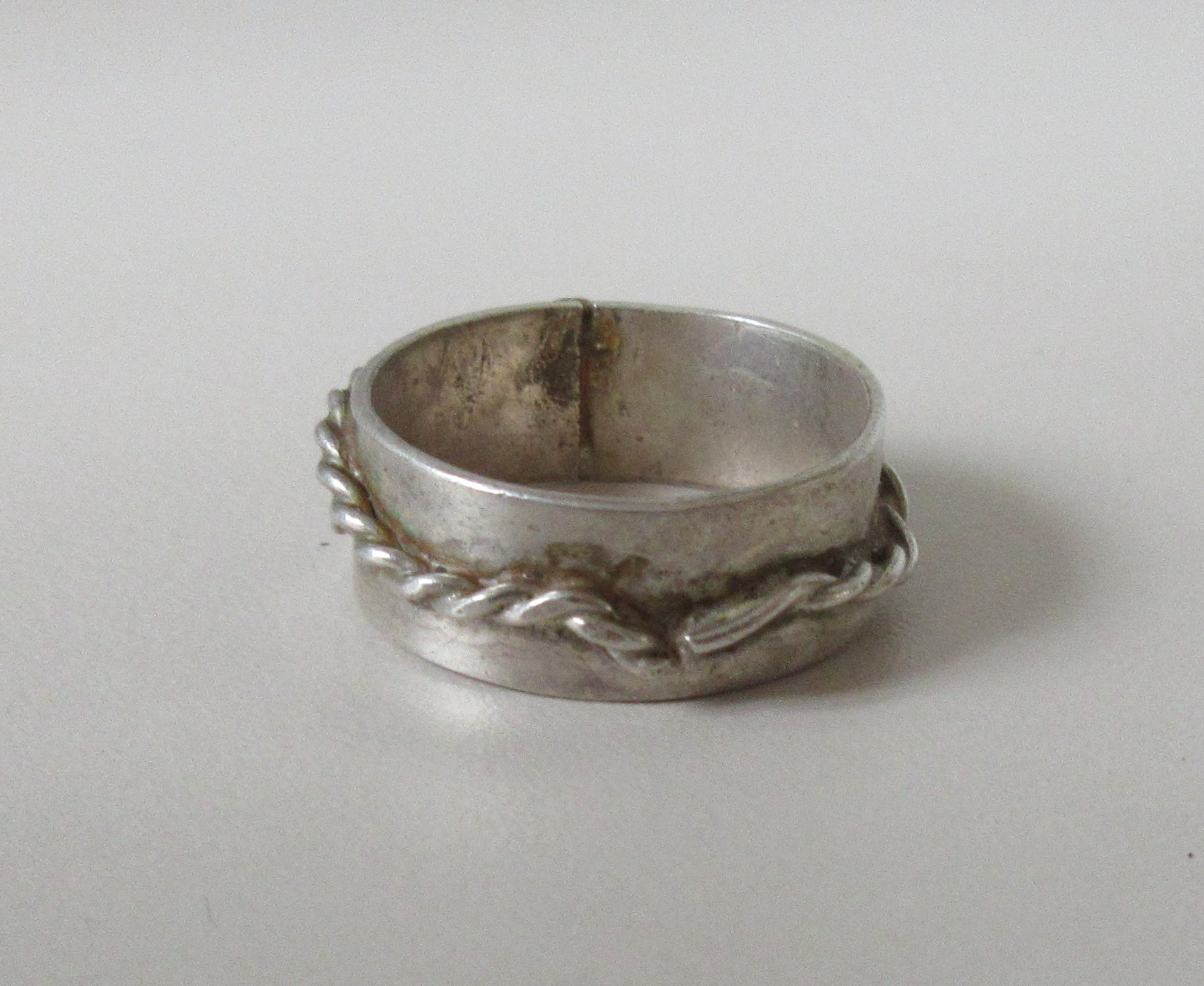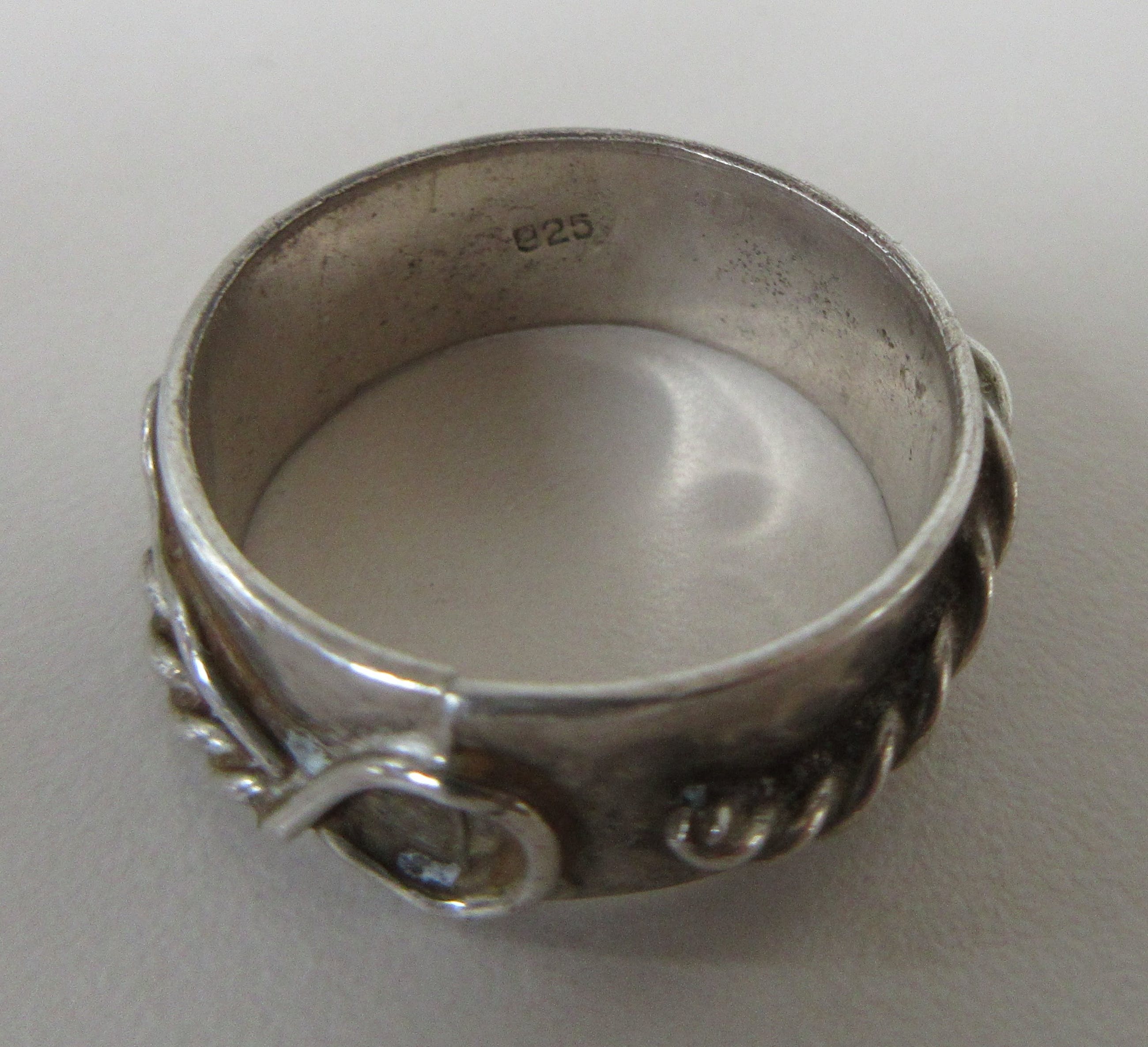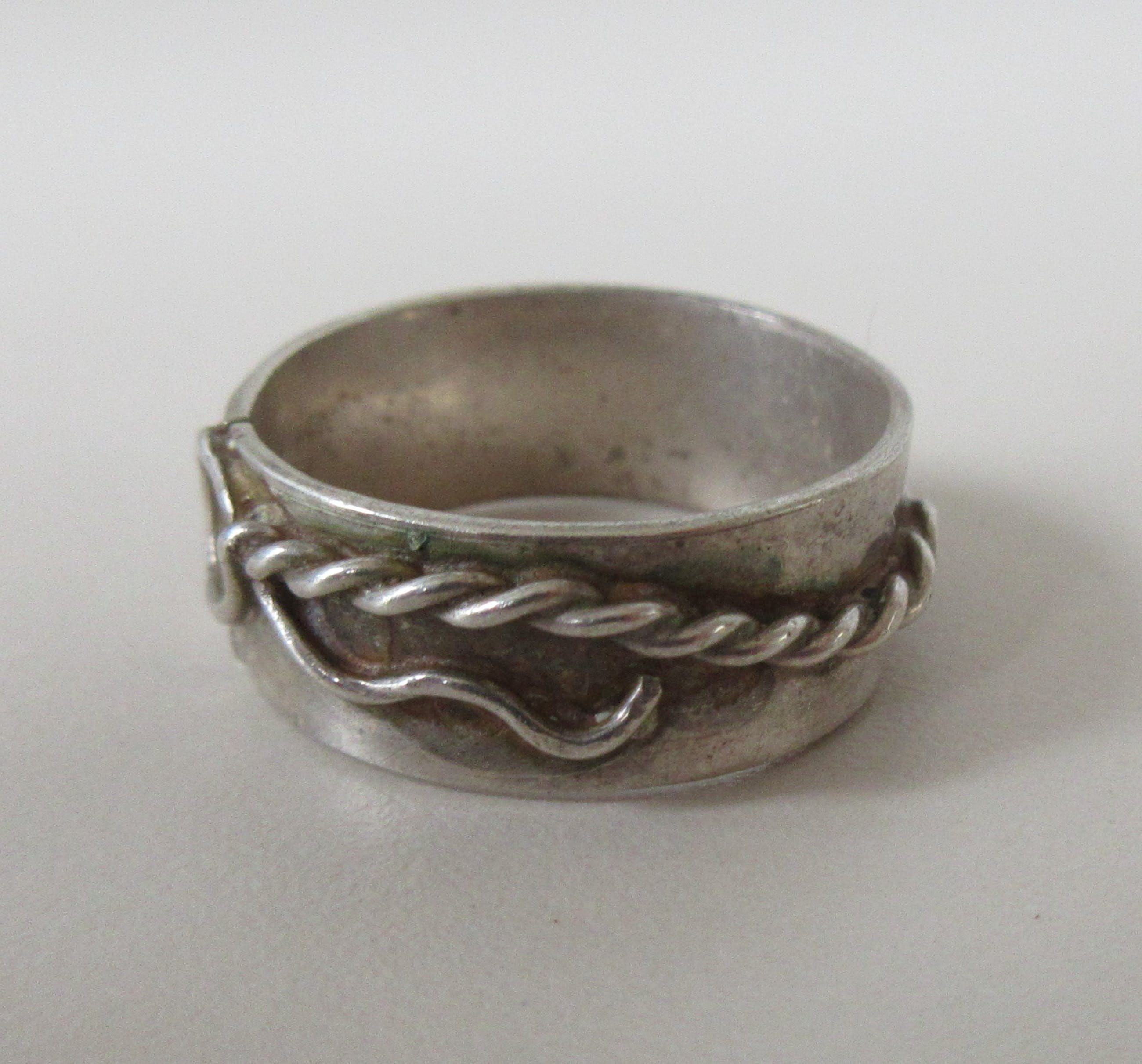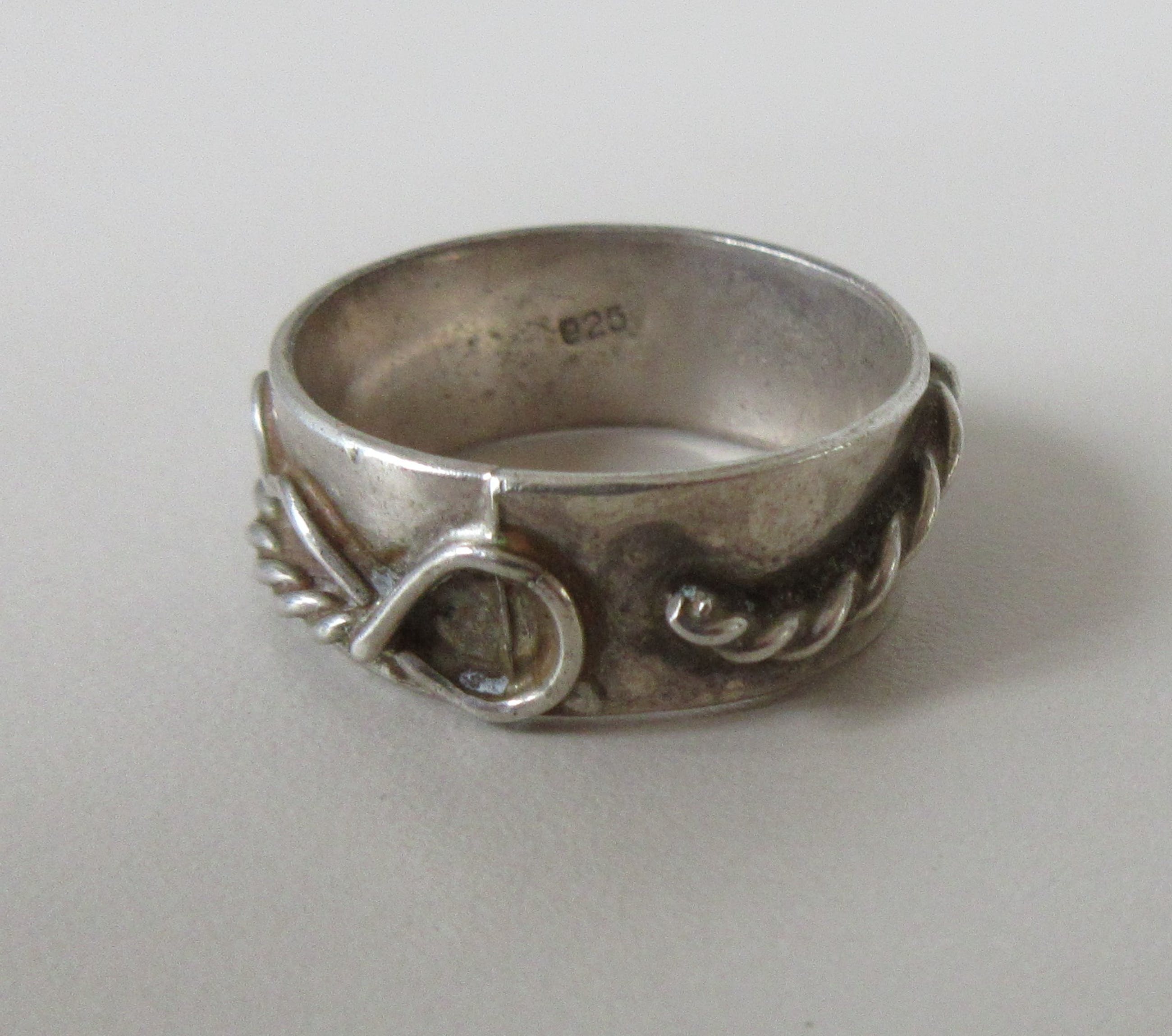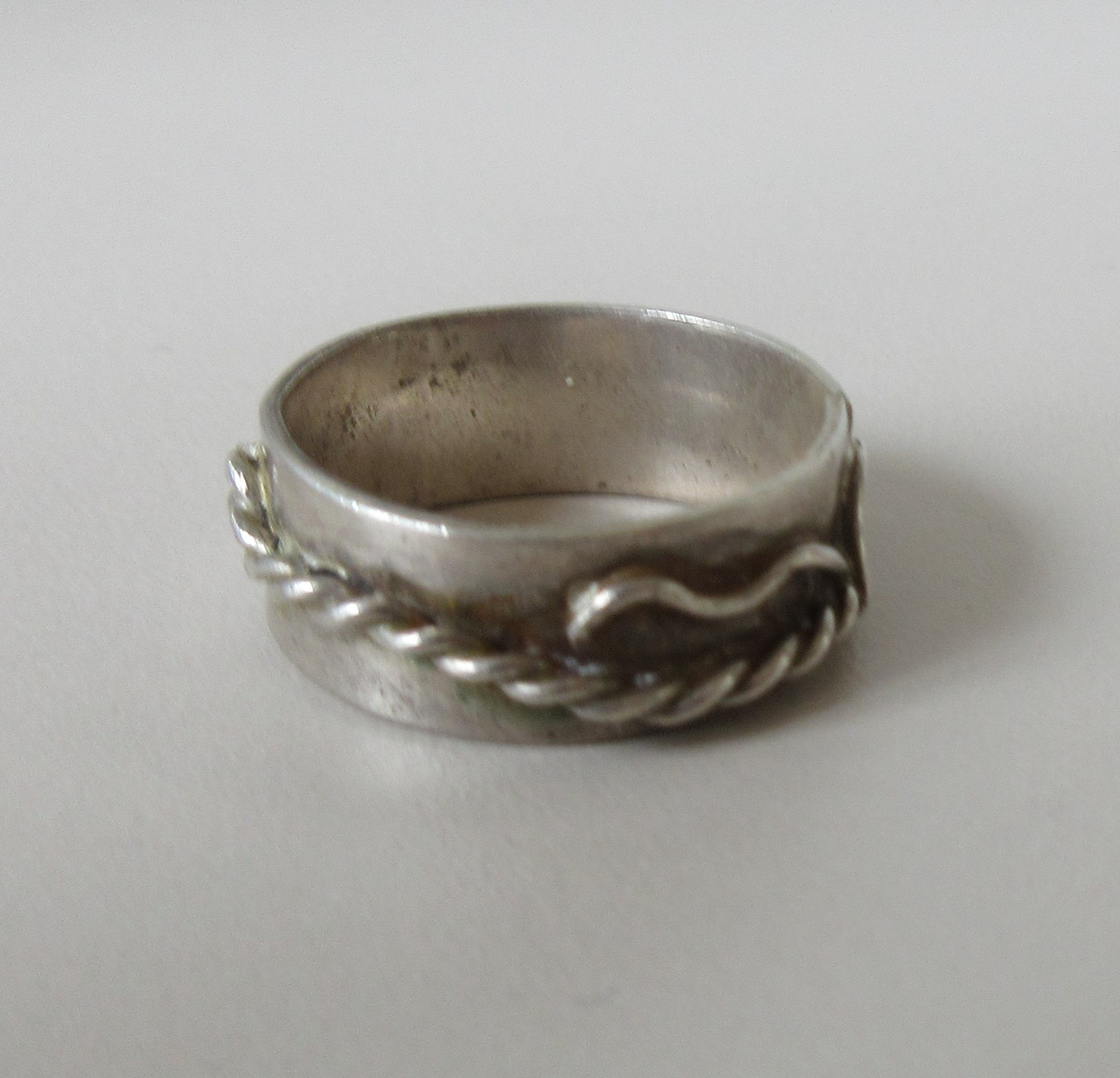 Vintage Studio zilveren ring met opgelegde decoratie van een knoop en een touw. Niet voorzien van een meestermerk maar wel voorzien van een keurmerk (925) aan de binnenzijde. Ringmaat 7,5, de diameter van de ring is ca. 17 mm.