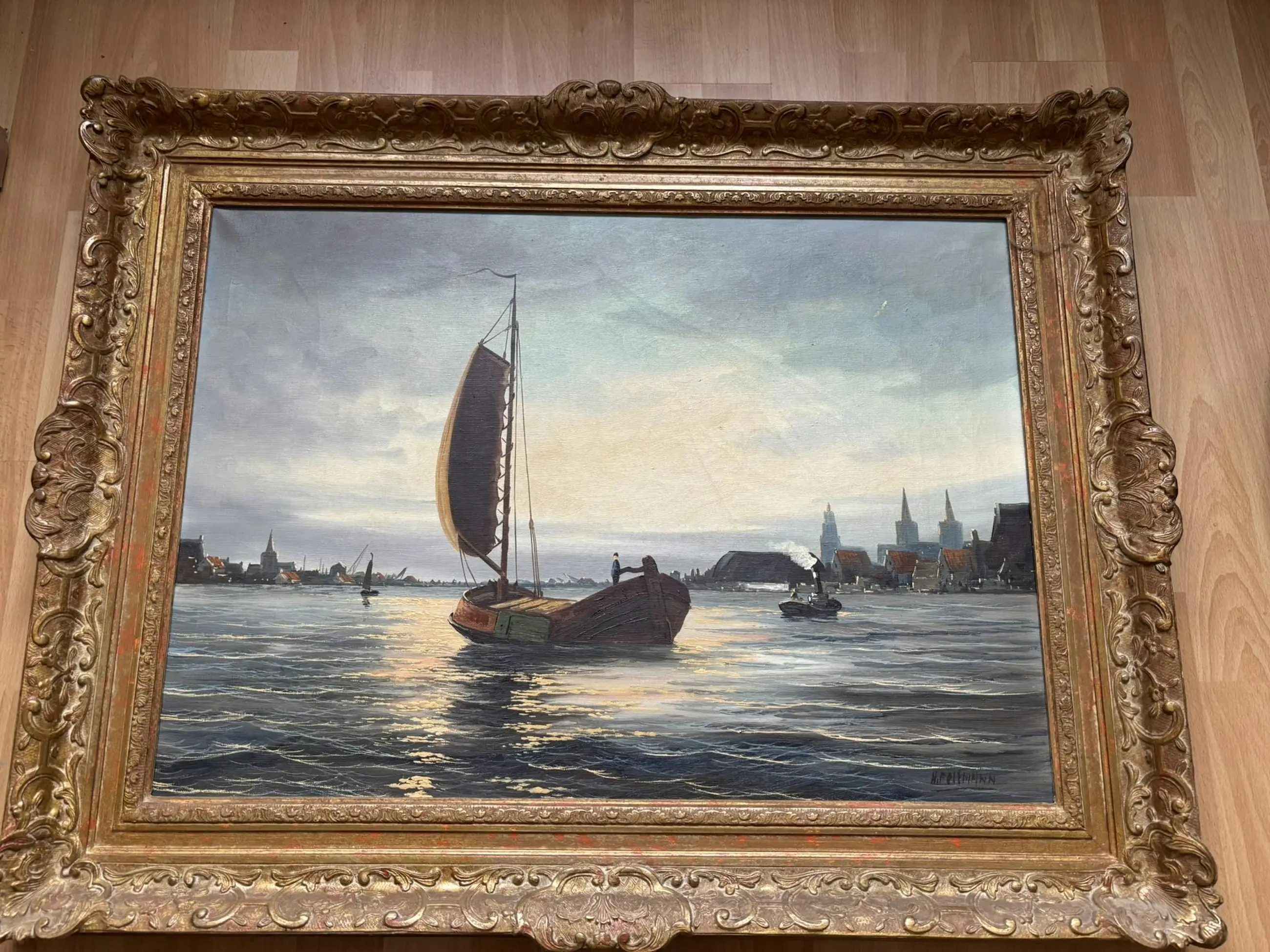 Onbekend - Vissersboot op water, achtergron dorp zichtbaar