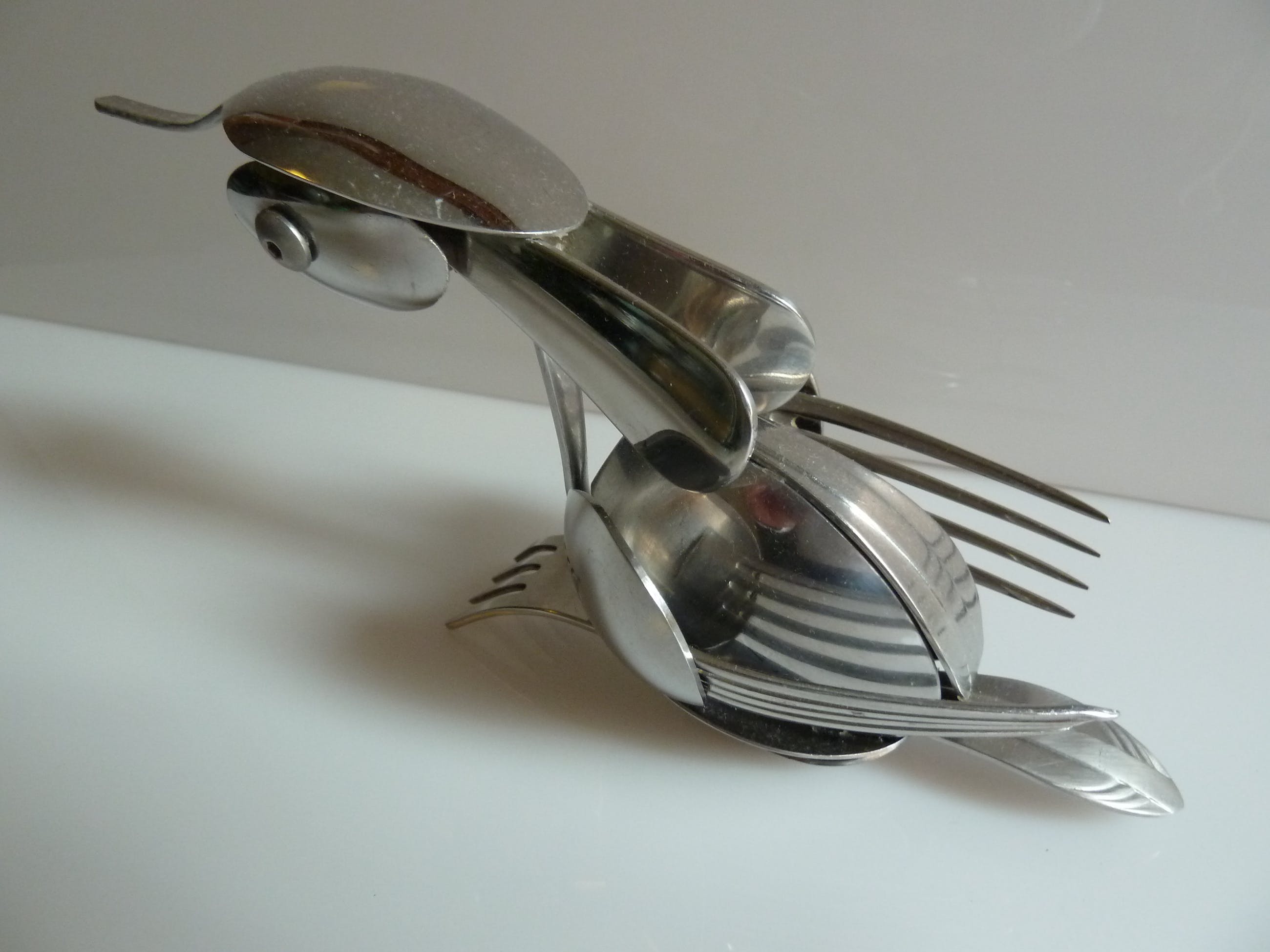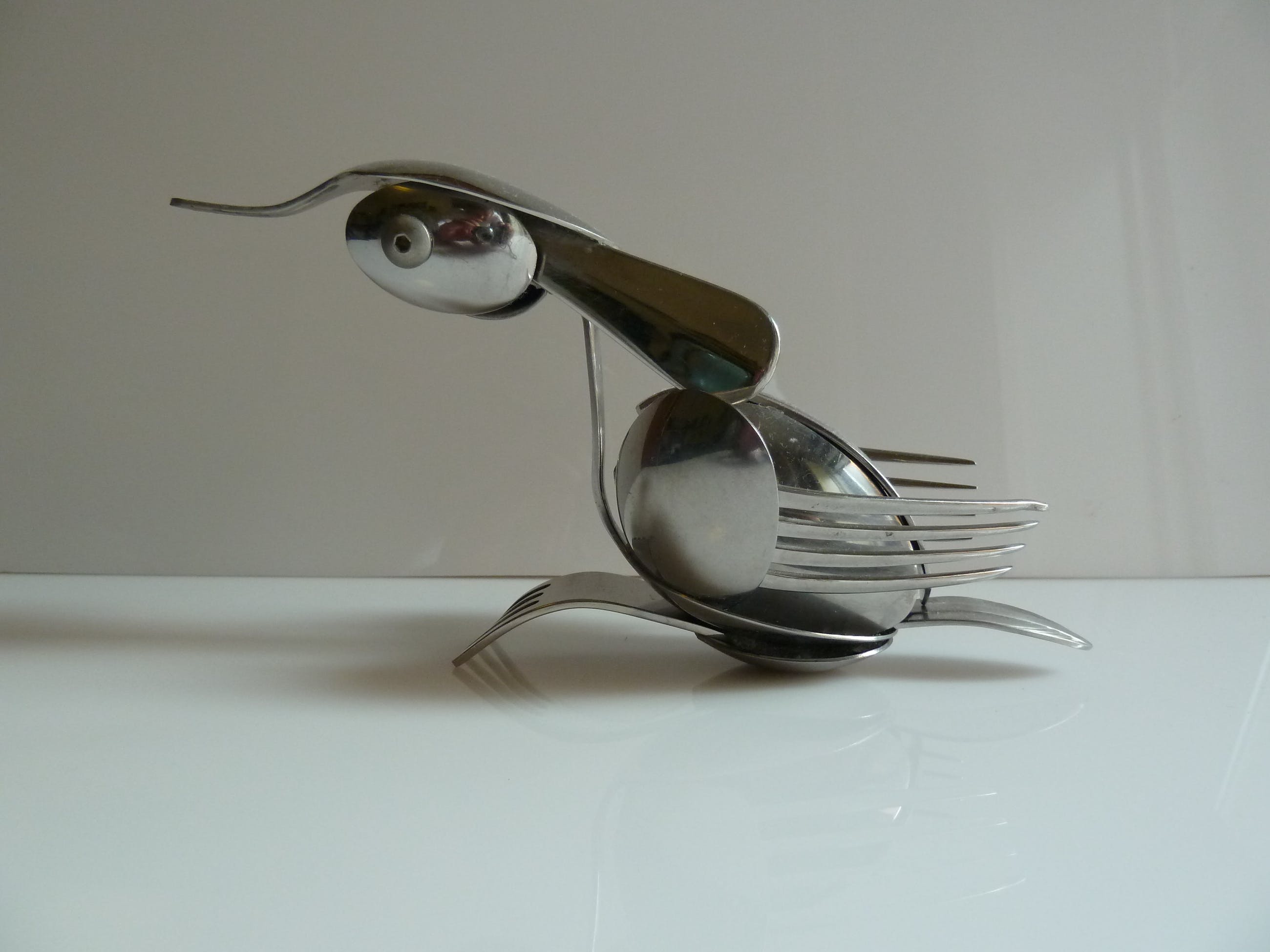 Vogelsculpture gemaakt van bestek Gebruikt bestek krijgt tweede leven. Kunstig vormgegeven object, met de hand vervaardigd en uniek. Afmetingen: L22cm x H10cm