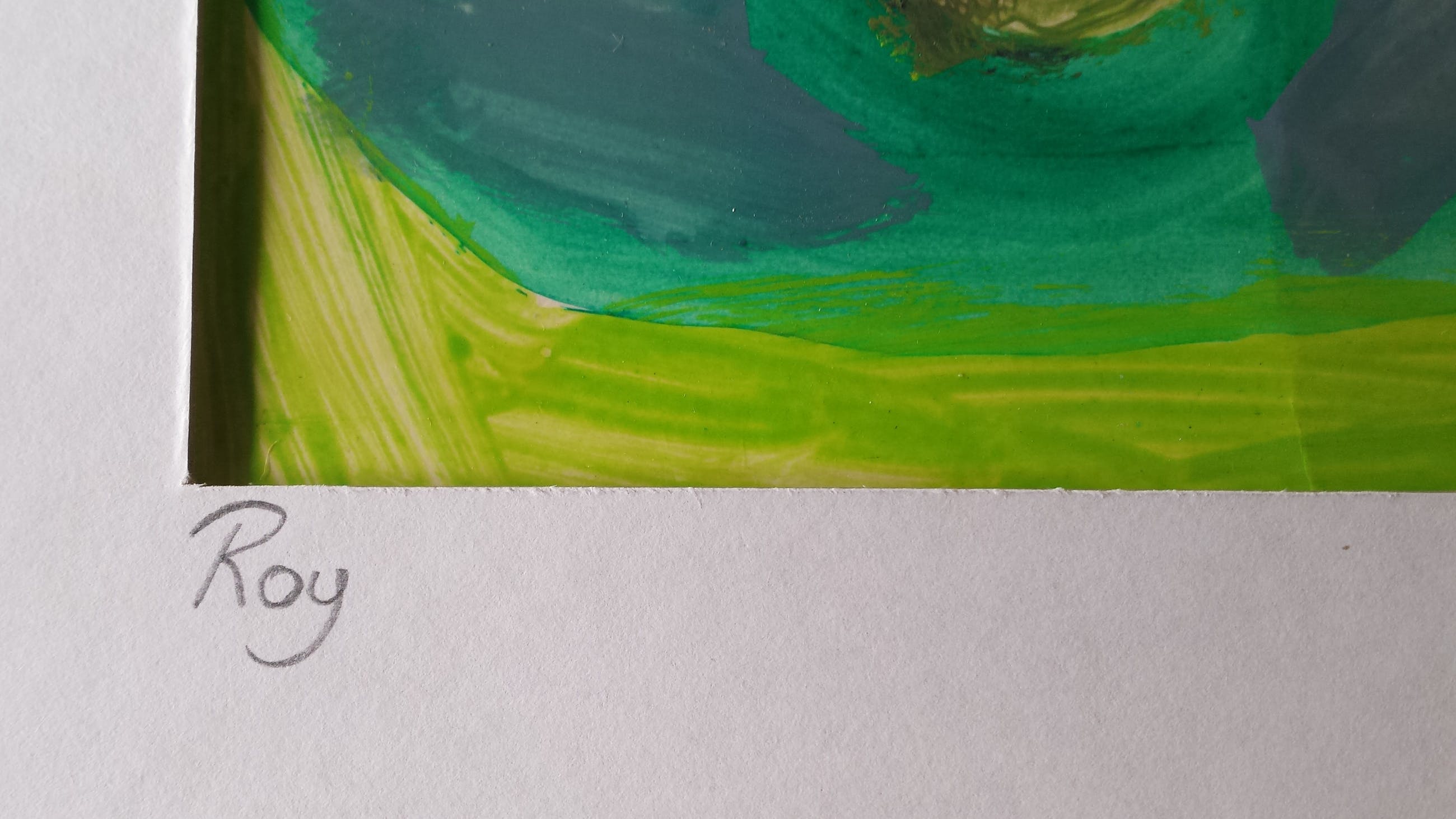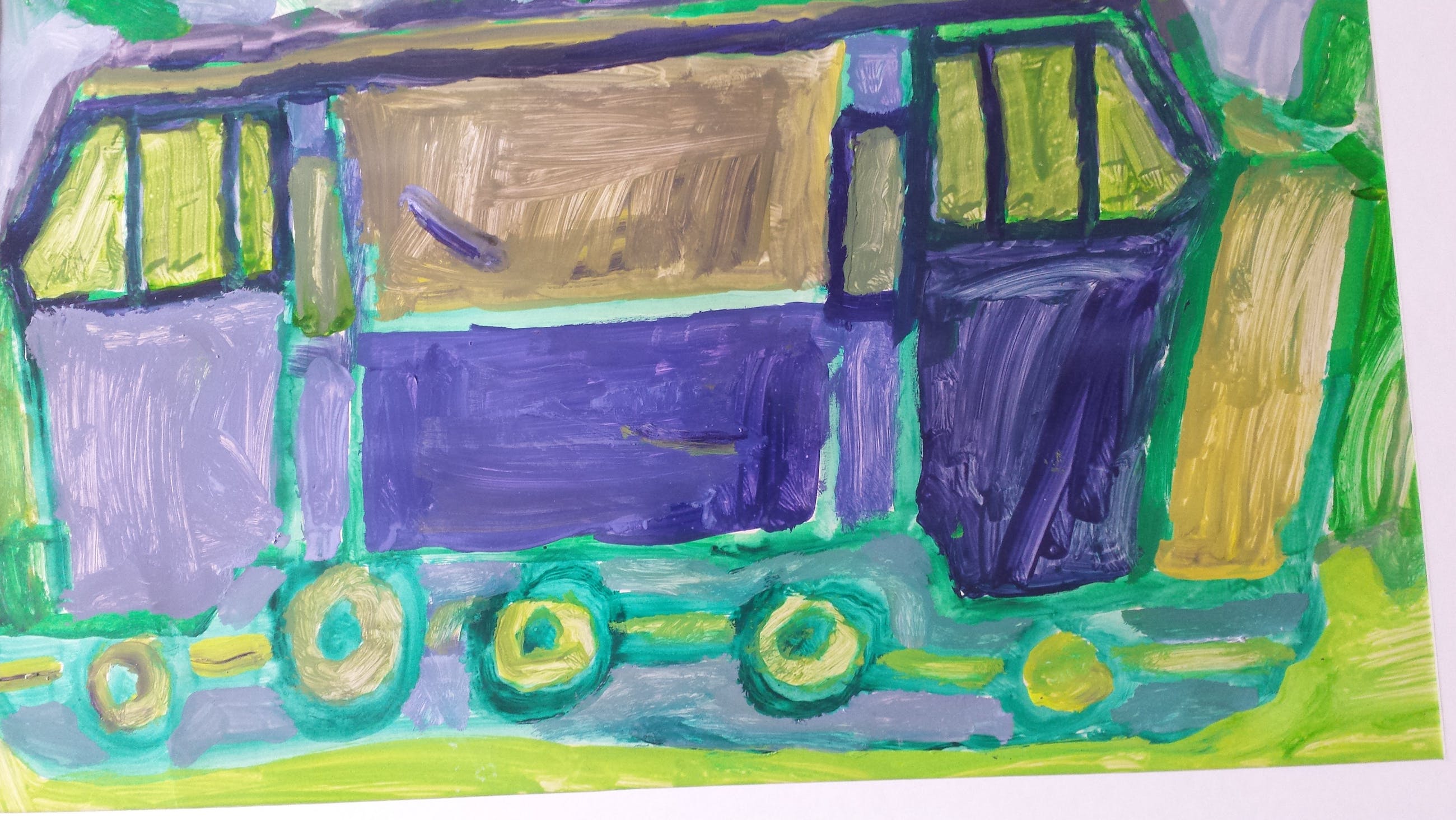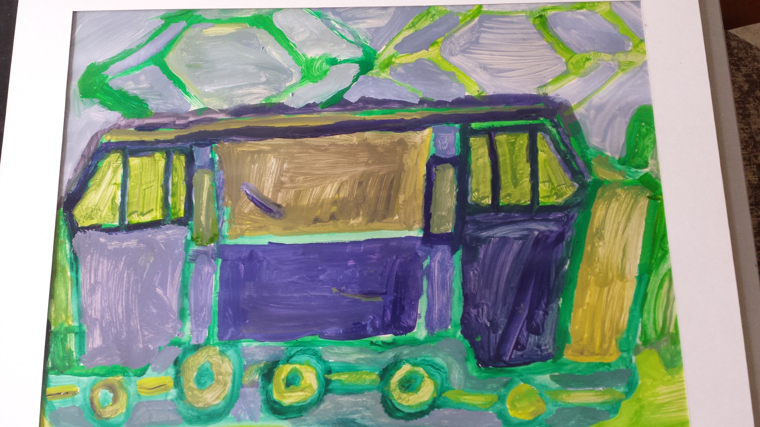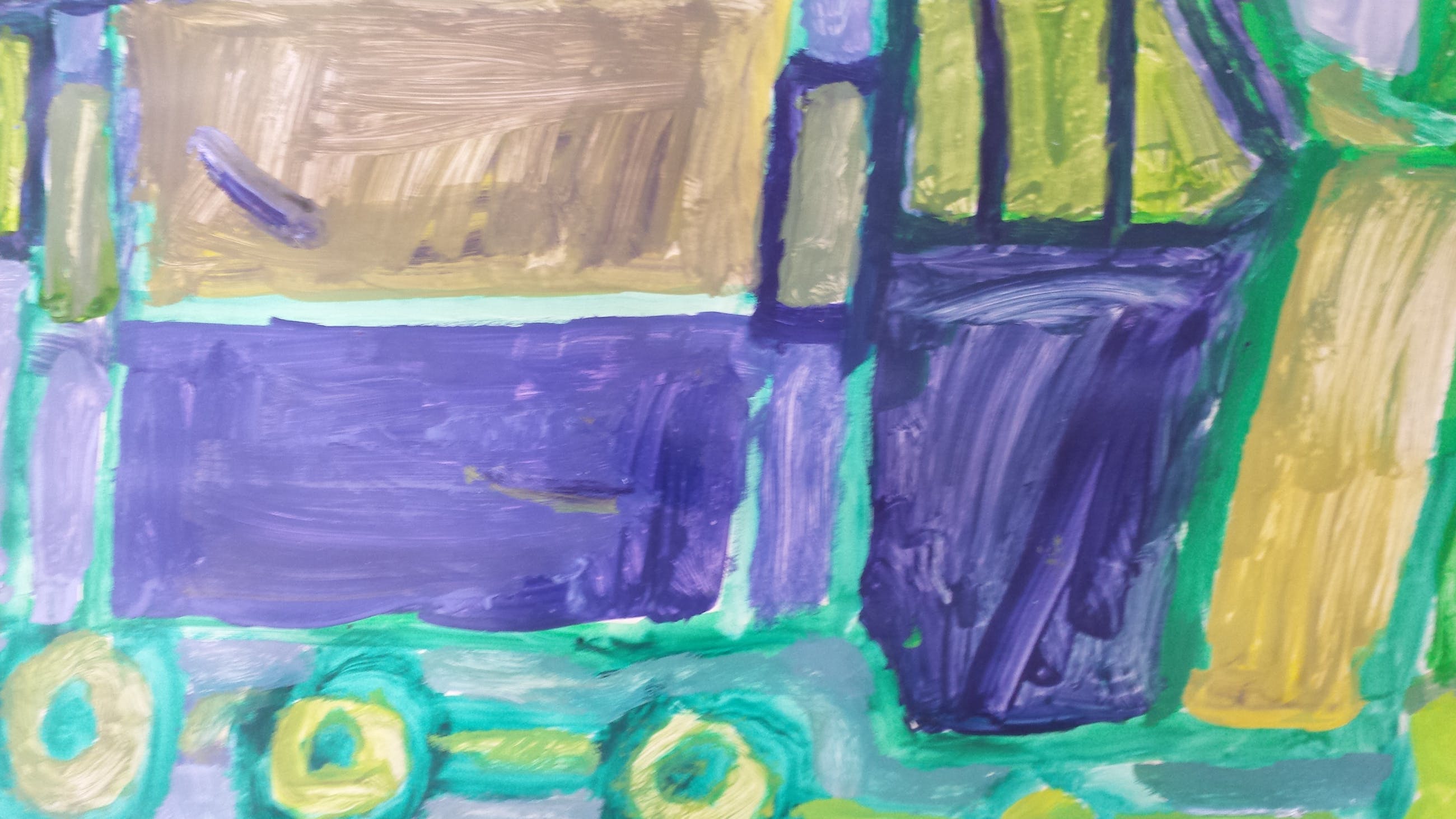 Het is een schilderij gemaakt door een verstandelijk gehandicapte man. Hij is o.a. gefascineerd door treinen.