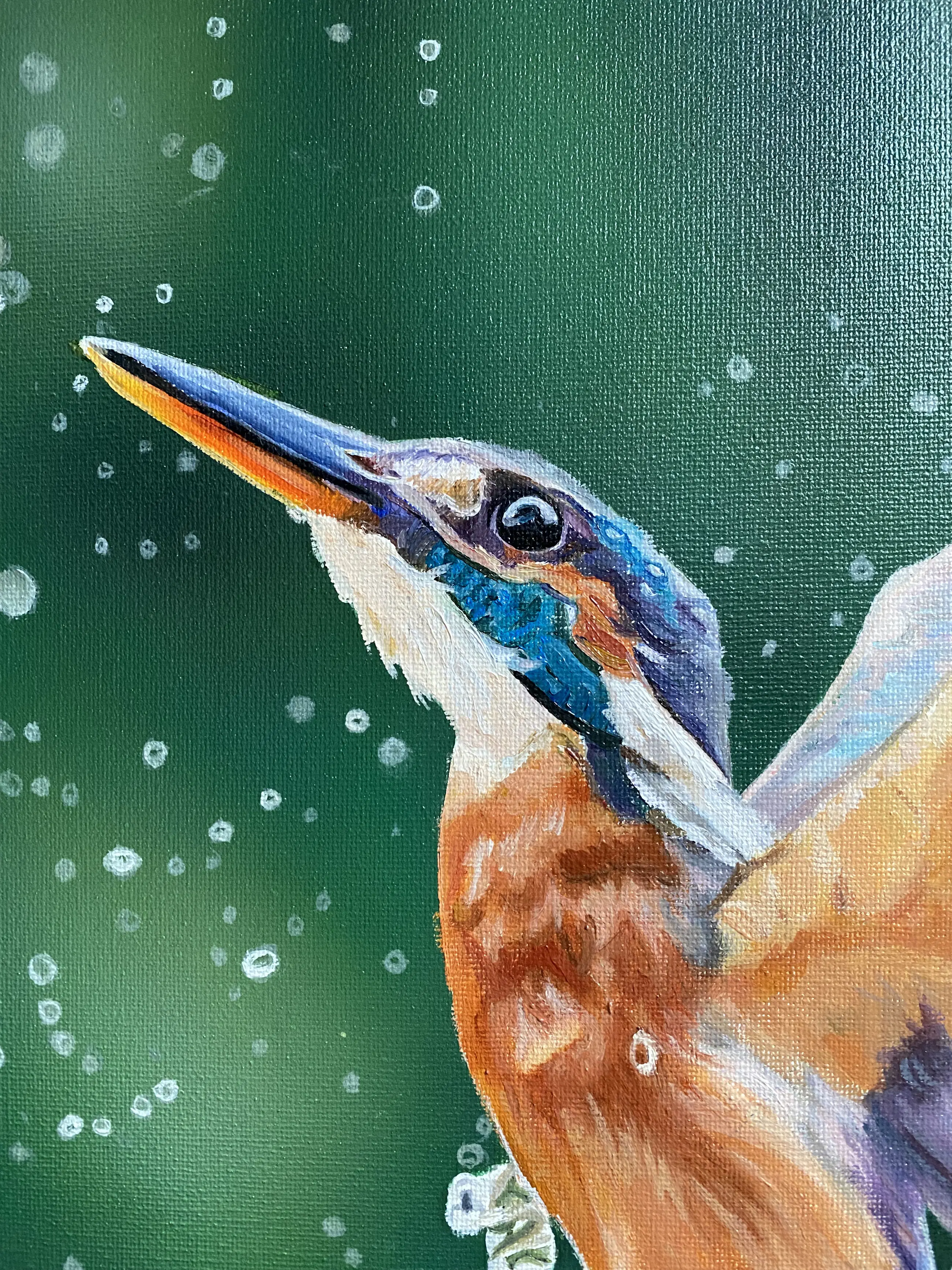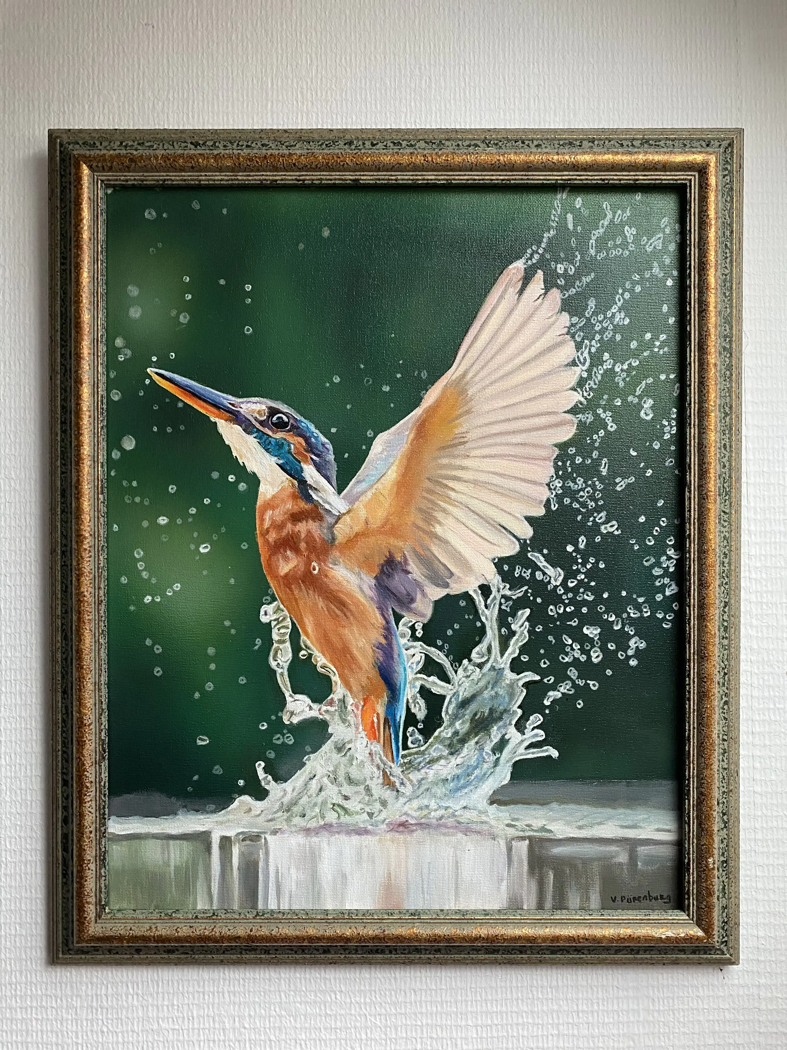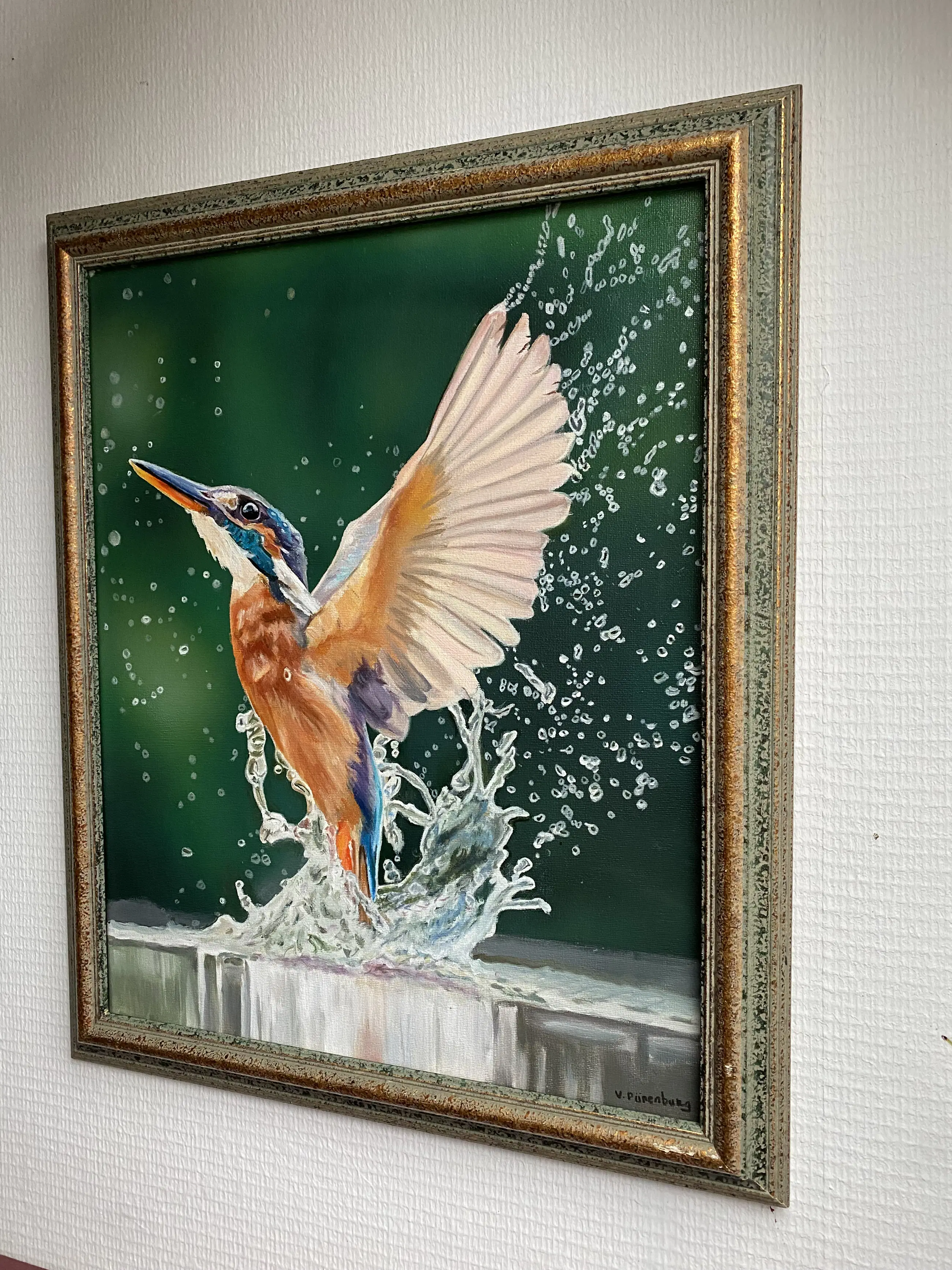 prachtig werk van de kunstenaar V. Pijnenburg “IJsvogel die het water verlaat” olieverf op doek in lijst