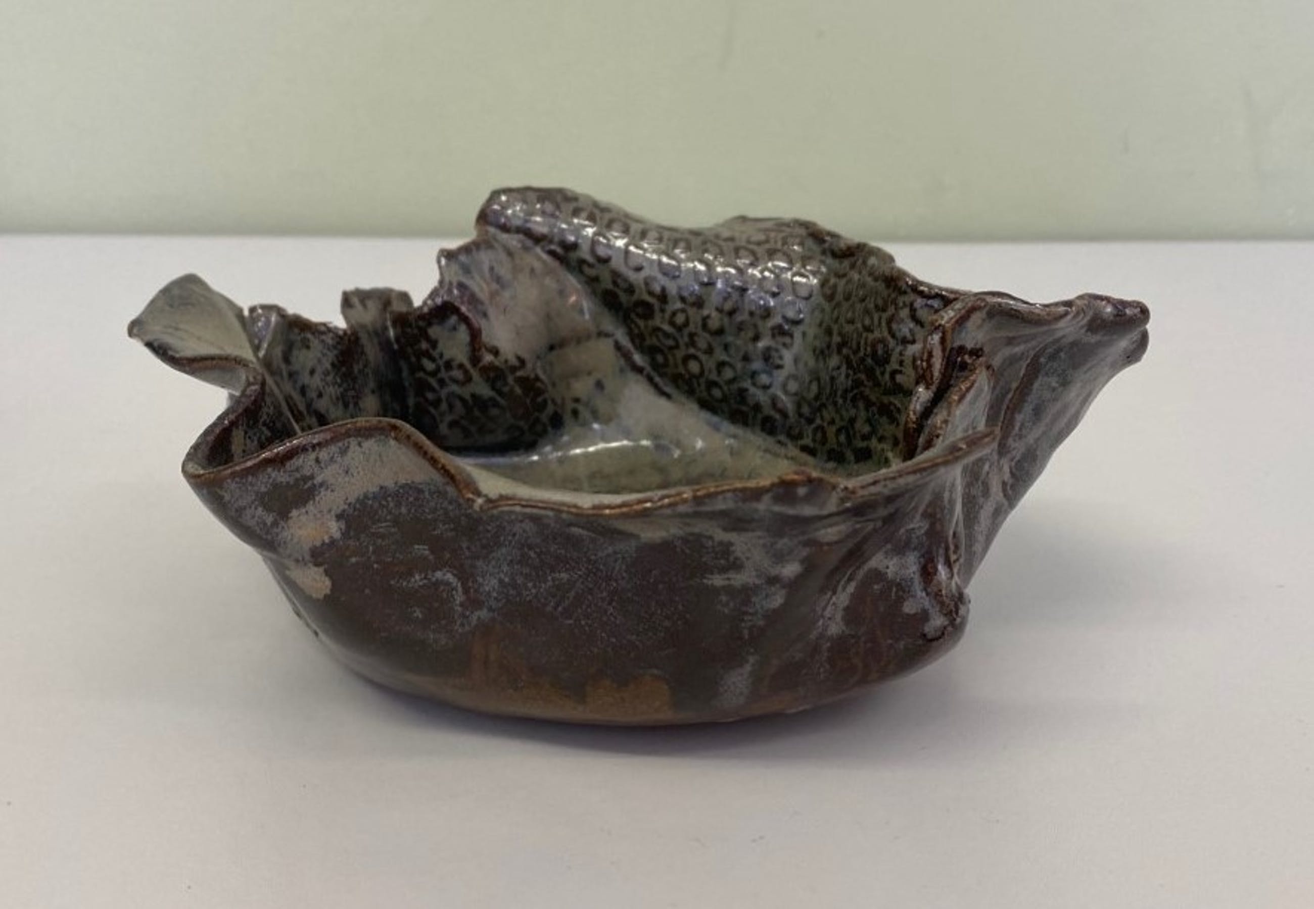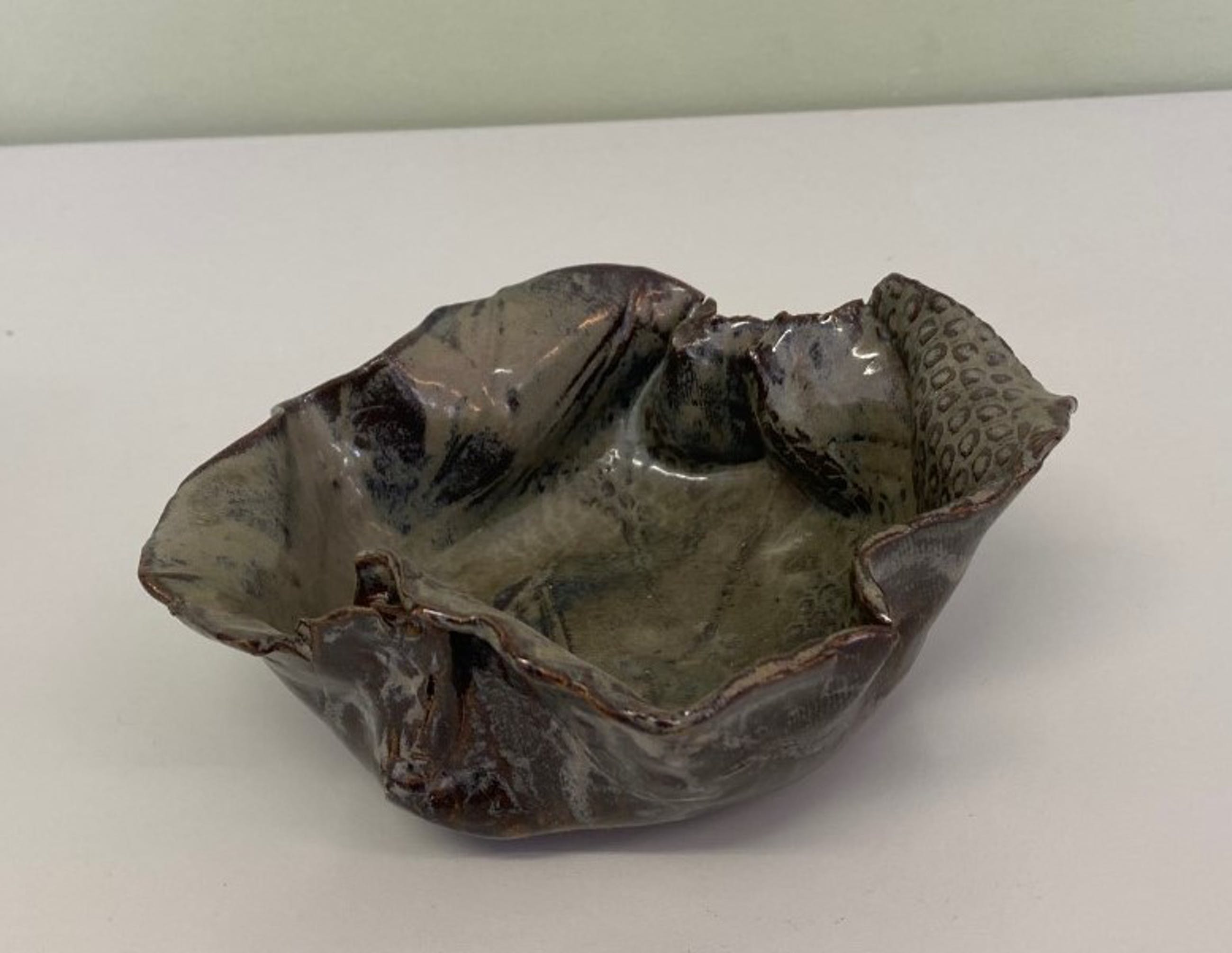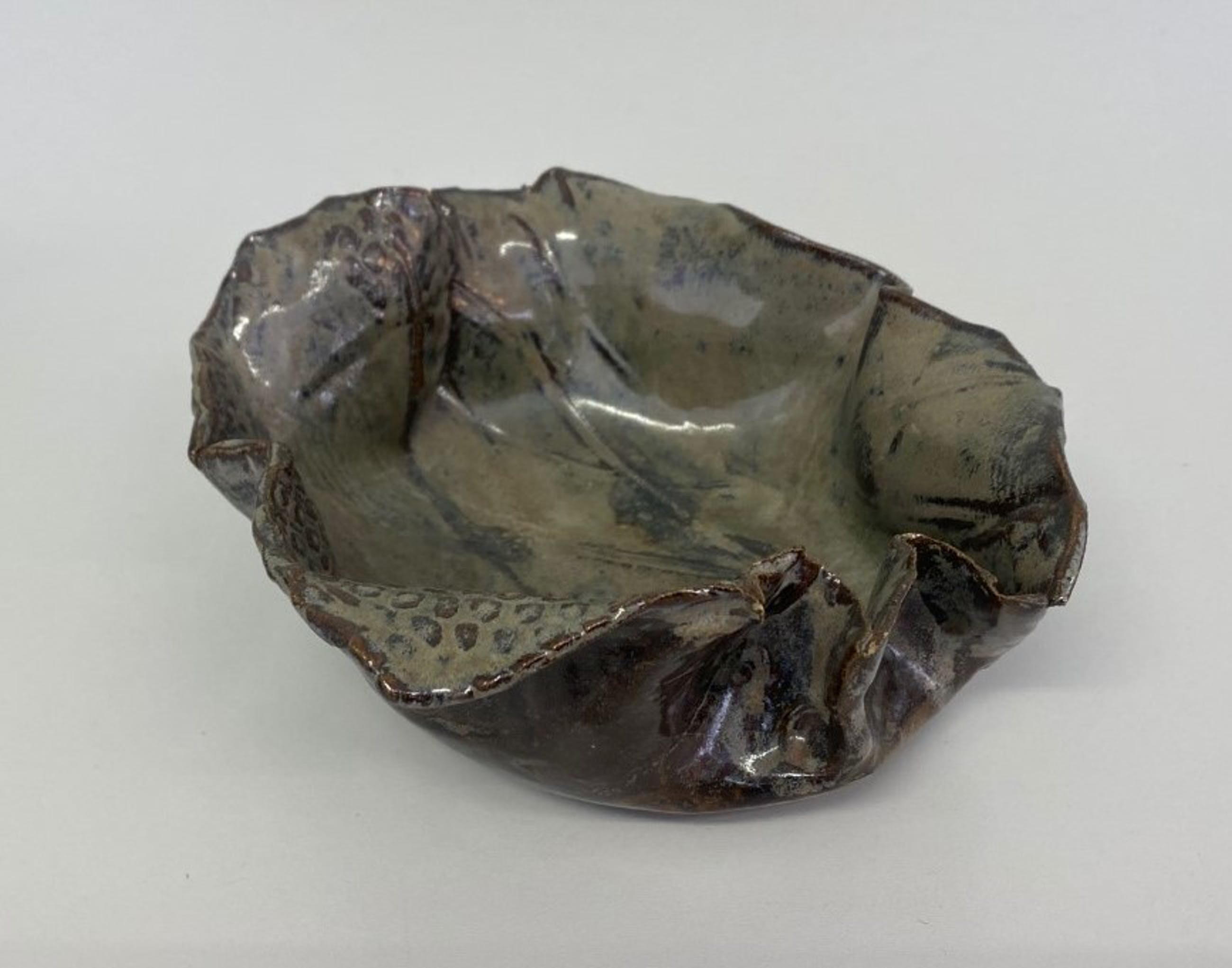 Studio keramische vrij gevormd object van gevouwen keramisch materiaal uitgevoerd in bruin en aarde tinten glazuur. Gesigneerd Joni D N.Y. (New York) en gedateerd ‘89.