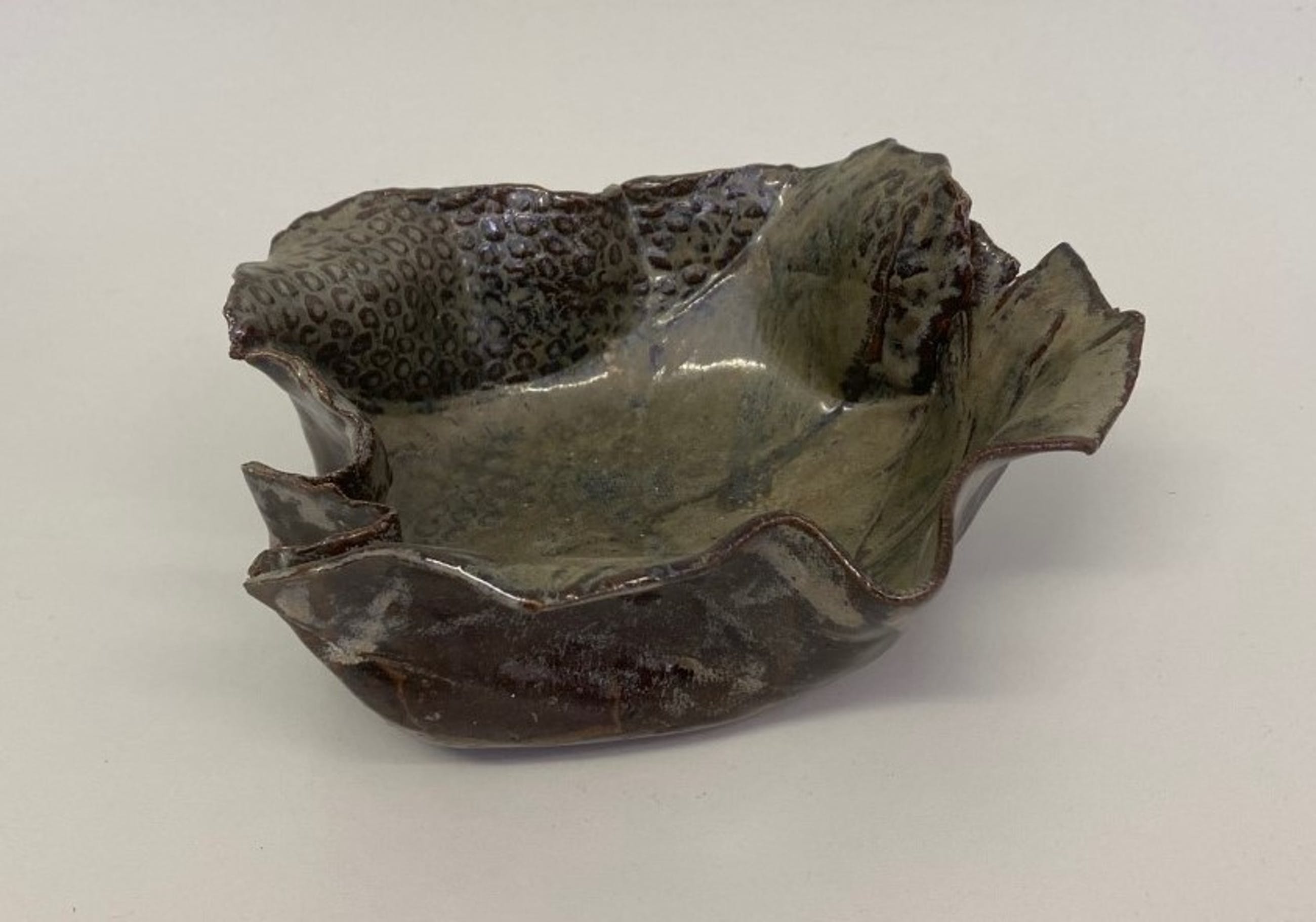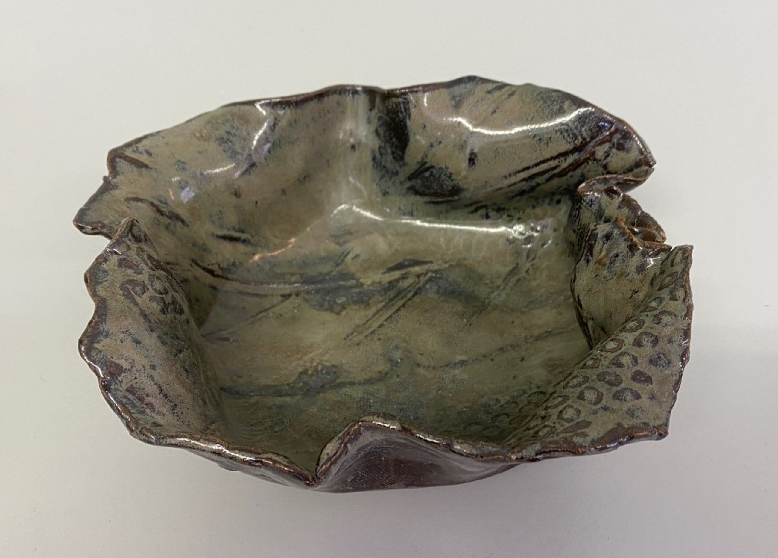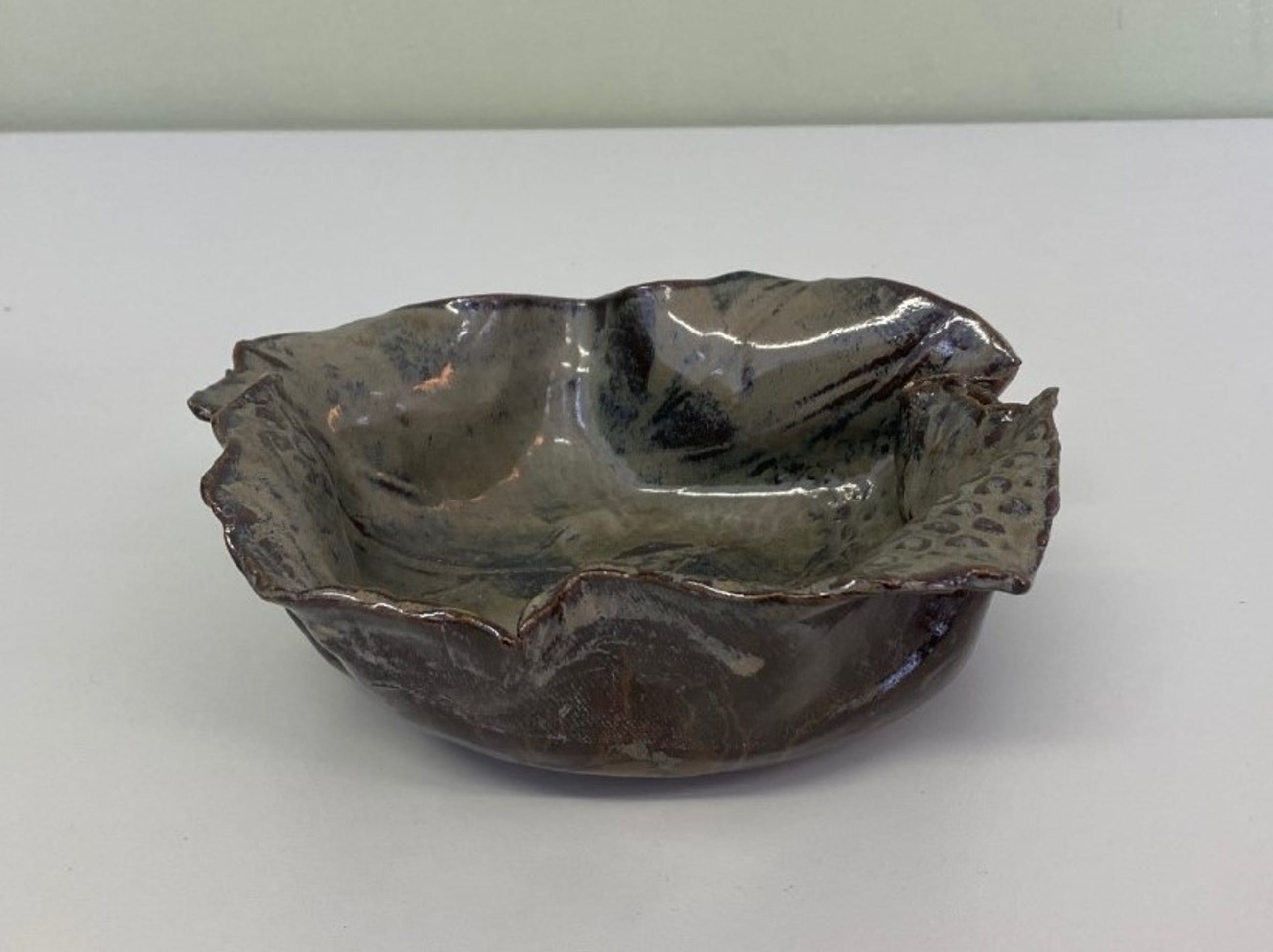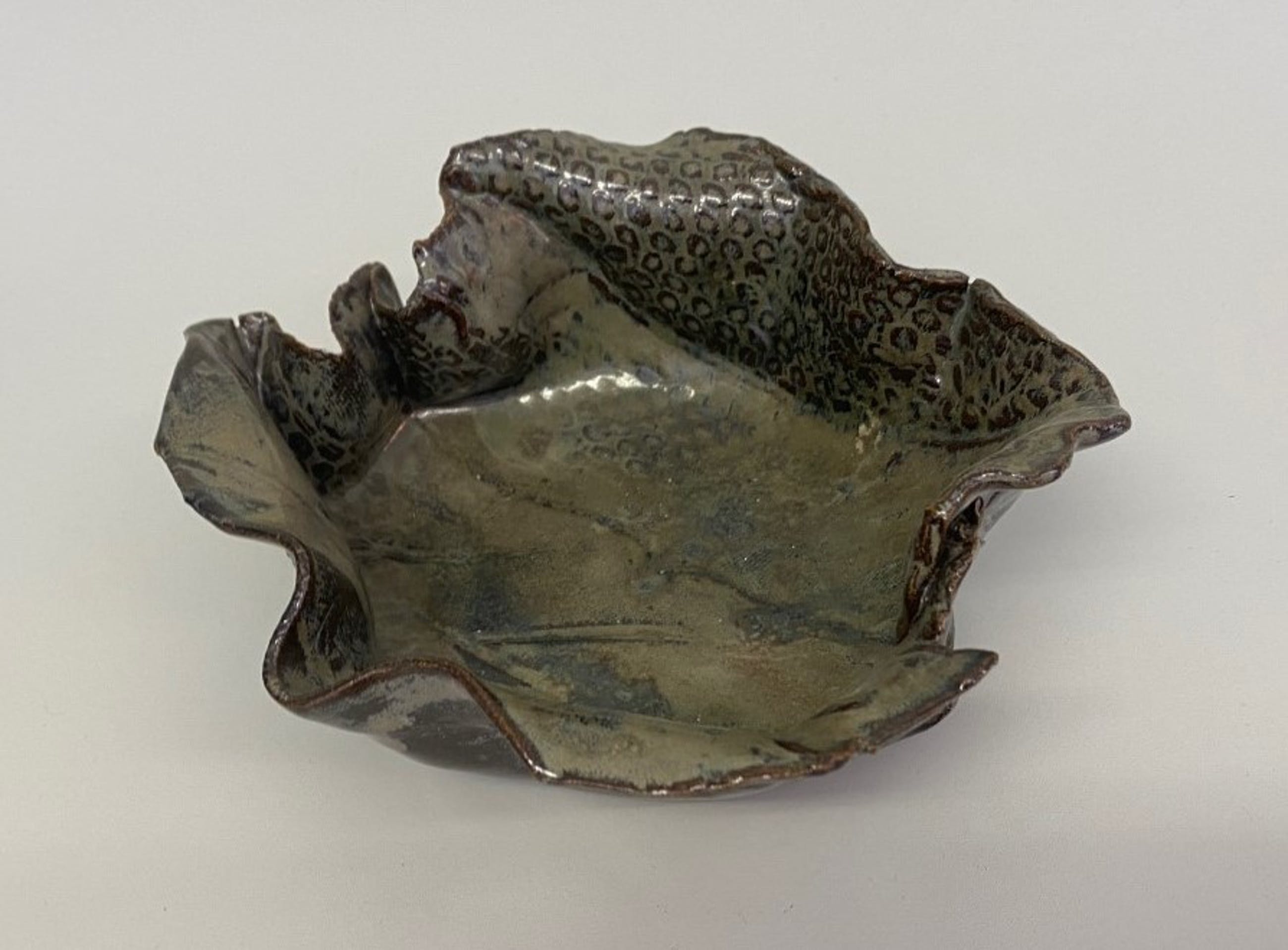 Studio keramische vrij gevormd object van gevouwen keramisch materiaal uitgevoerd in bruin en aarde tinten glazuur. Gesigneerd Joni D N.Y. (New York) en gedateerd ‘89.