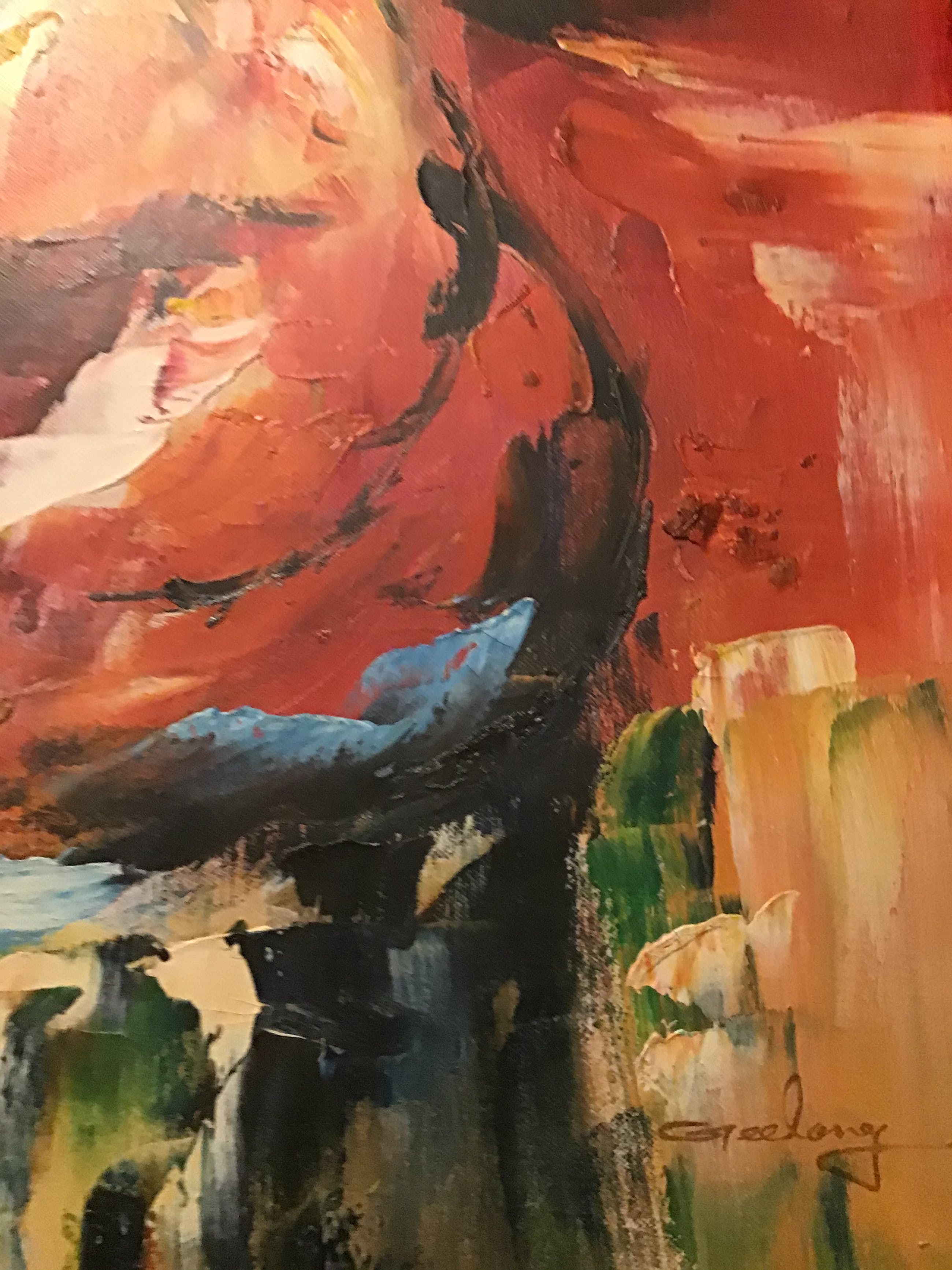 Modern met paletmes geschilderd doek. In felle sprekende kleuren.