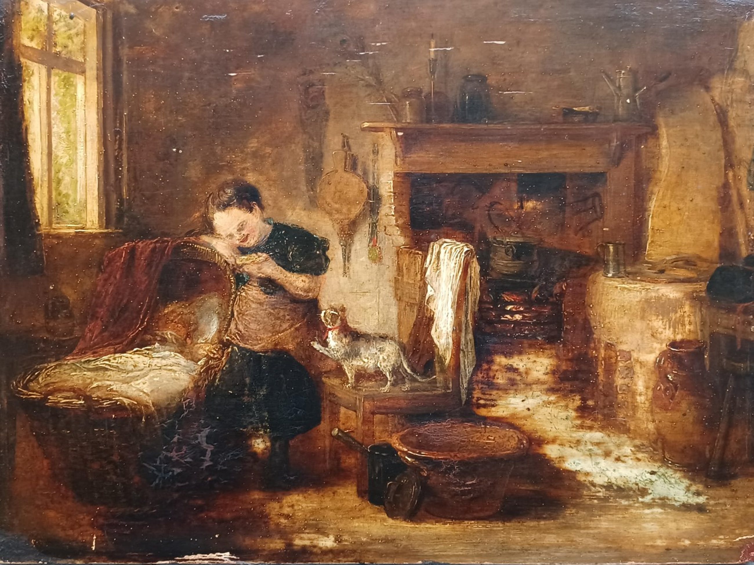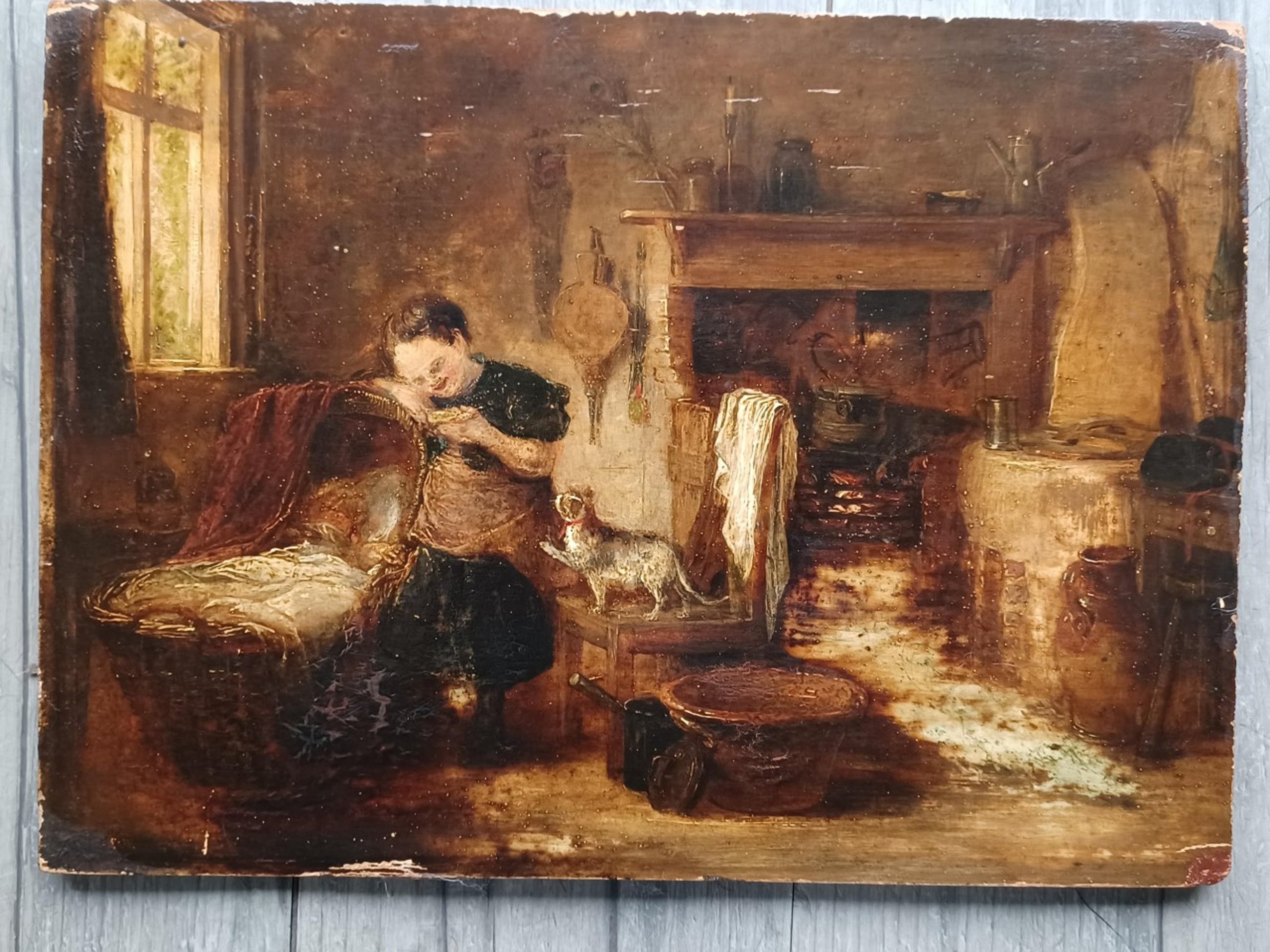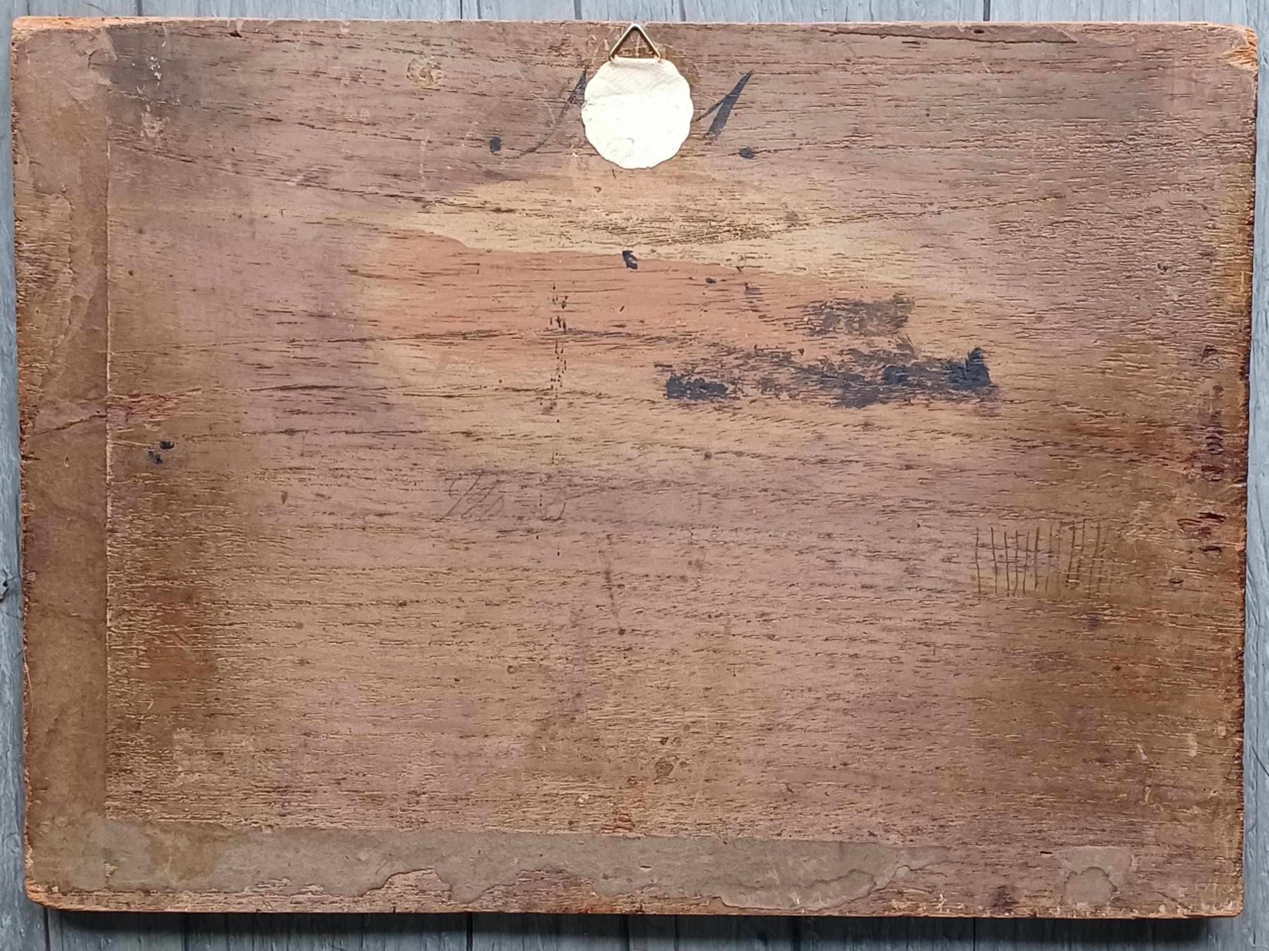 Eiken houten paneeltje met leuk tafereel. Op de achterkant is iets geschreven maar dat ie niet te lezen. Ook staan er onder de sticker met het hangertje oude initialen. Geschilderd omstreeks 1900.