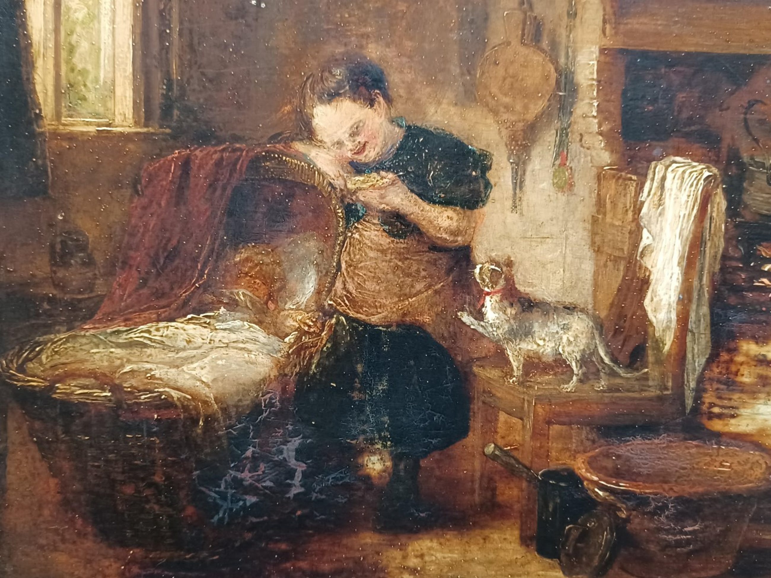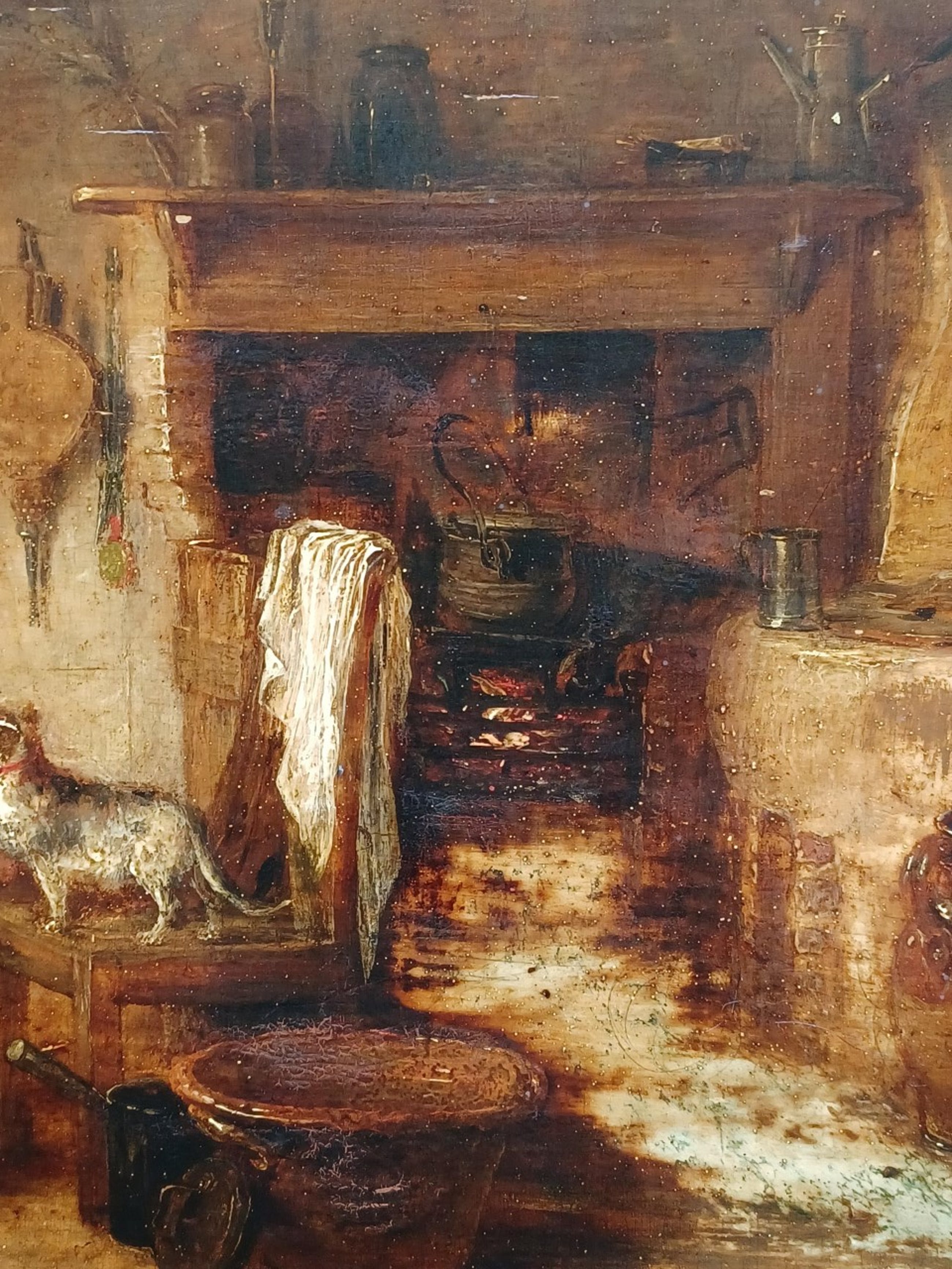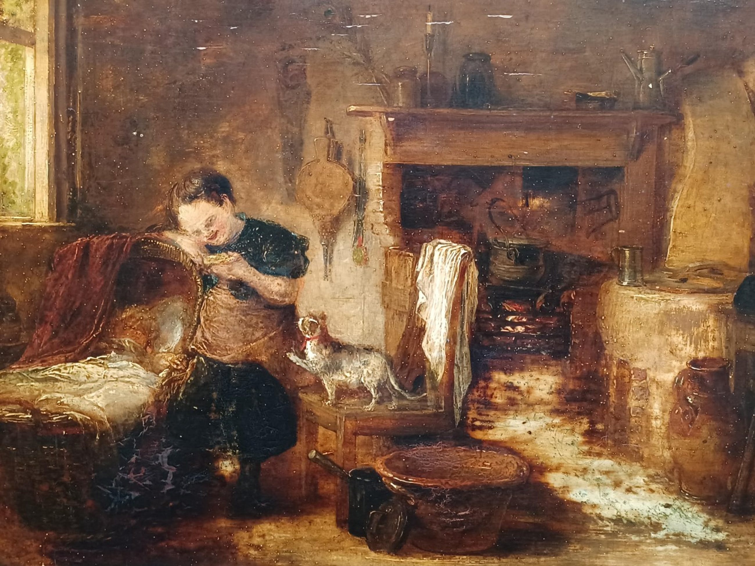 Eiken houten paneeltje met leuk tafereel. Op de achterkant is iets geschreven maar dat ie niet te lezen. Ook staan er onder de sticker met het hangertje oude initialen. Geschilderd omstreeks 1900.