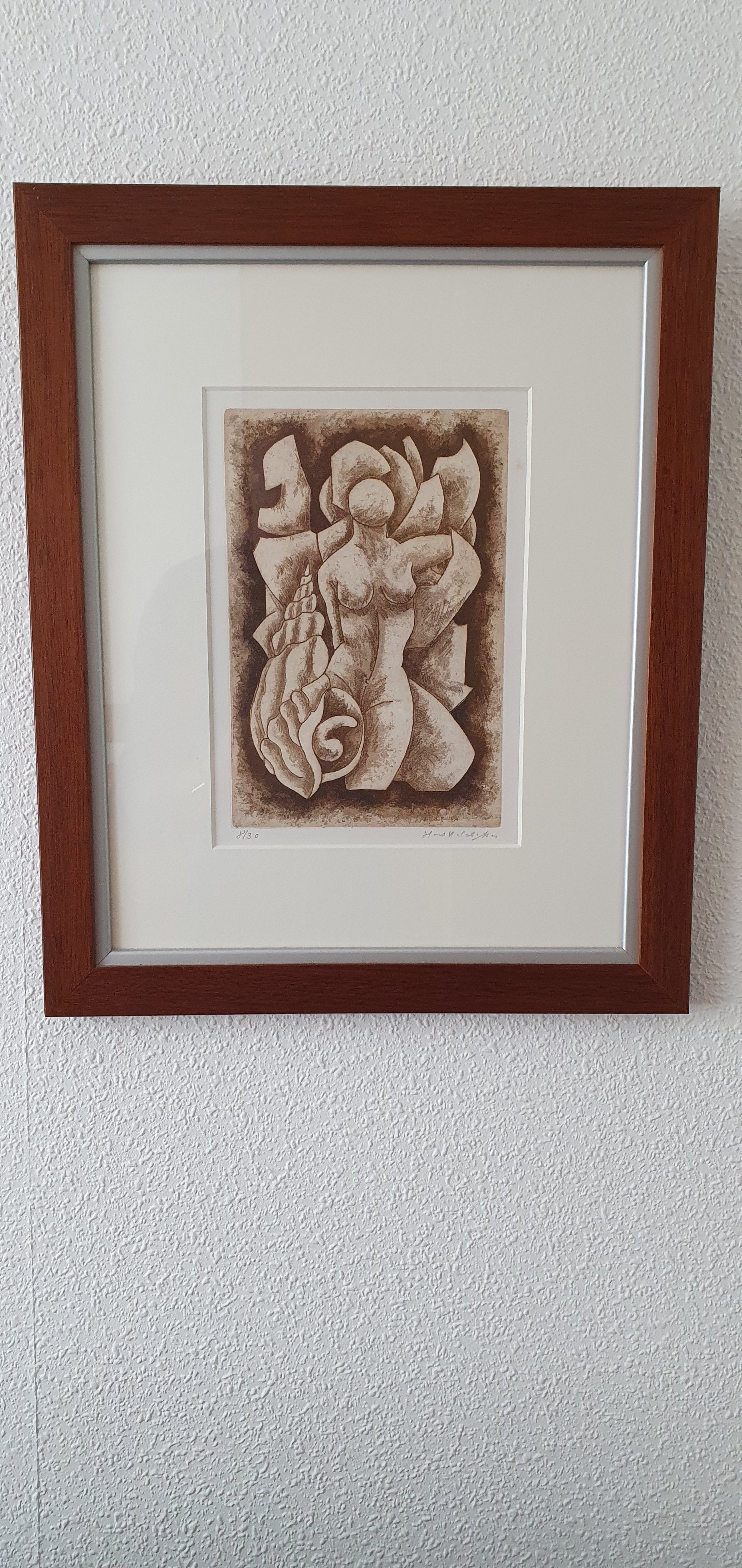 Prachtig, enigszins abstracte afbeelding van een naakte vrouw in bladeren. Kleur is bruin van zowel de tekening als de lijst. Vermoedelijk een Italiaans kunstenaar.