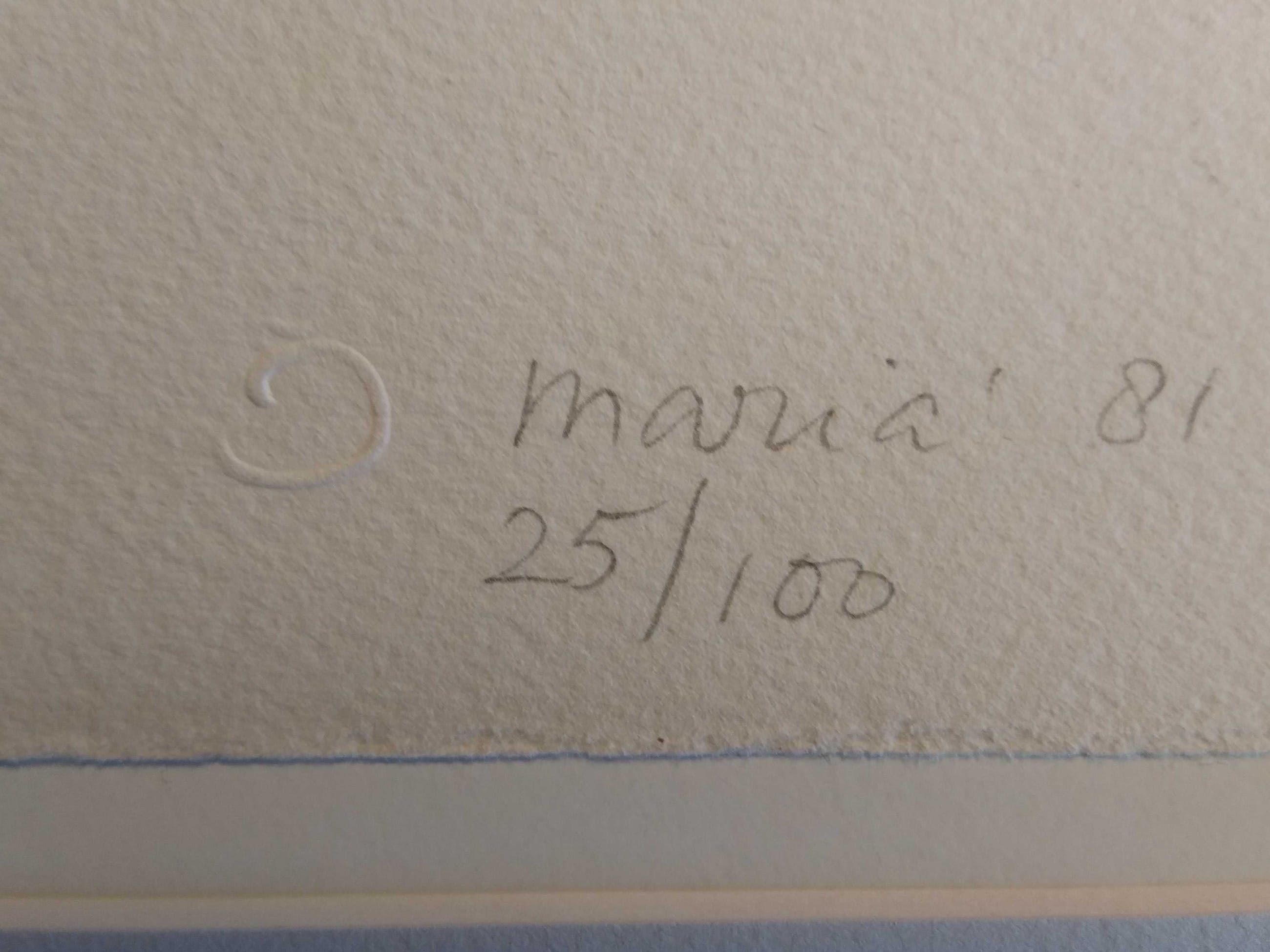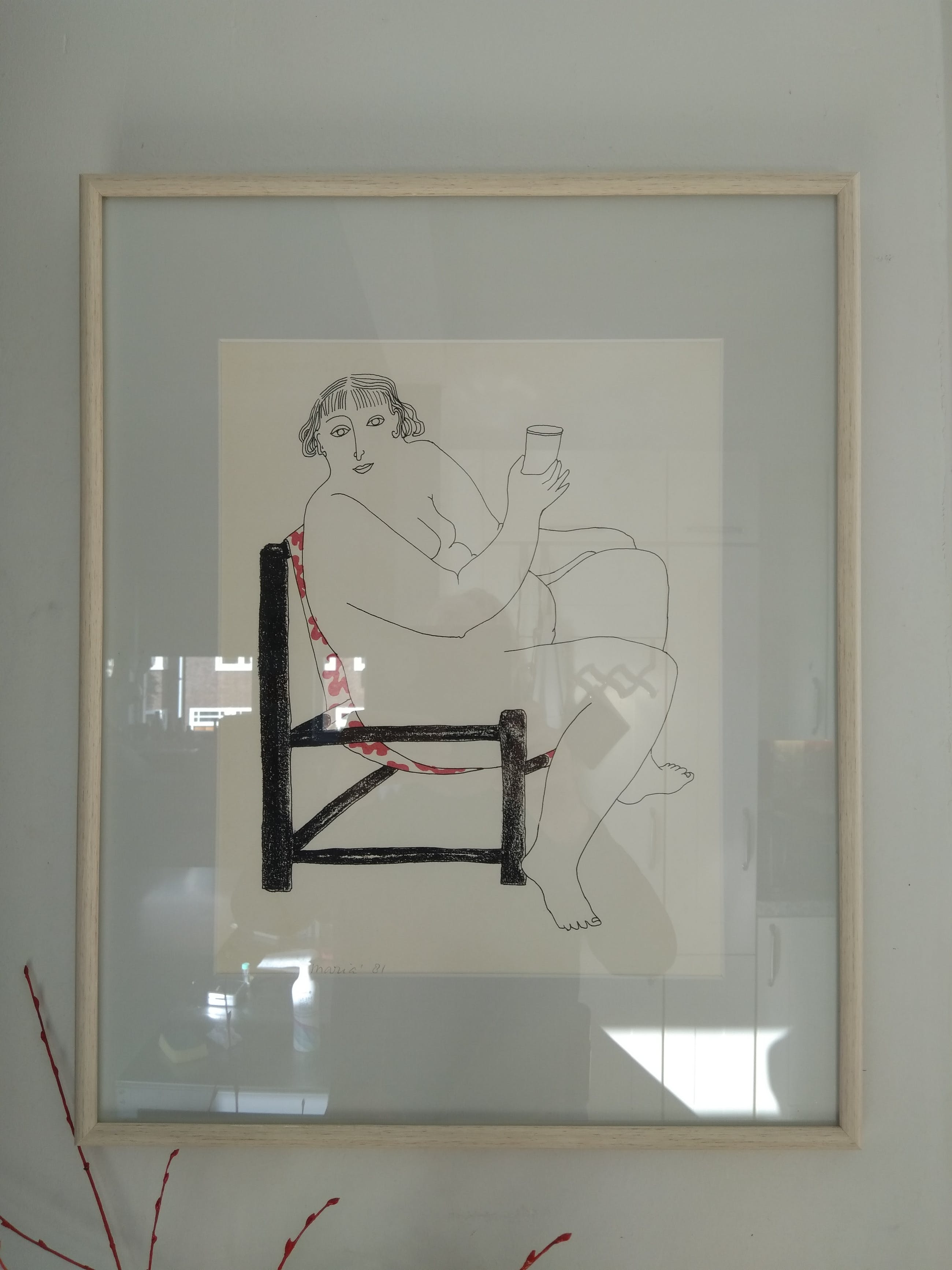 Vlot getekende zeefdruk, voorstellend een portret van een naakte vrouw in een stoel met een glas in haar hand. Zeefdruk op handgeschept Johannot papier.Zwarte lijnvoering met rode steunkleur.Ingelijst met lichtgrijs passe-partout. Al met al een vrolijk en positief werk. Gesigneerd: Maria, achternaam onbekend.Titel: Vrouw op stoel.Oplage: 25/100