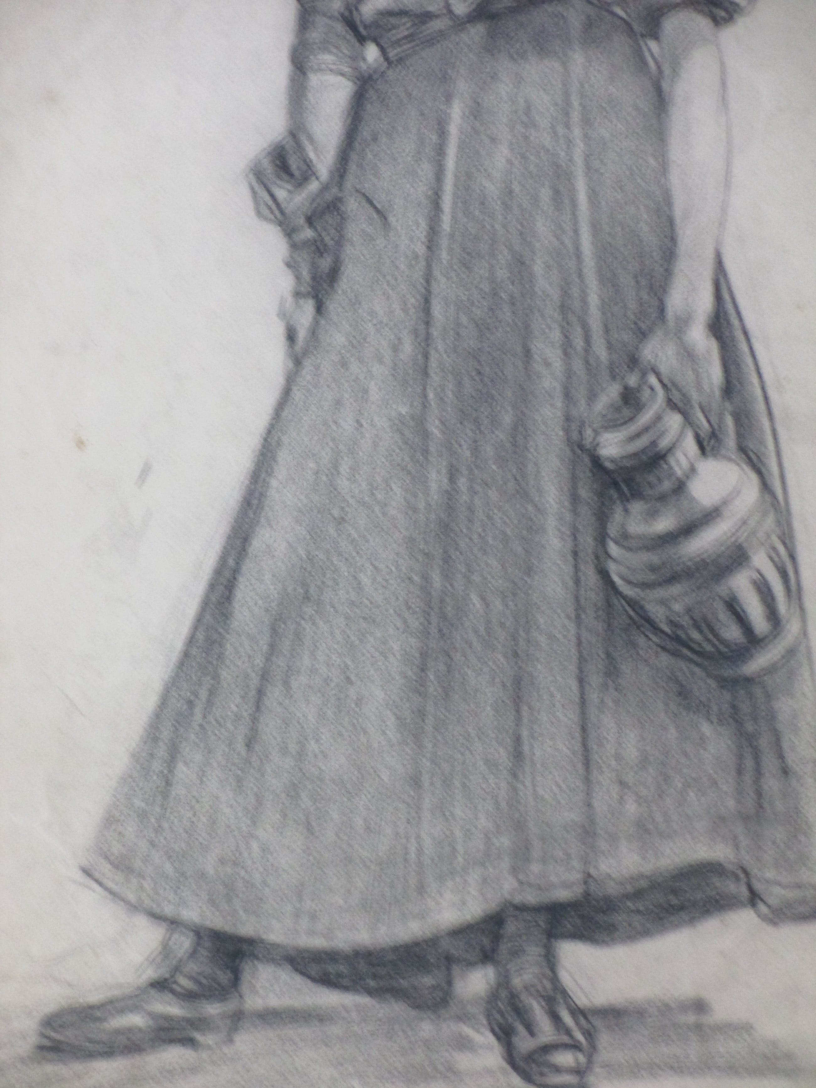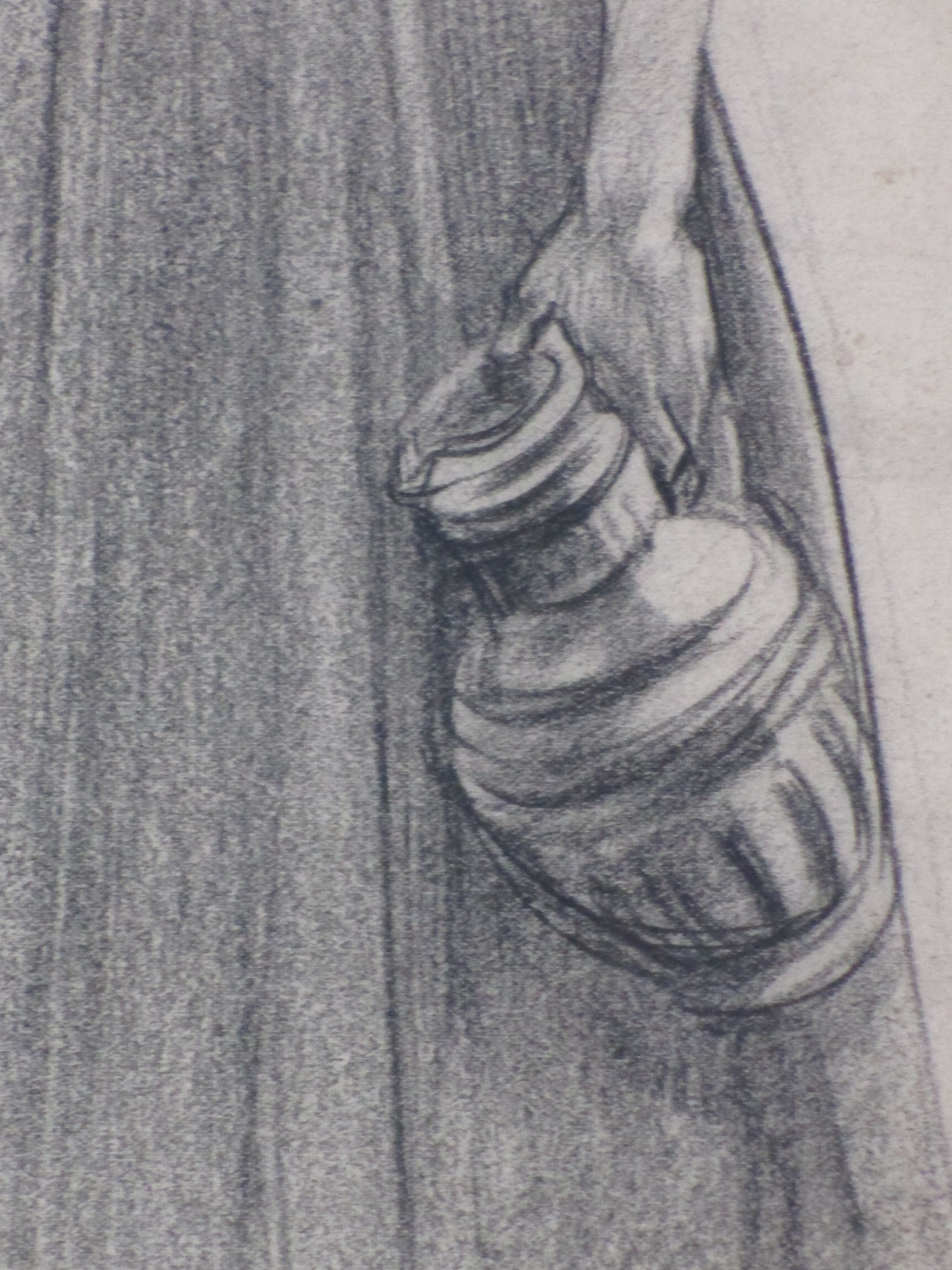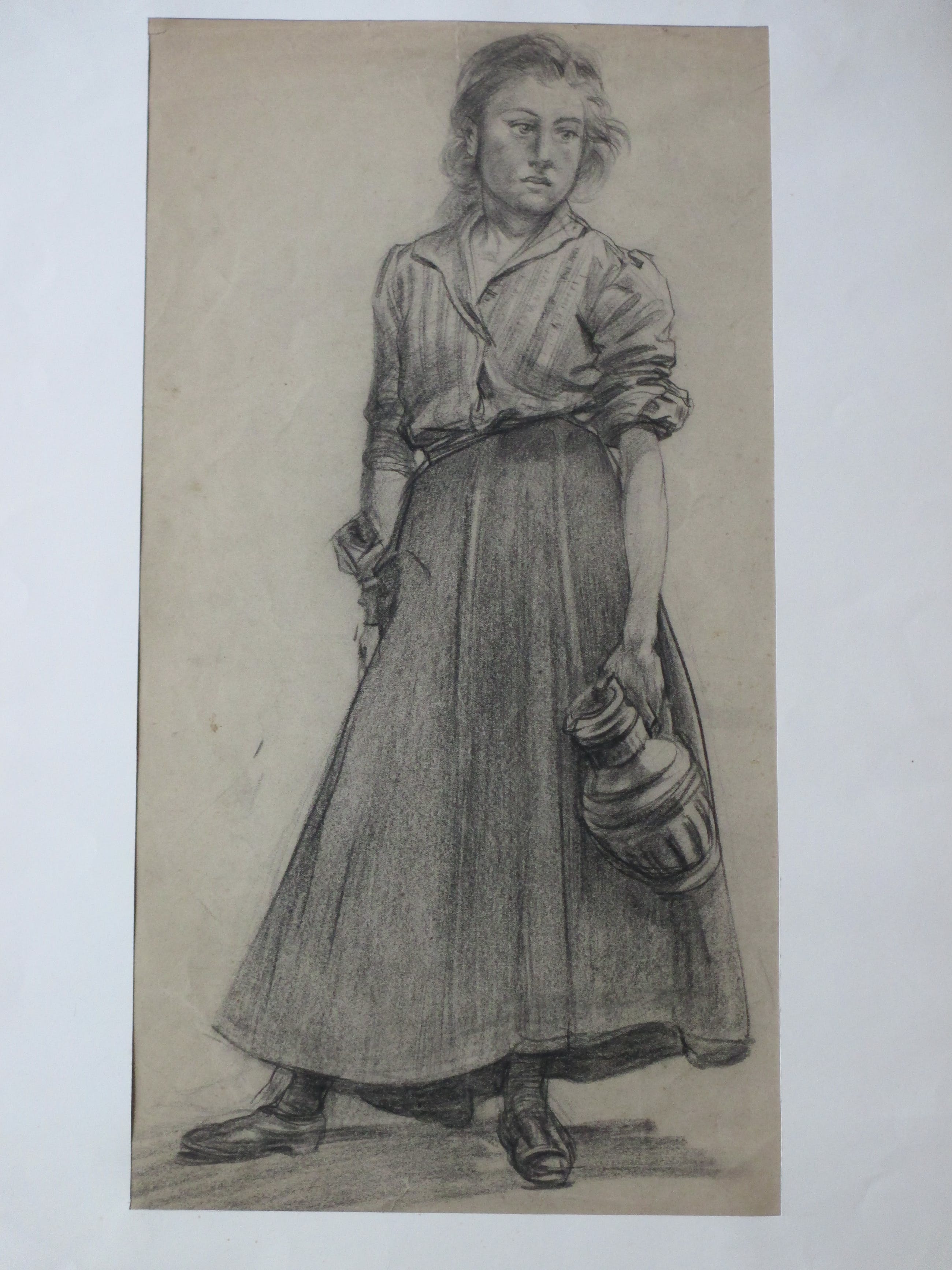 Tekening, toegeschreven aan Willem F.A.I. Vaarzon Morel Voorstelling van een vrouw met een drankkruik in de hand Losbladig onder passepartout, beeldmaat 46x24, p.p.maat 57x39 Niet gesigneerd Herkomst: Veilinggebouw De Zwaan Amsterdam 2021