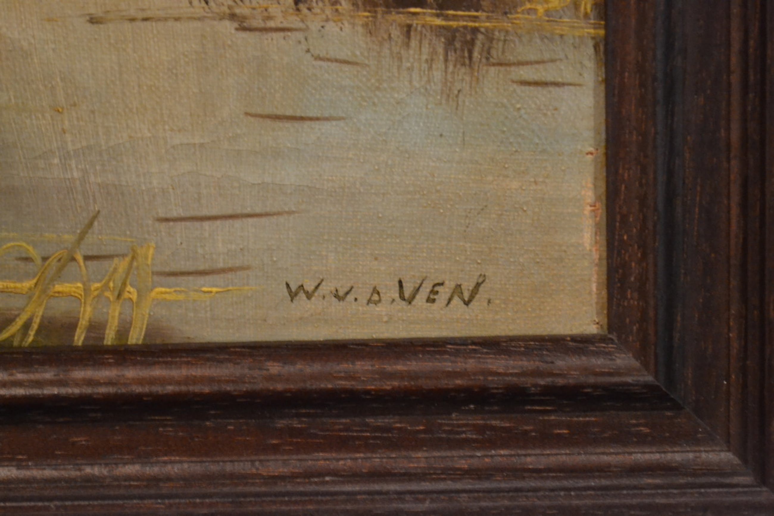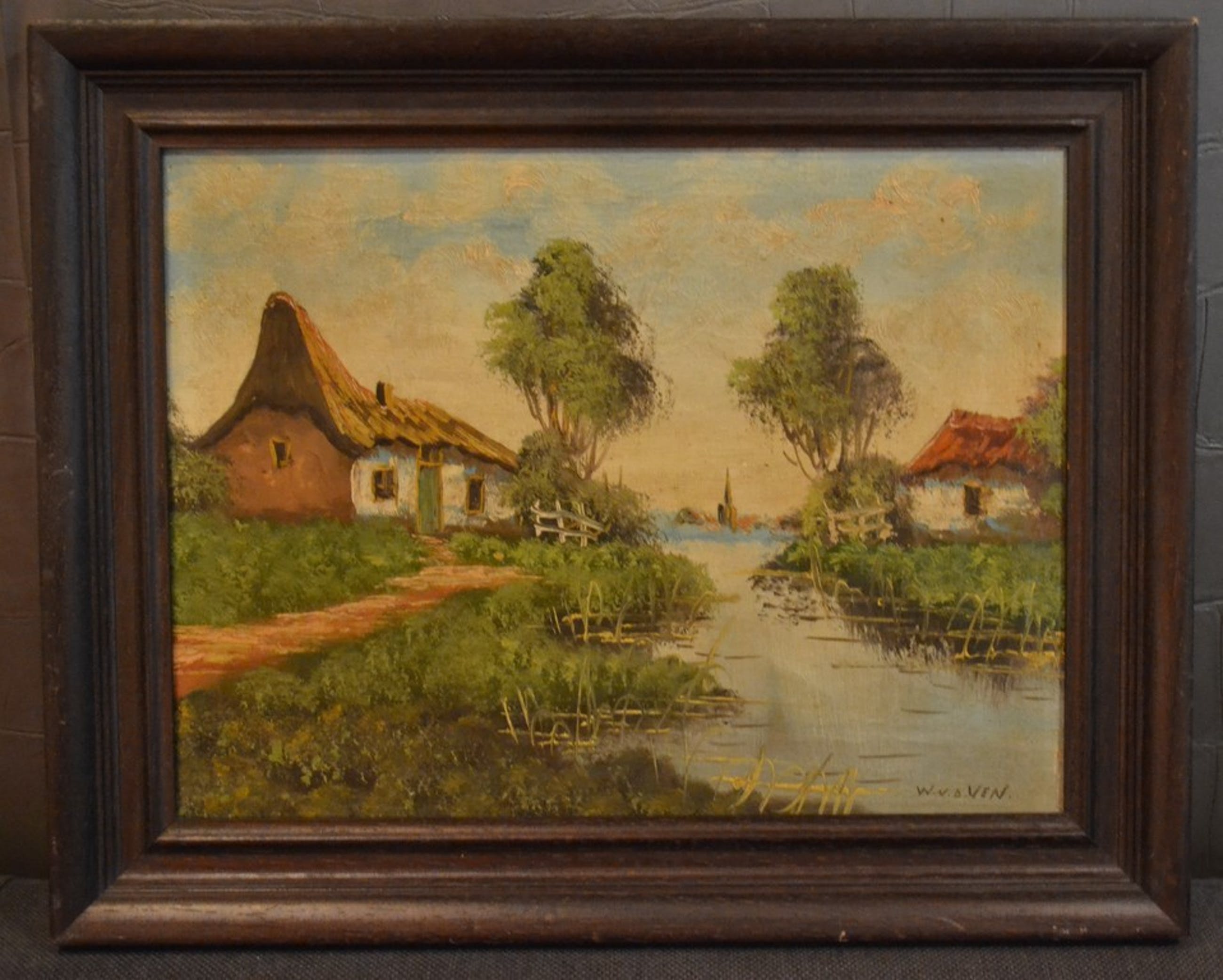Olieverf op doek van boerderijen aan het water. Zowel lijst als schilderij in goede staat. Het werk is rechtsonder gesigneerd (W v/d Ven). Afmeting schilderij is 40x30cm en van de lijst 50x40cm.