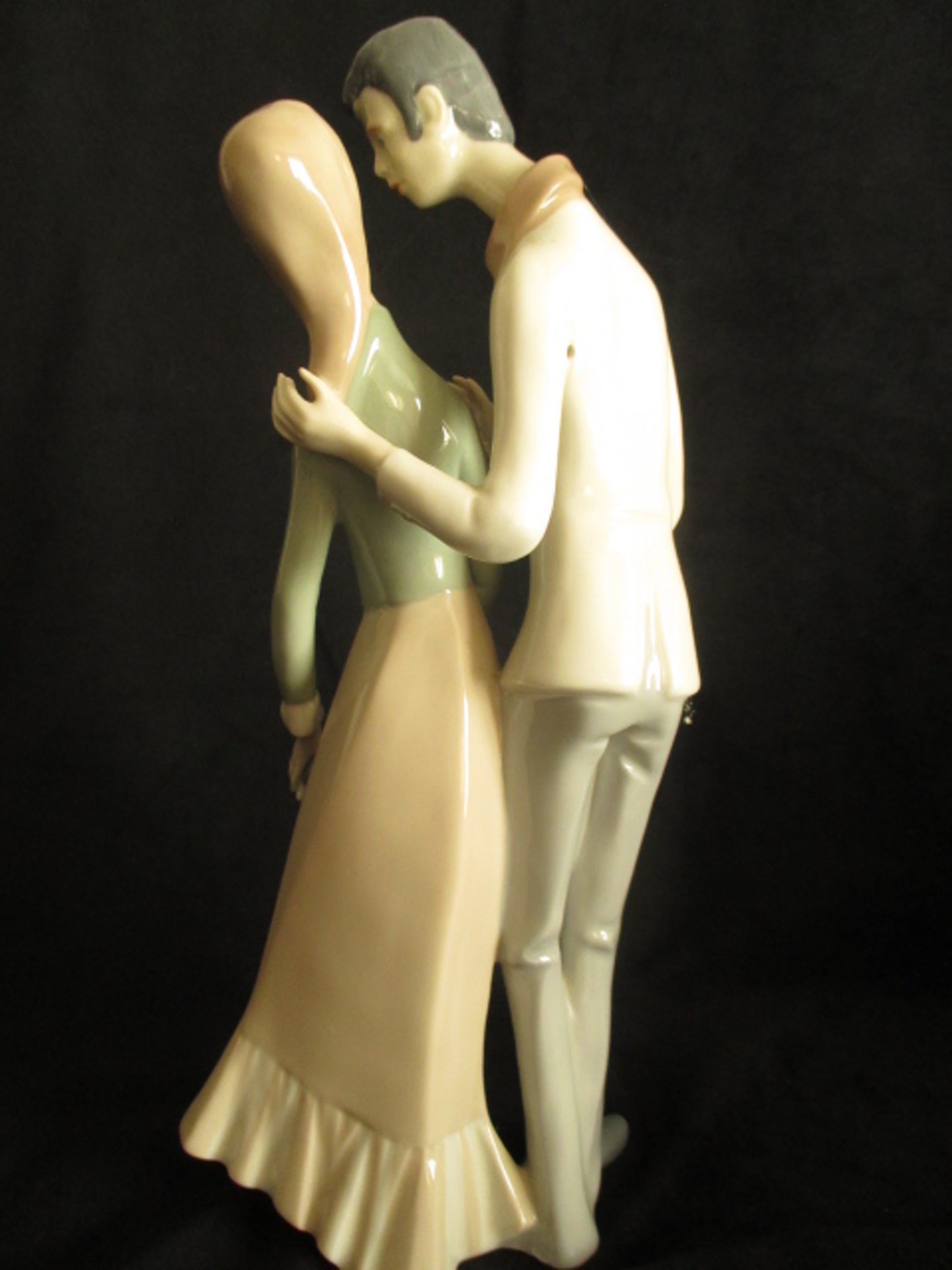 Romantisch porseleinen beeldje met afbeelding van een verliefd paar.Fabrikant is Wagner&Apel (Lippelsdorf) — vroegere Duitse Democratische Republiek, sinds 1990 Duitsland.Gemerkt met een kroon, een nummer en een ingeperst nummer. Volgens de stempel is dit beeldje van de jaren 1951-1974.Het beeldje is gemaakt van hard porselein en onderglazuur beschildering.In top conditie!Afmetingen: H 26 cm, breedte beneden basis 11 cm.Aangetekende en verzekerde verzending.
