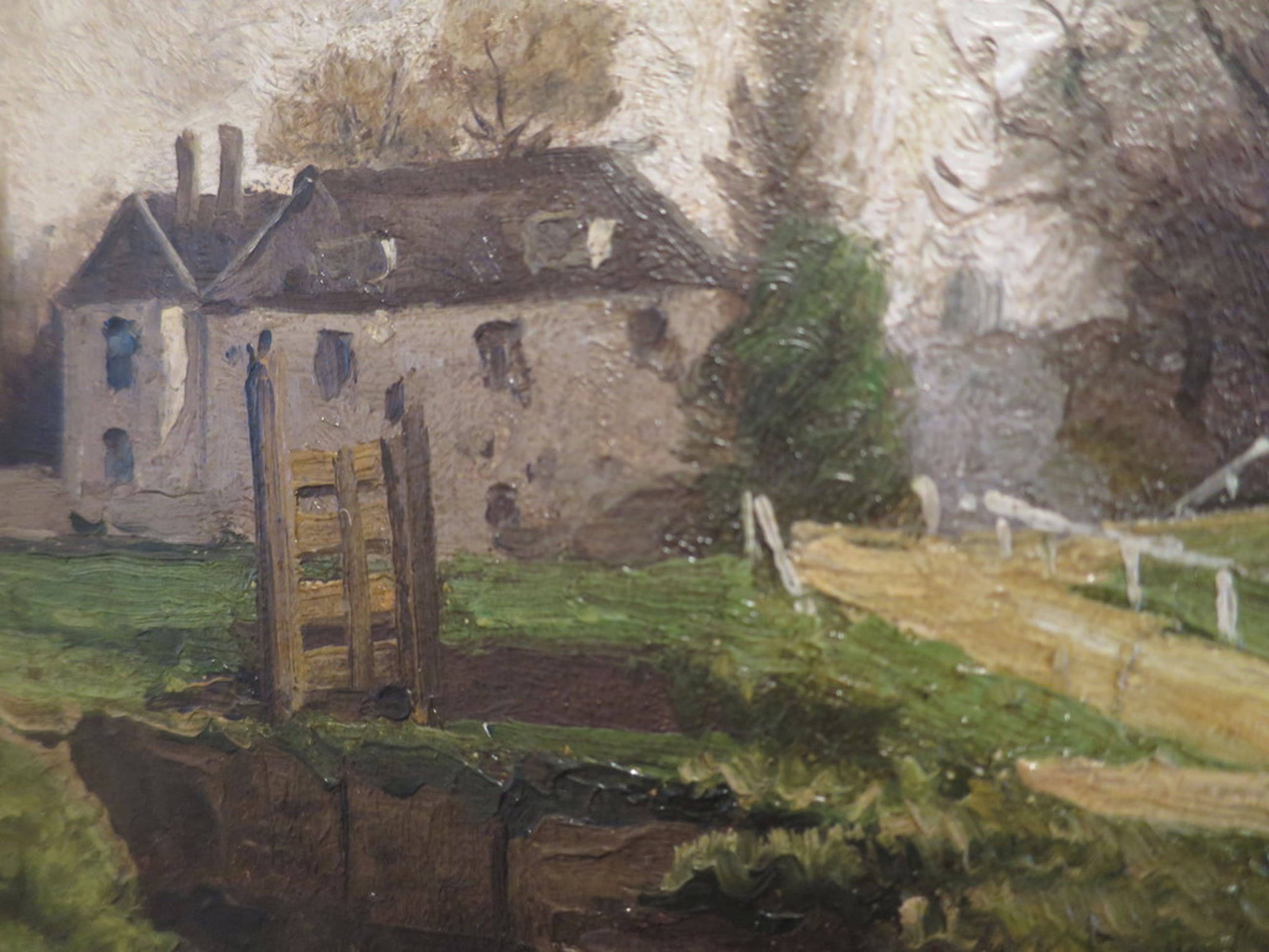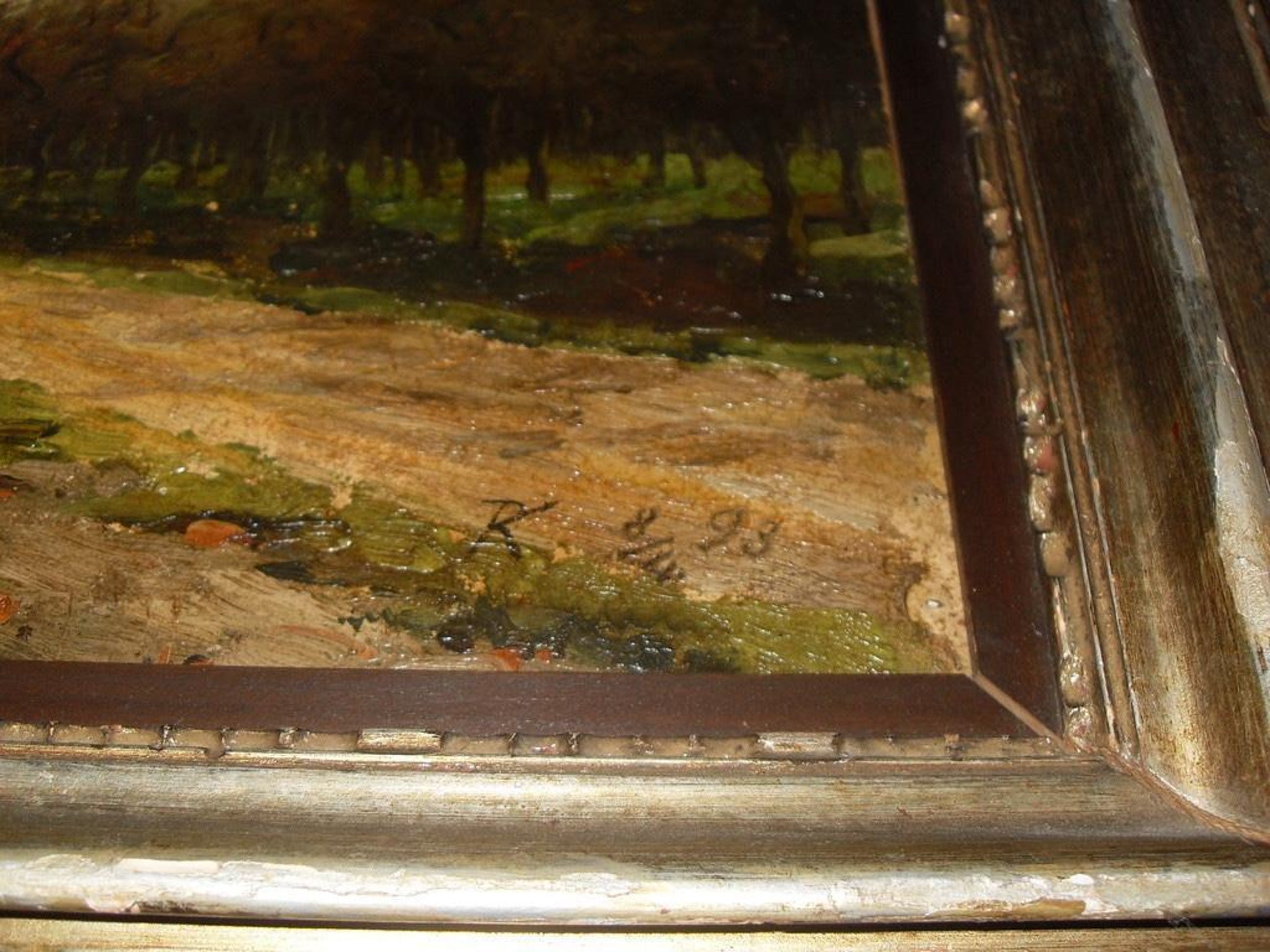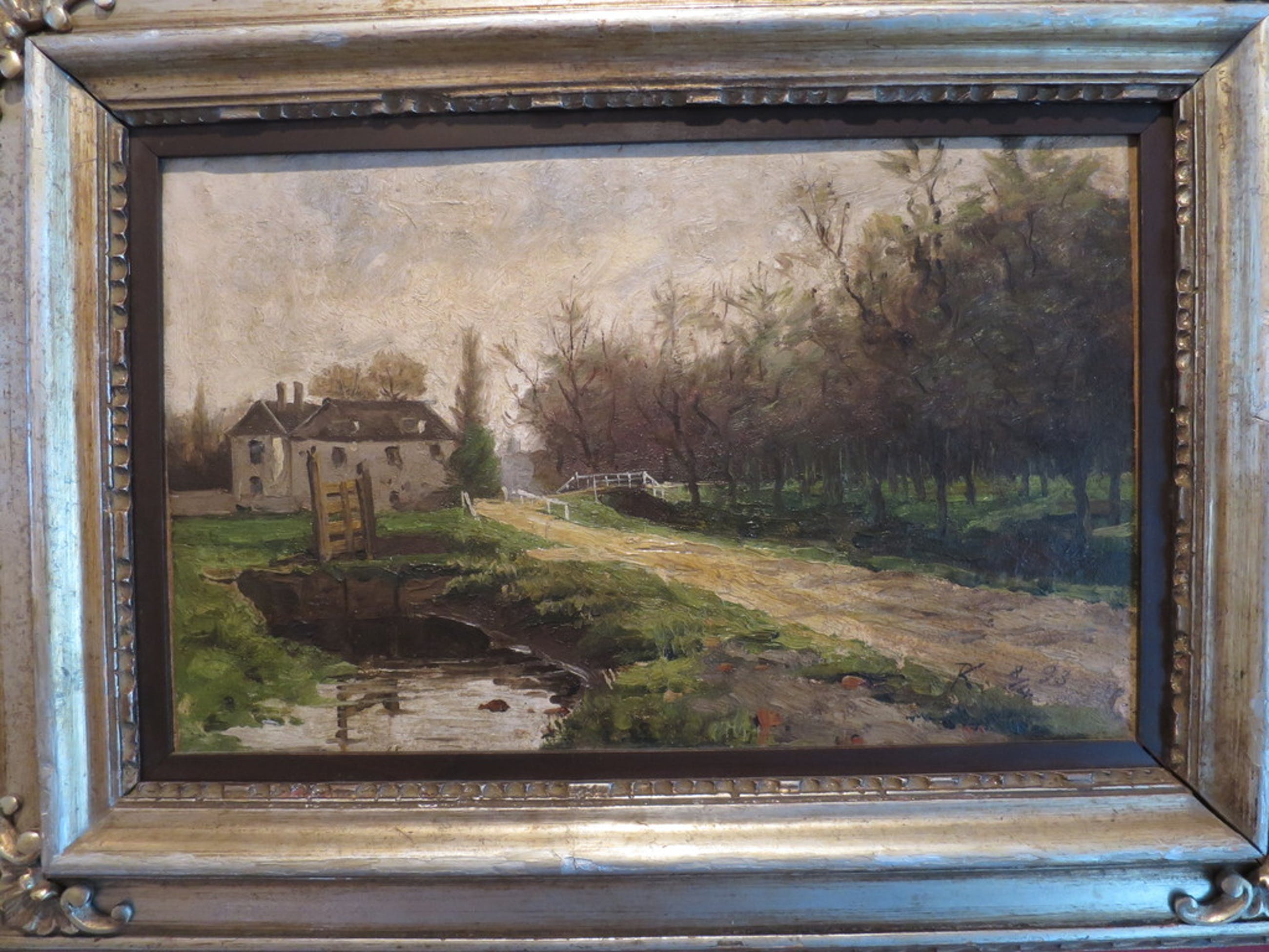 Wassenaar - voormalige buitenplaats Bosch- en Duinzicht - 1893, olieverf op hout van kunstschilder met initialen PK of RK 8-4-93, lees 1893! Deze buitenplaats lag aan de zuidrand van Wassenaar, langs de Benoordenhoutseweg op een gedeelte dat nu op grondgebied ligt van Den Haag, nl. bij de Neuhuyskade, tegenover het Haagse Bos. Bij de ontwikkeling van de woonwijk is de buitenplaats begin 20ste eeuw gesloopt. Een uniek schilderij dus! Afm. werk 25x40cm. In verso aantekening Wassenaar, zie foto oorspronkelijke buitenplaats.