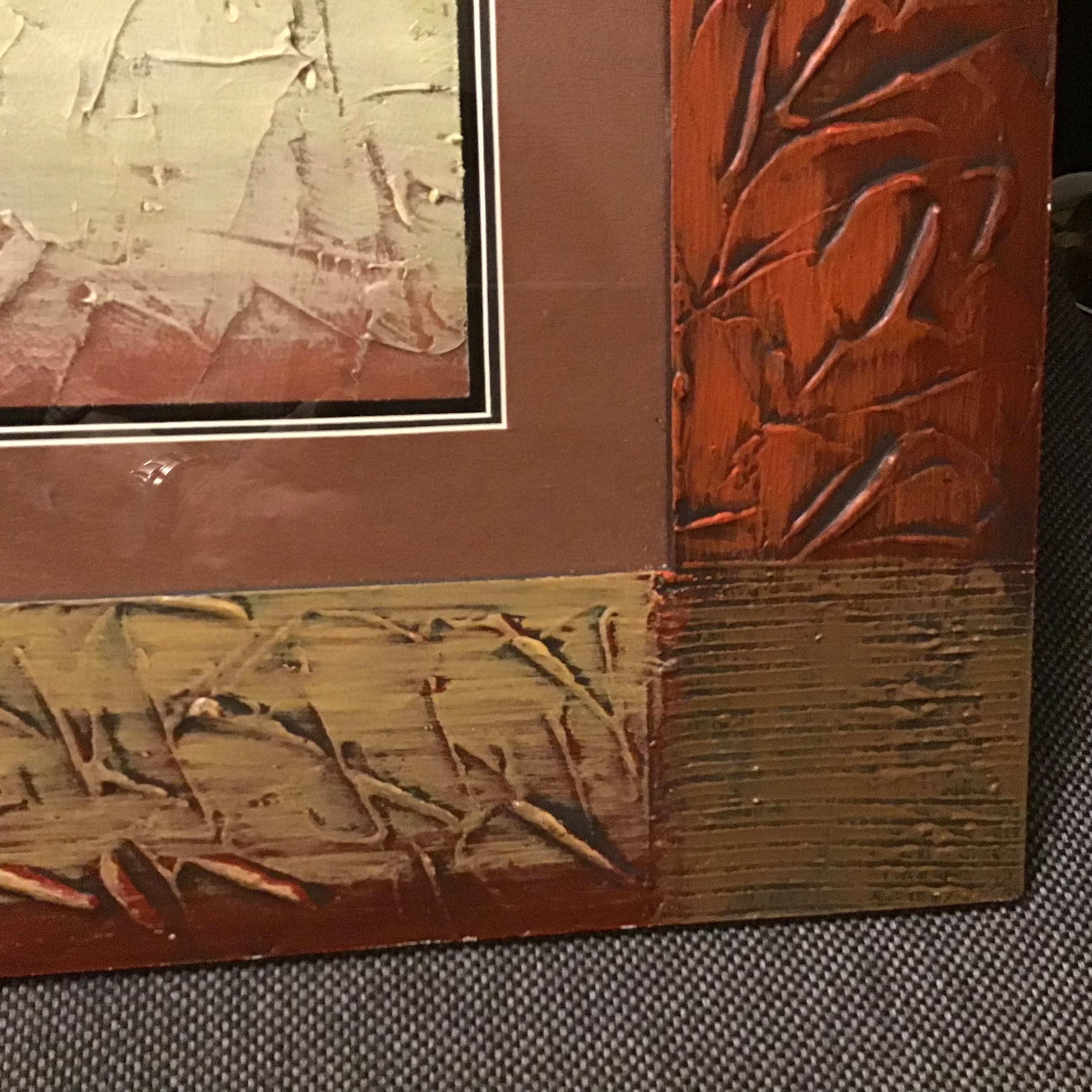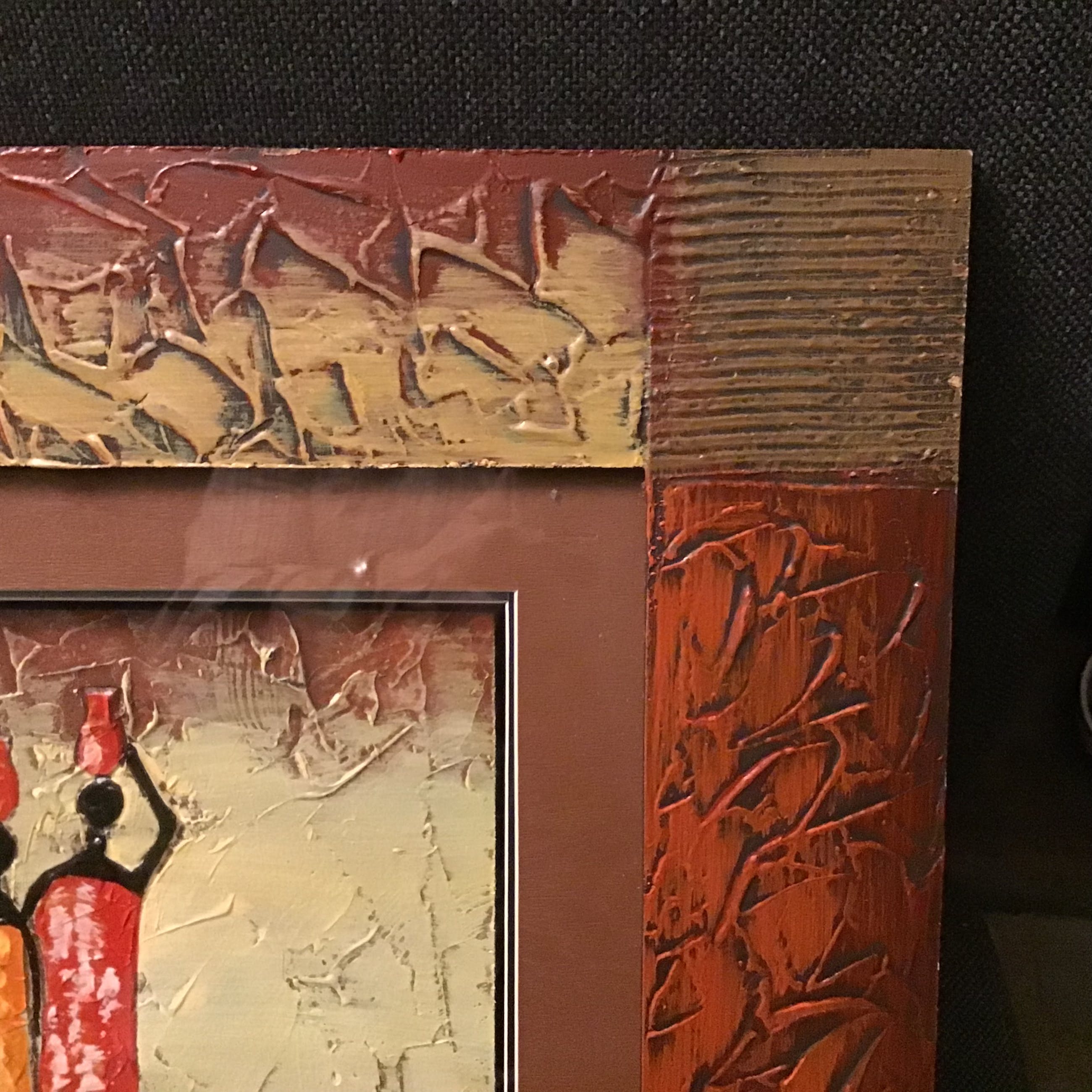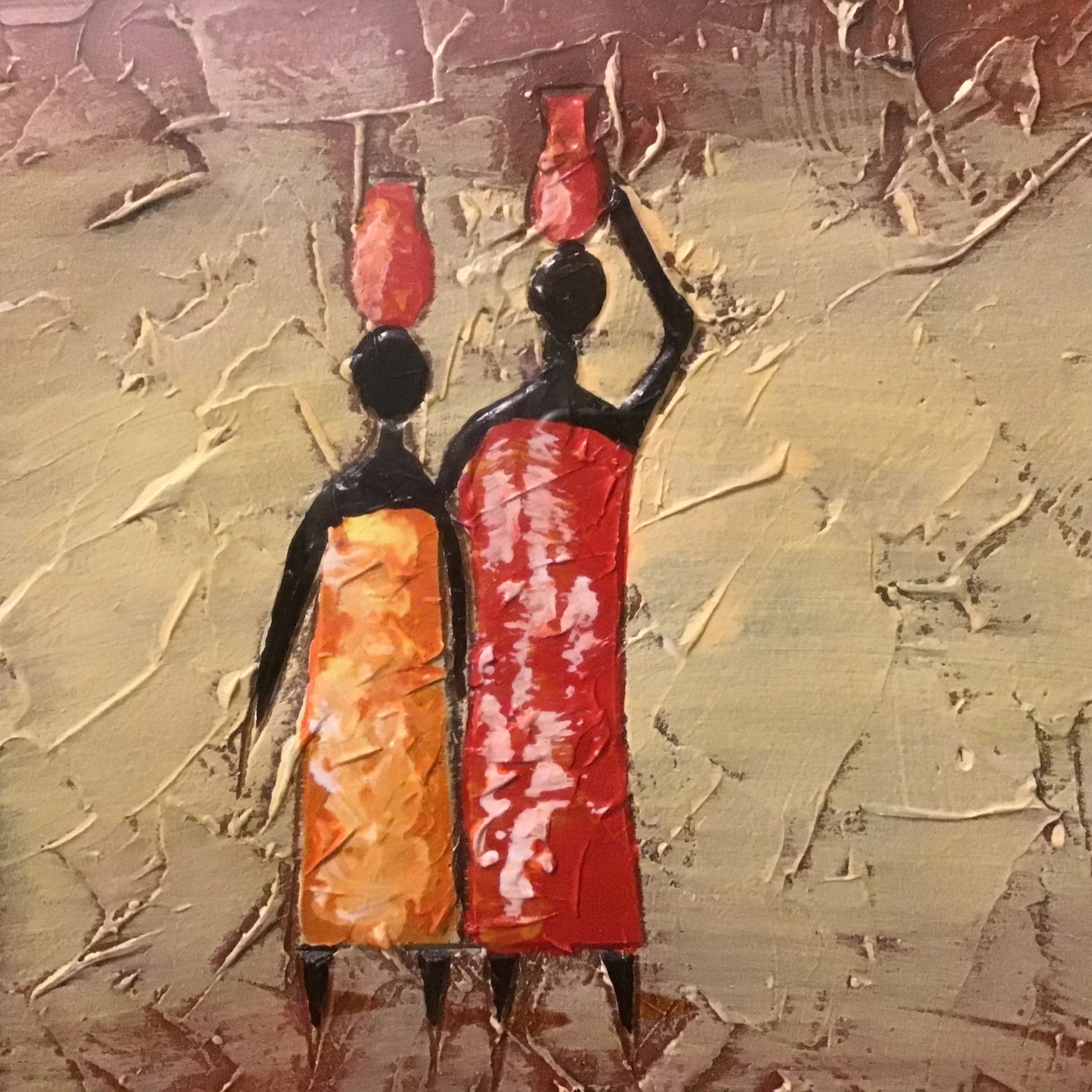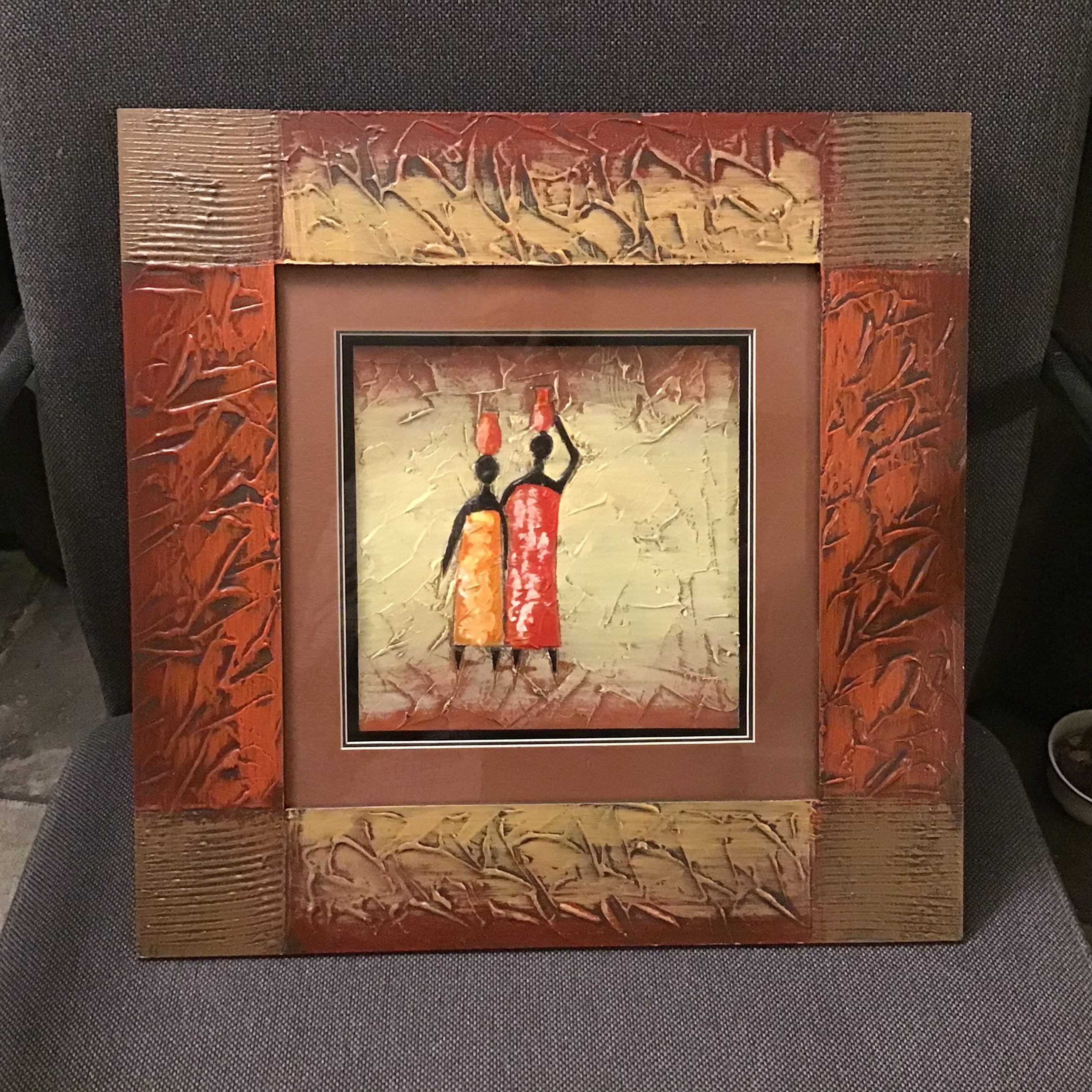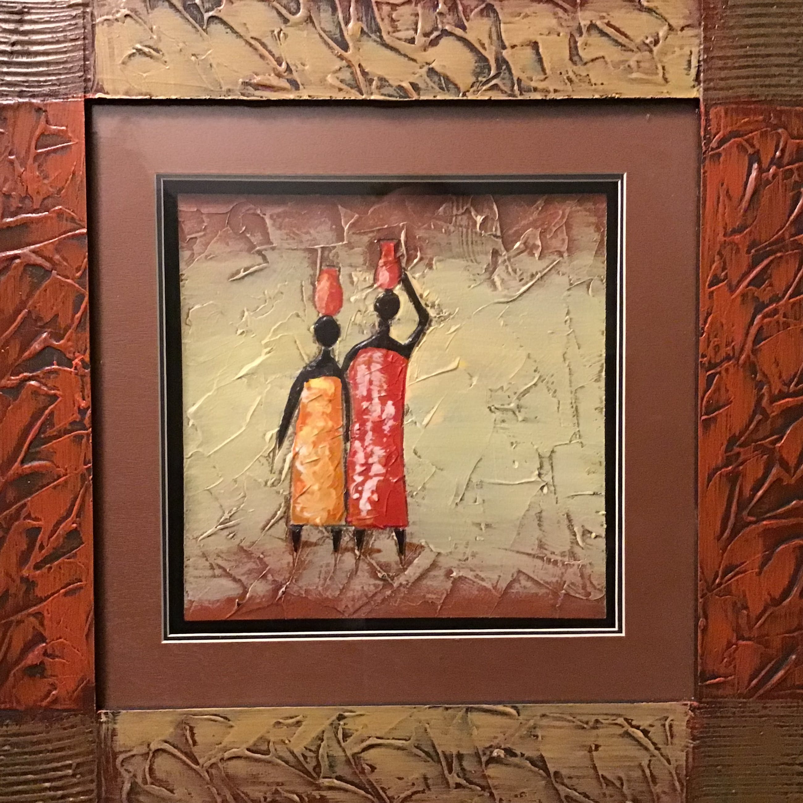 Twee waterdragende Afrikaanse vrouwen. In passepartout achter glas in een soort kistje ingelijst in. Heeft dieptewerking.