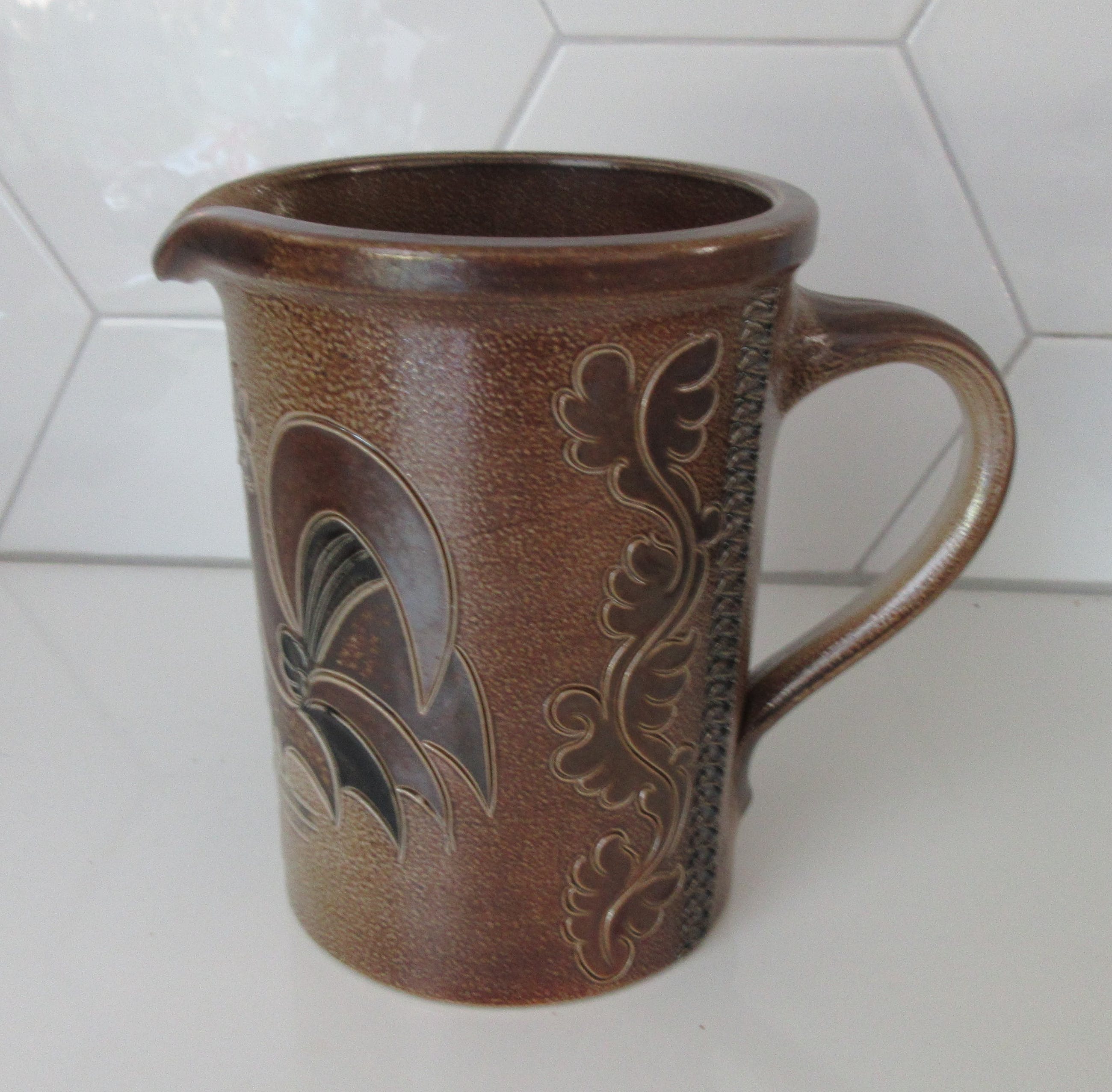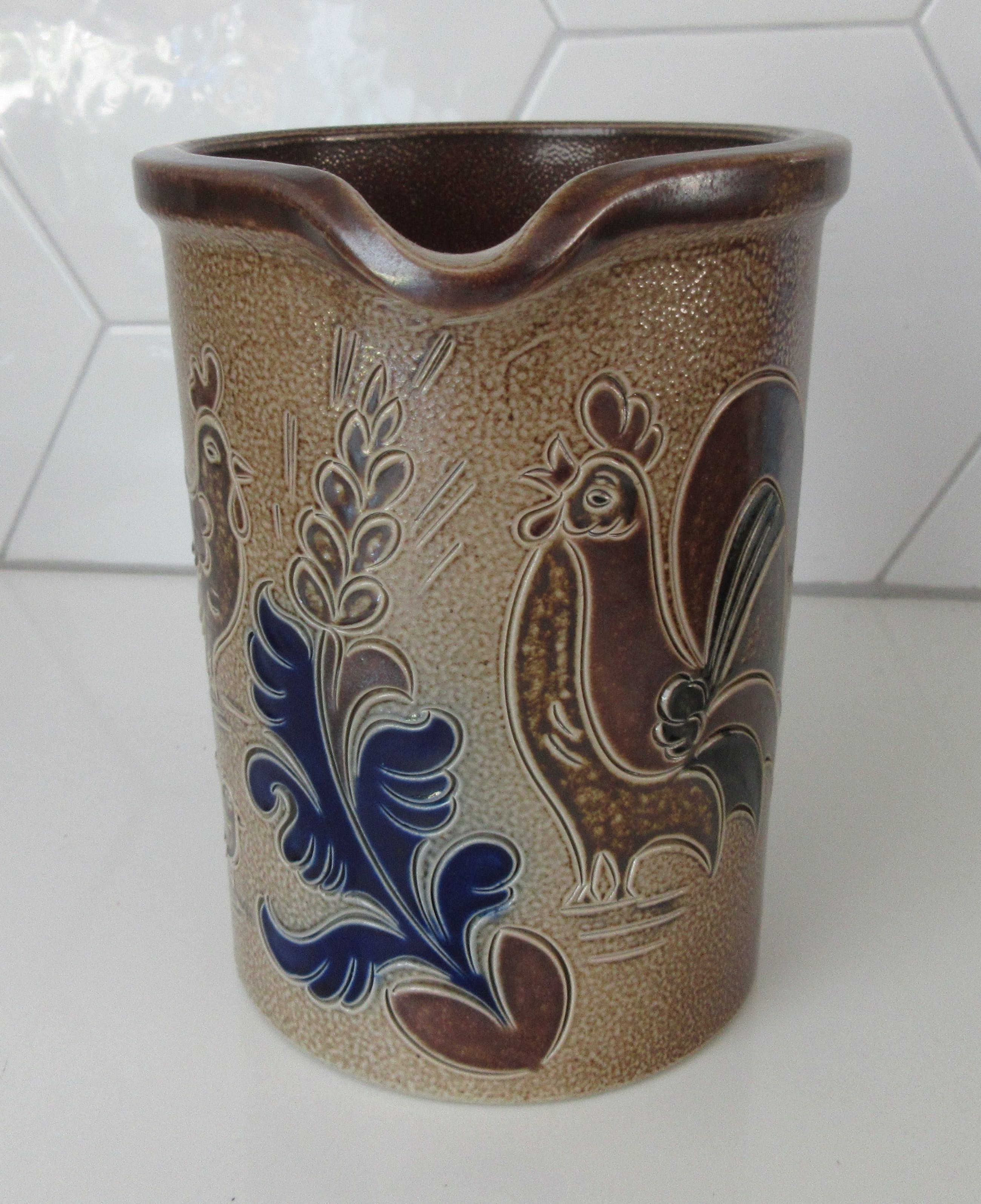 Westerwalder steengoed waterkan voorzien van zoutglazuur en blauw incisie decor. Het de hand gemerkt aan de achterzijde.