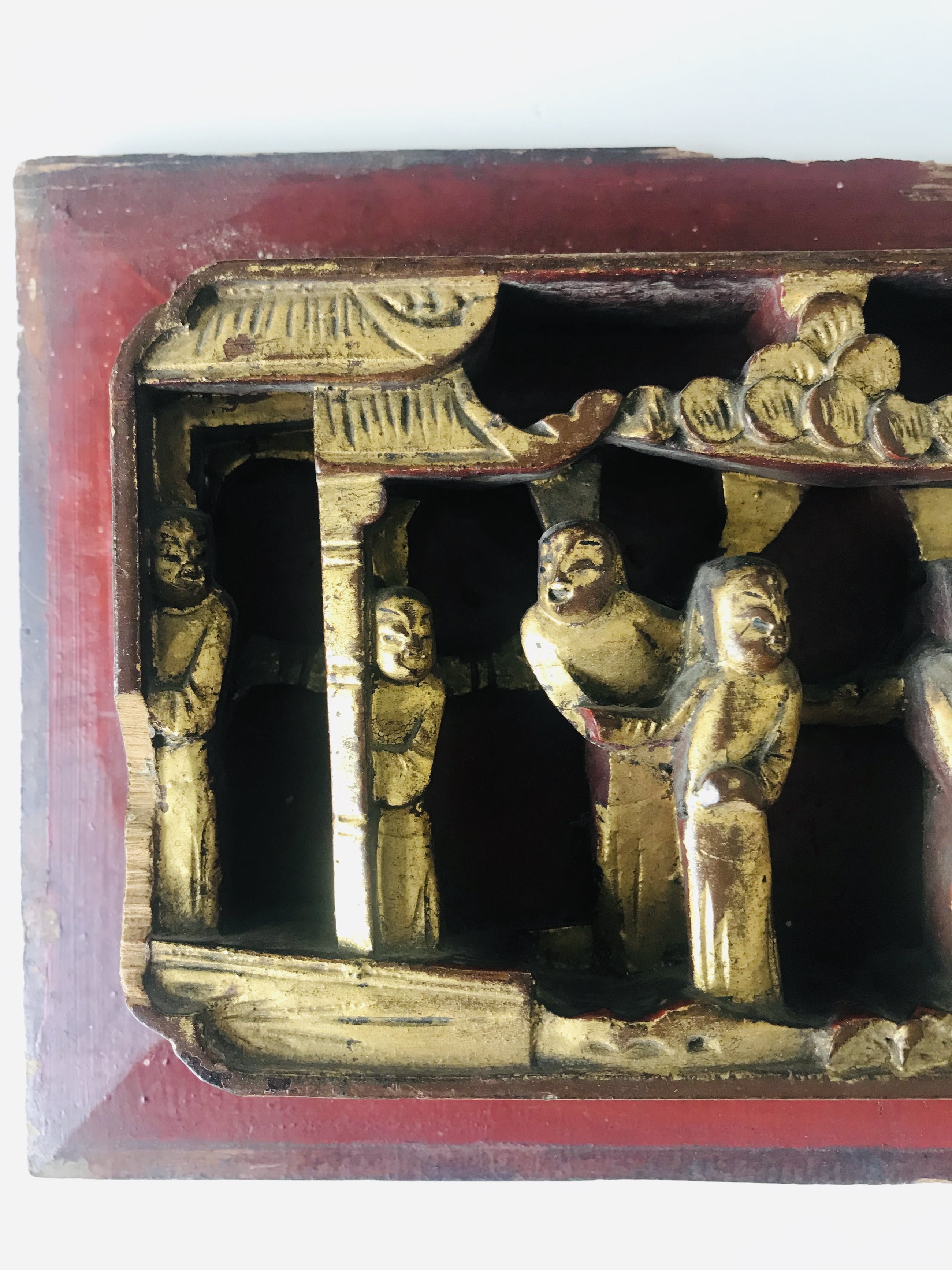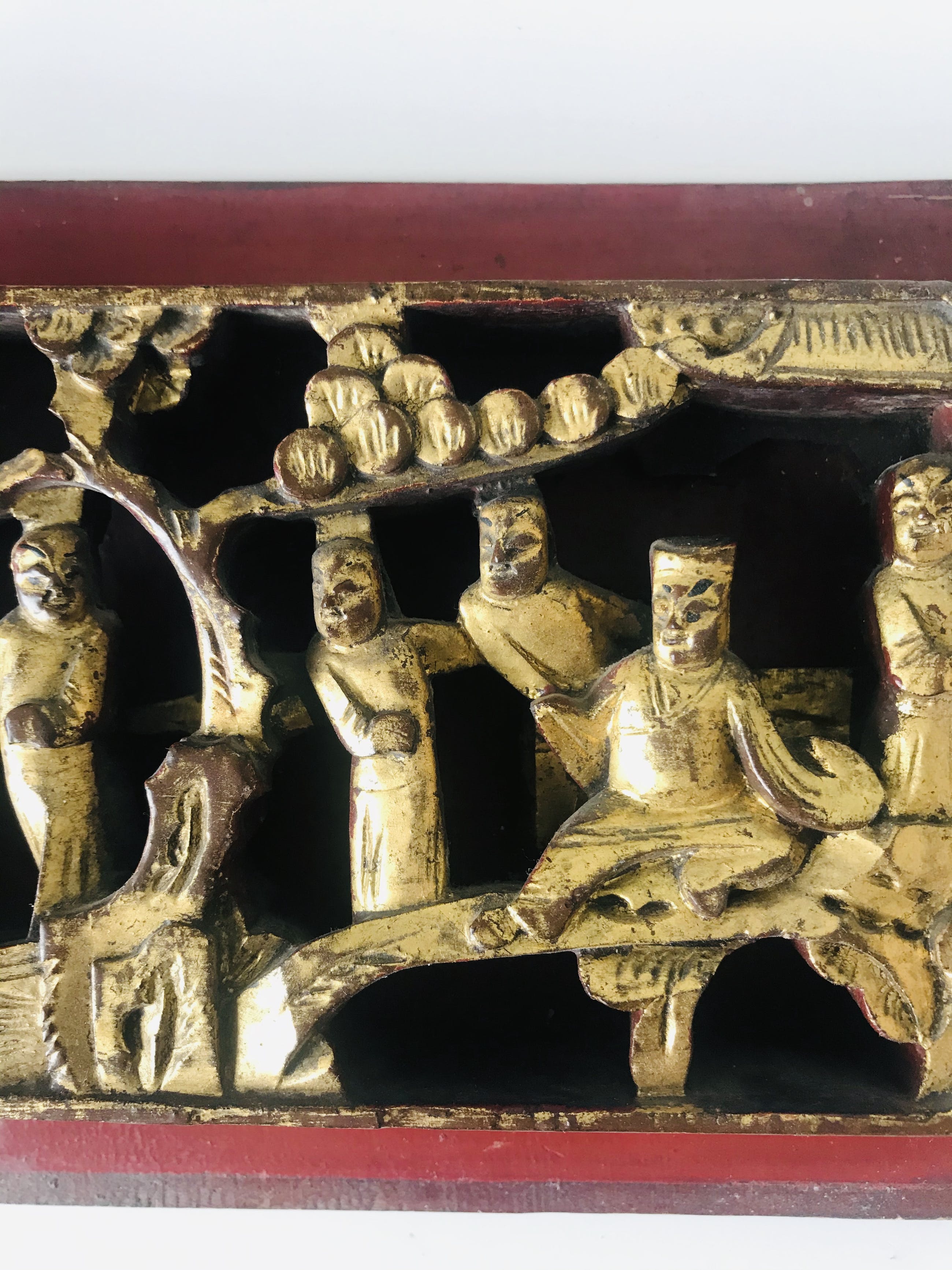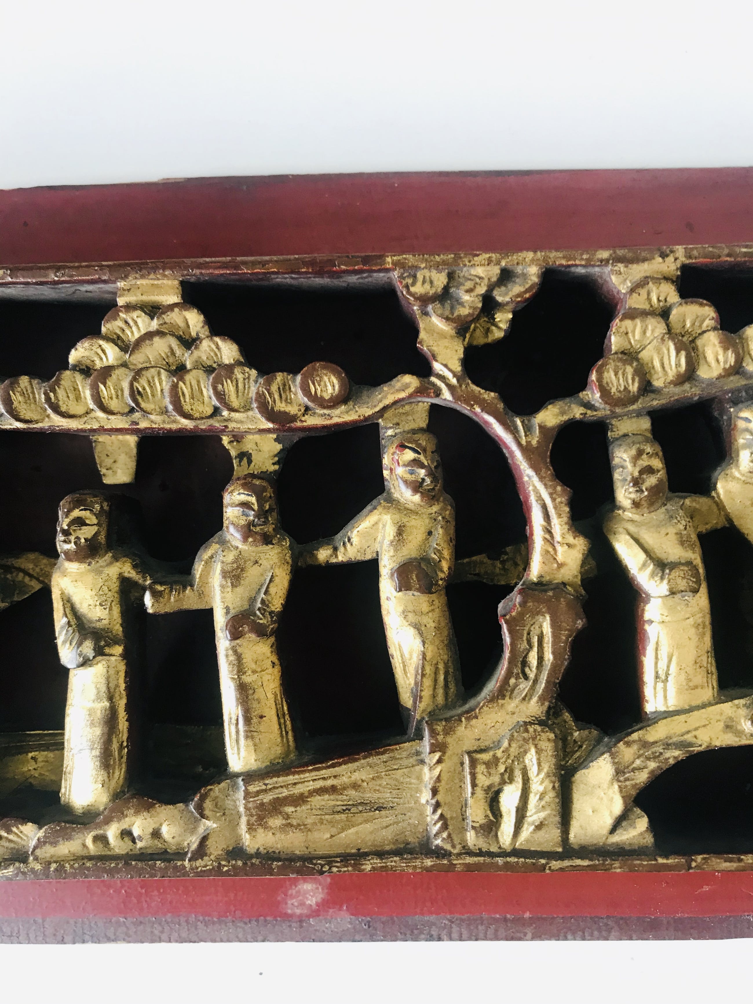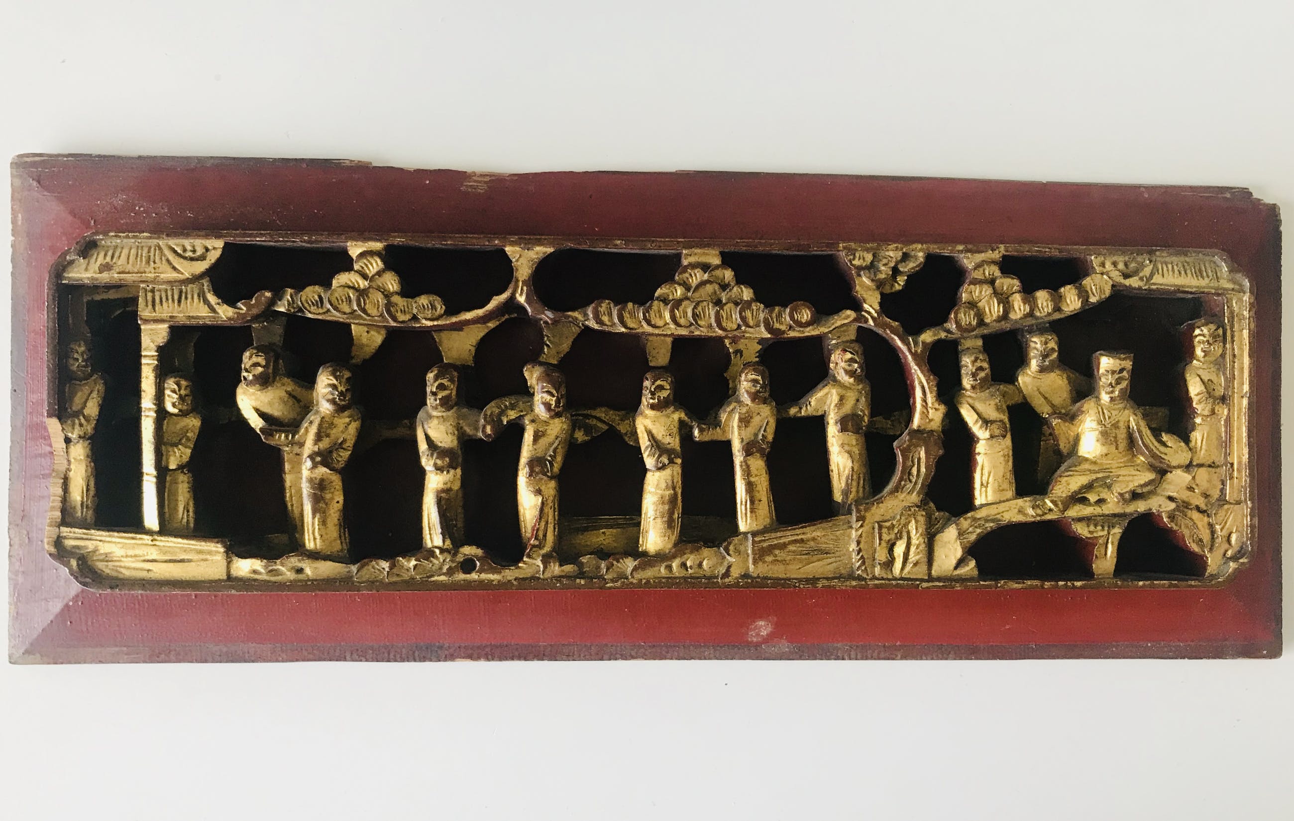 China - late Qing dynasty (1644-1913) driedimensionaal Chinees houtsnijwerk voorstellende een wijsgeer met zijn pupillen in een tuin. Vergulde figuren op een gelakt paneel.