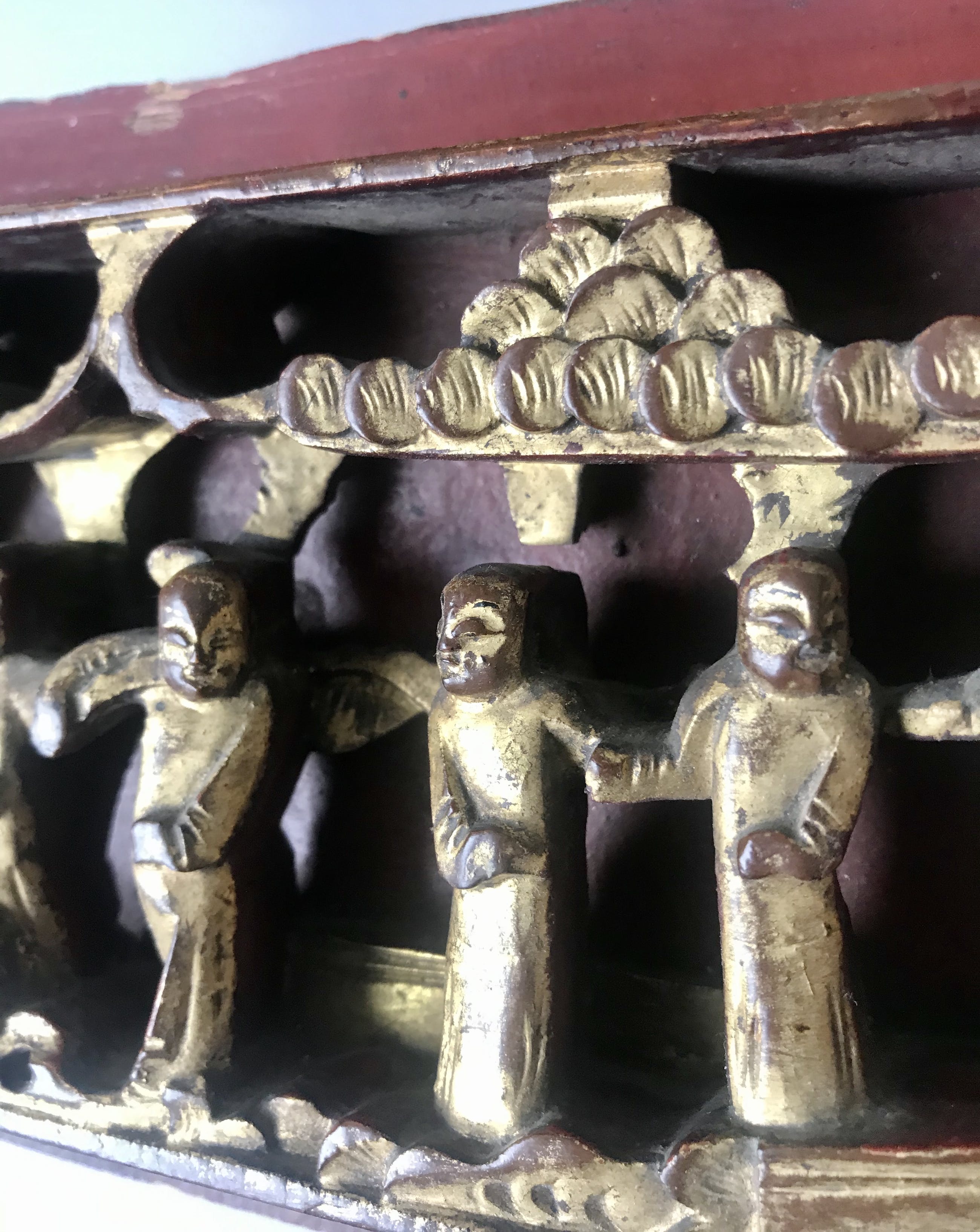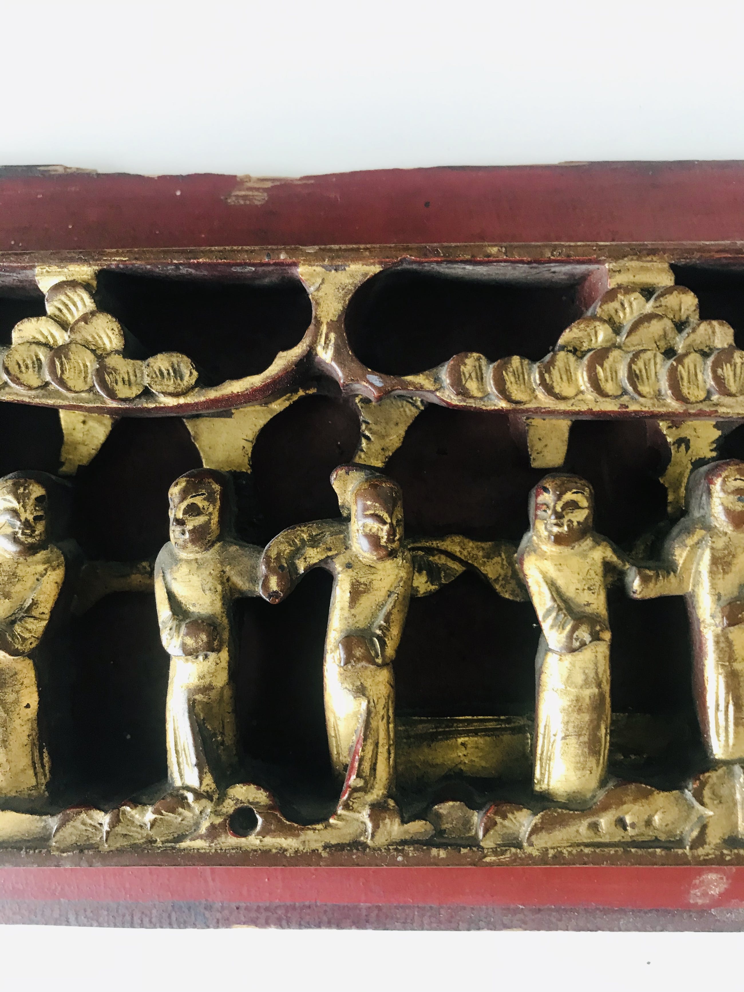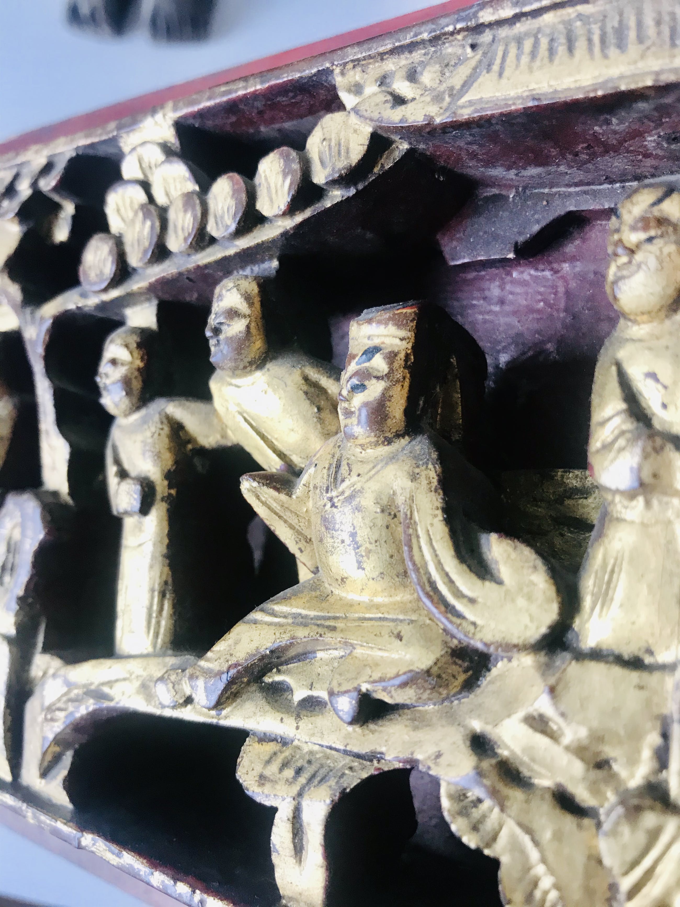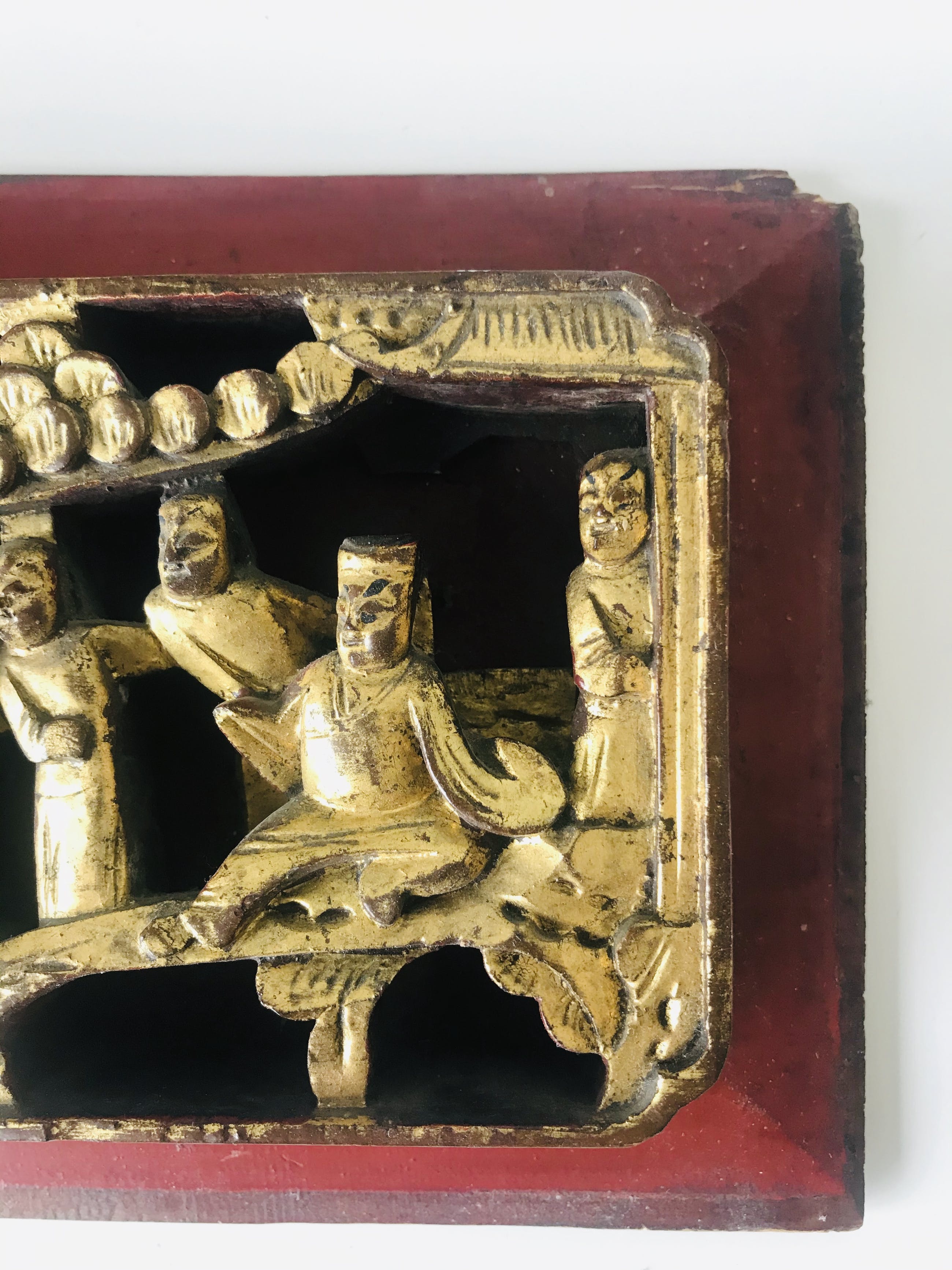 China - late Qing dynasty (1644-1913) driedimensionaal Chinees houtsnijwerk voorstellende een wijsgeer met zijn pupillen in een tuin. Vergulde figuren op een gelakt paneel.