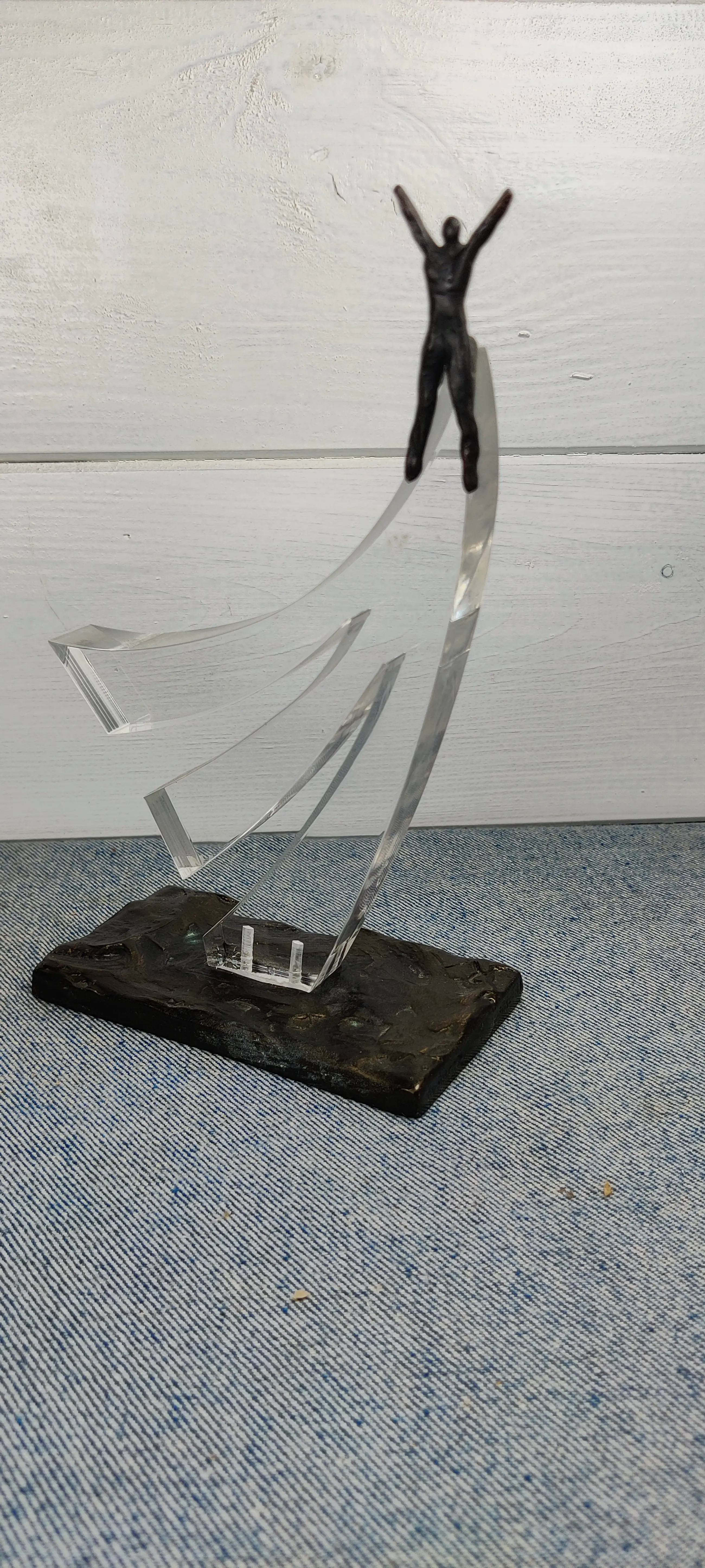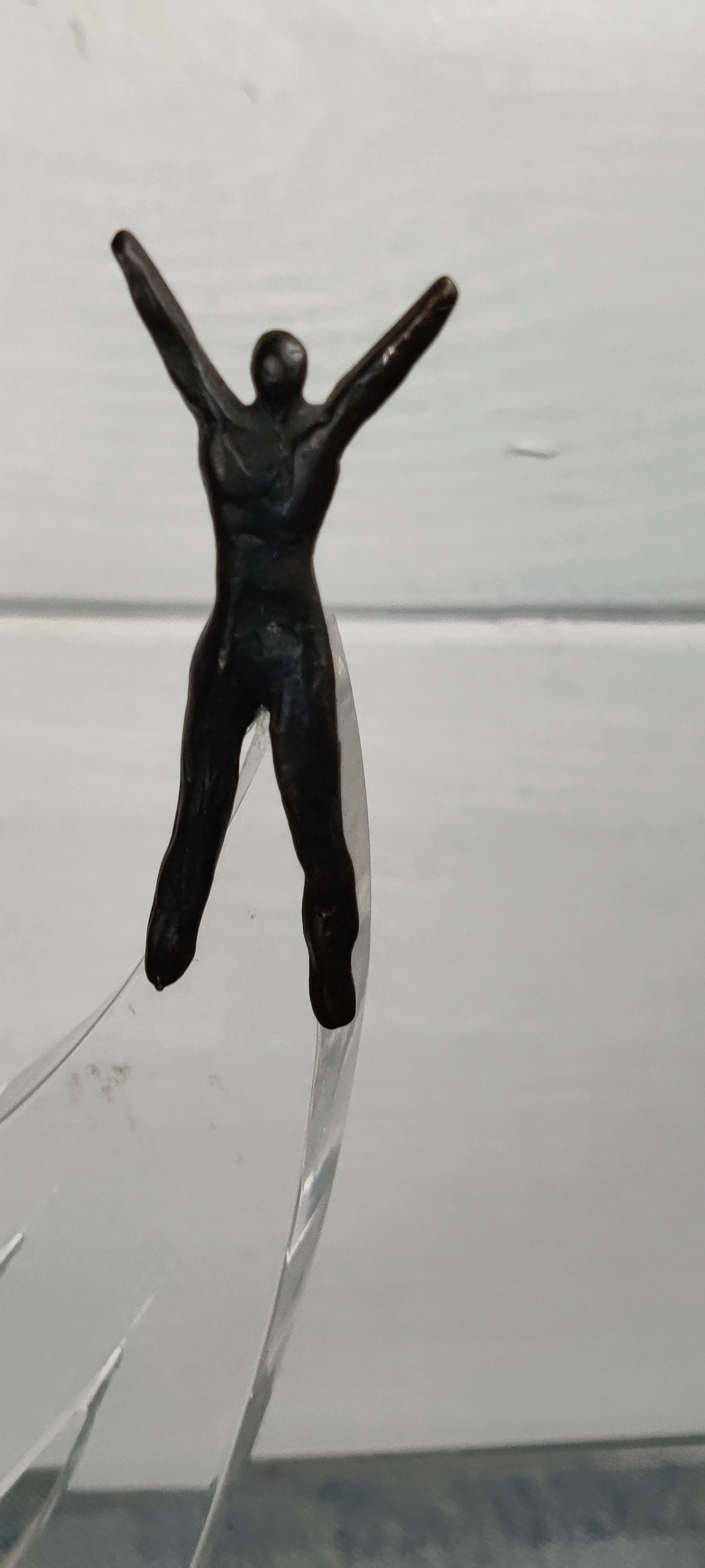 Zeer unieke vintage beeldje 'De Winnaar' door gemaakt van brons op een plexiglas plaatje.