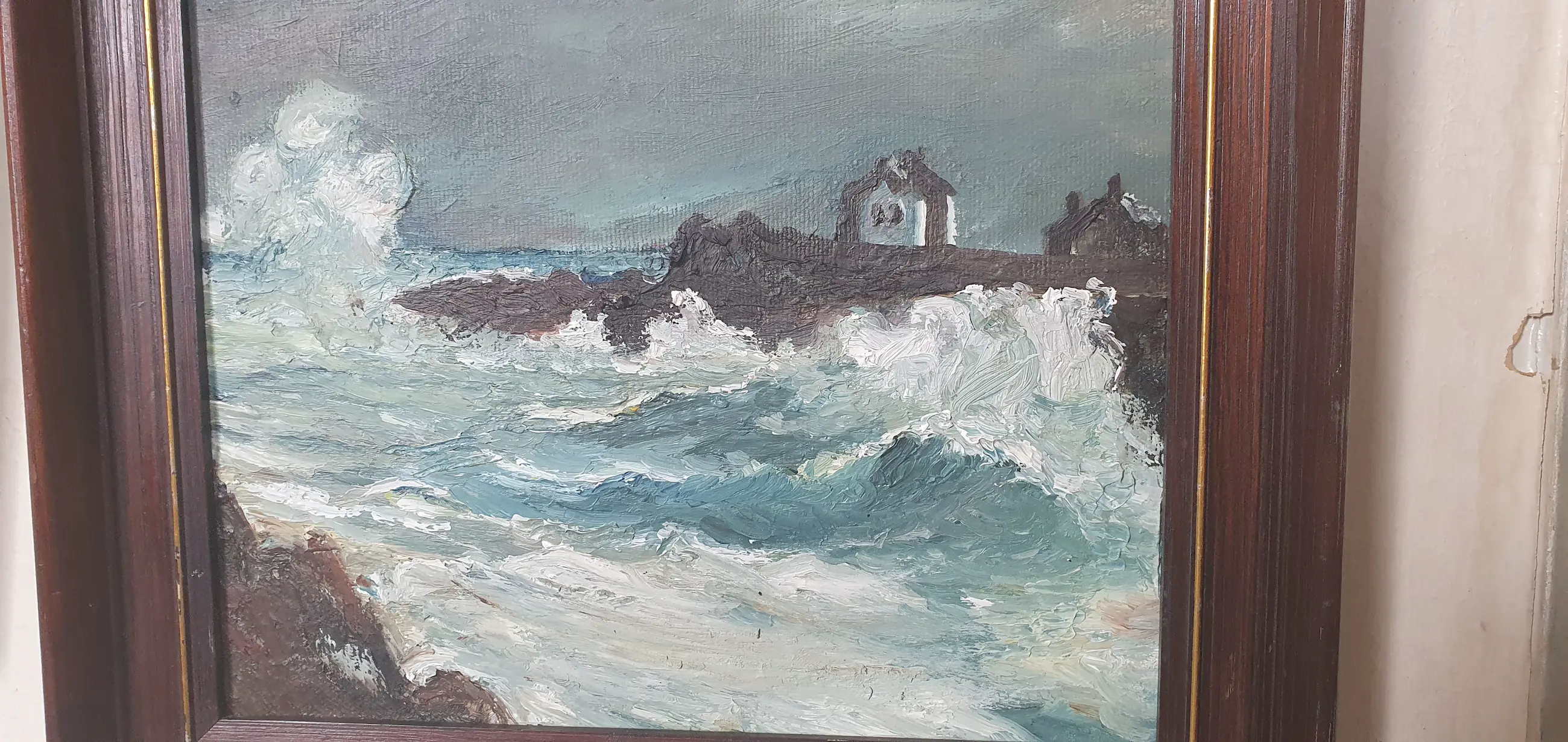 Klein en toch zeer fijn zou ik dit schilderij willen omschrijven, van een zware storm die op een rotsachtige kust beukt. Het spuitende zeewater van de brekers links en het kolkende van de woeste baren rechts is magnifiek uitgevoerd. De visserswoning wordt schel belicht zoals dat is als de zon heeel eventjes doorbreekt tijdens de hel op aarde. Ook het rechter huisje heeft het zwaar te verduren. Diabolesk van sneeuw en hagel beladen is de dreigende lucht aan de horizon. Het belooft alleen maar erger of... beter want je ziet wat blauw in de lucht. Een zeer stemmig genrestuk van een onbekende maar wel zeer vaardige schilder met verstand van zaken.