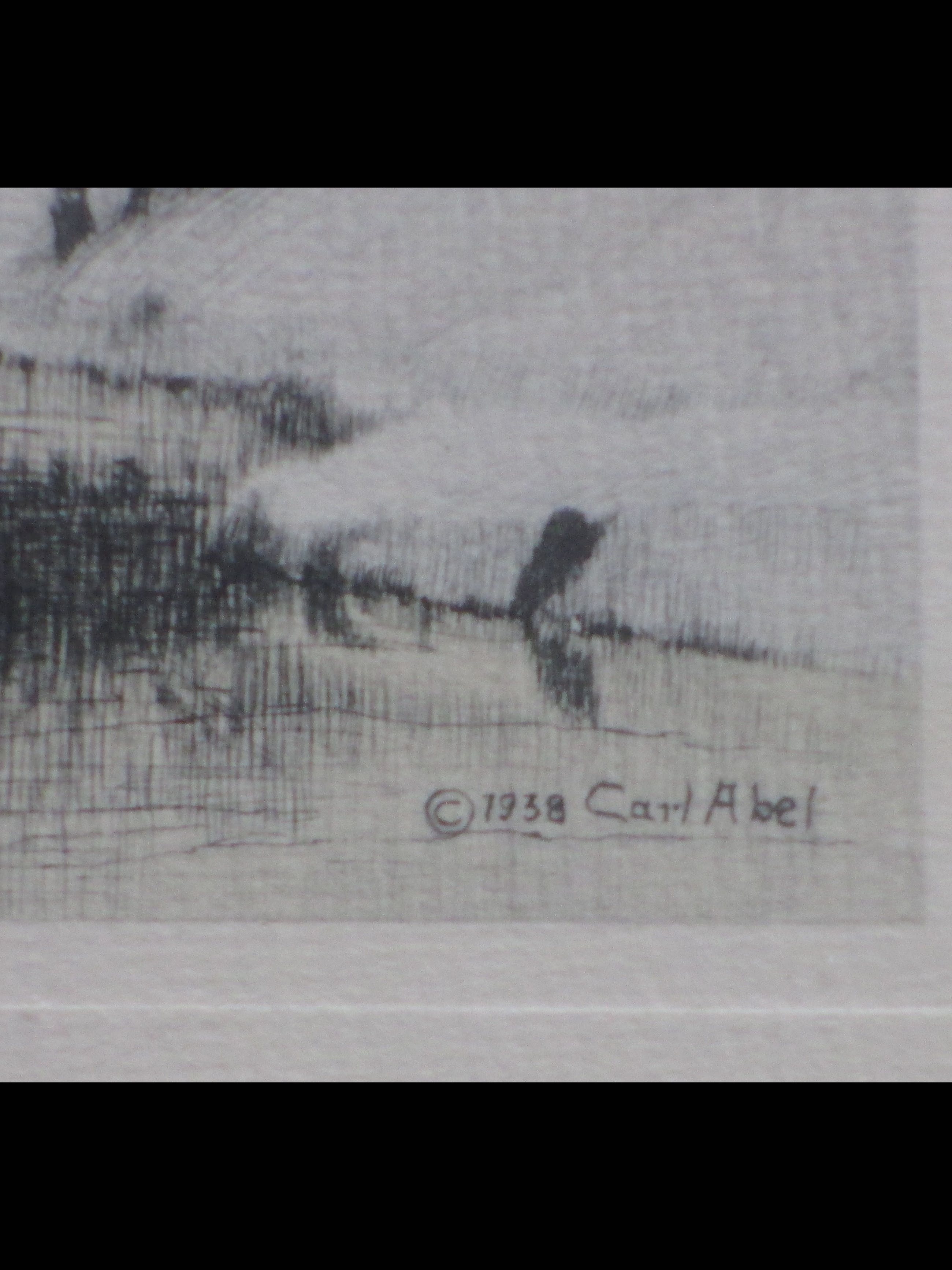 Ets door Carl AbelVoorstelling van winter in Central Park in New YorkOver het water kijkend naar het Z.O. zien we de hotels aan de Plaza (5th Avenue en 59th Street),met het silhouet van Chrysler gebouw in de verte.Fraai tijdsbeeldGelijst, beeldmaat 28x20, lijstmaat 46x38Gedateerd en gesigneerd in de druk r.o. ' 1938. Carl Abel' Werk van Abel wordt verhandeld op Amerikaanse veilingen, hoewel er nauwelijks informatie over hem te vinden is