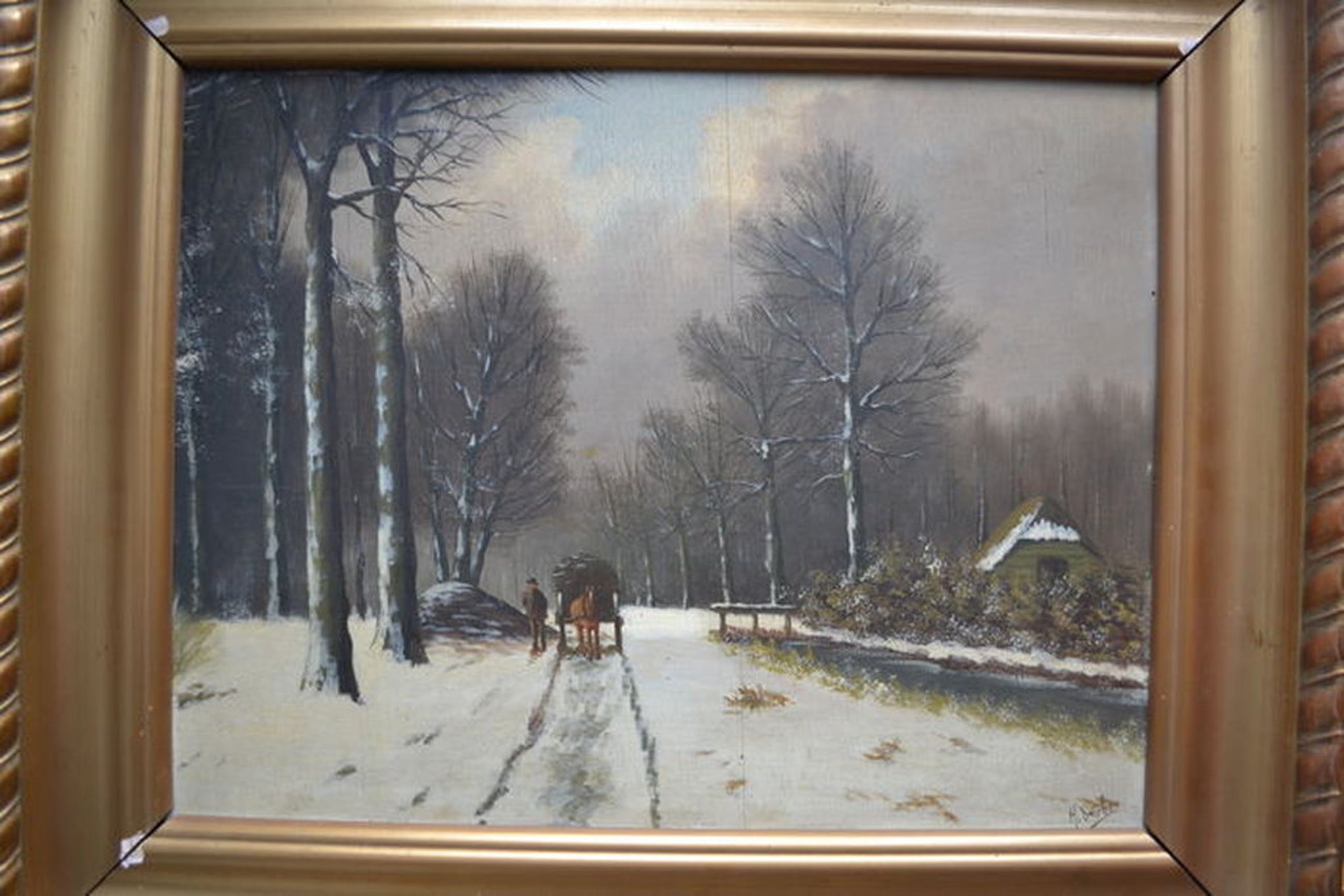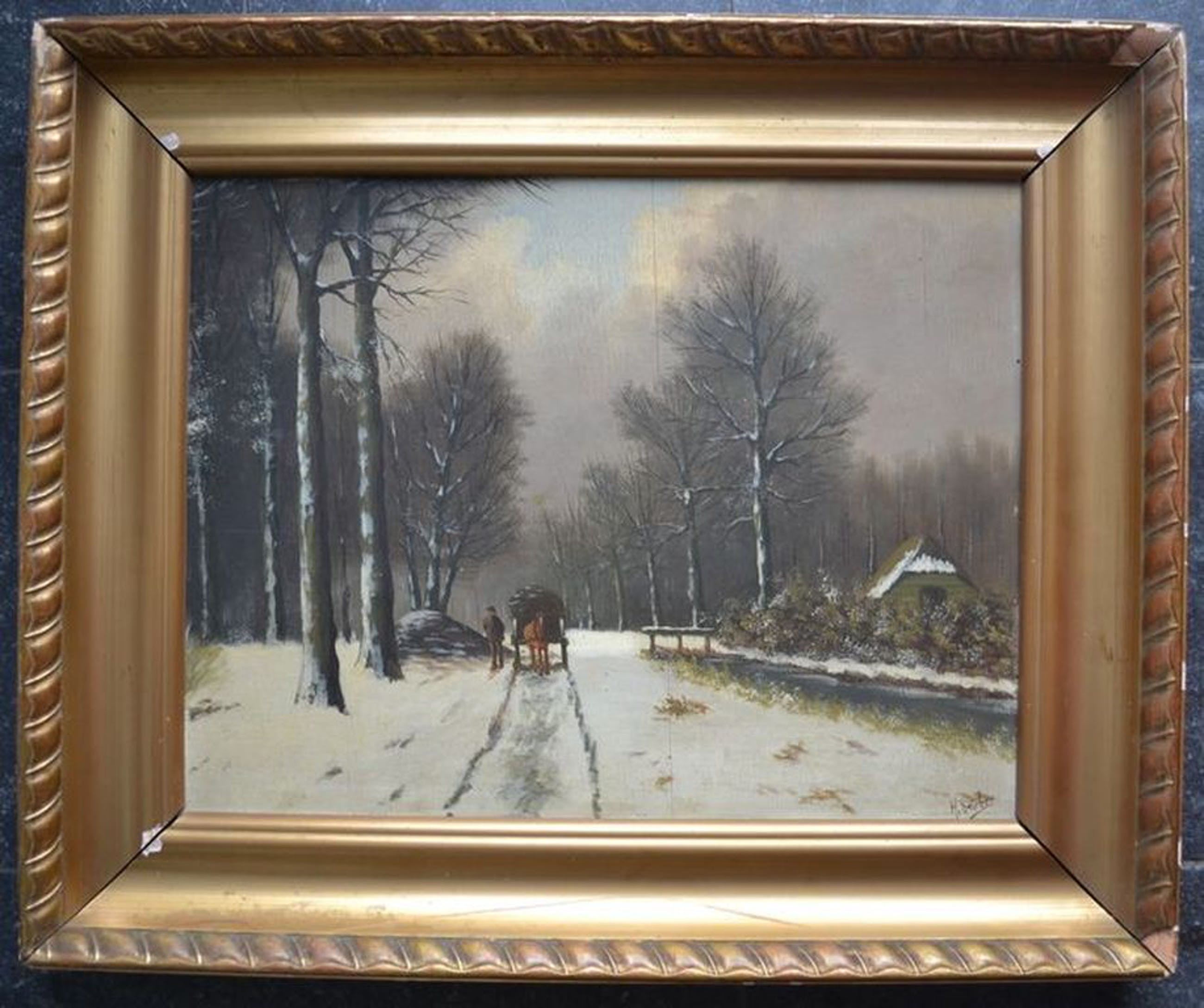 Leuk winterlandschap op houten paneel. Olieverf, 20ste eeuw. Rechtsonder gesigneerd. Lijst heeft op de hoeken enkele beschadigingen. Afmetingen lijst zijn 65cm x 54cm. Afmetingen paneel zijn ca 50cm x 40cm.