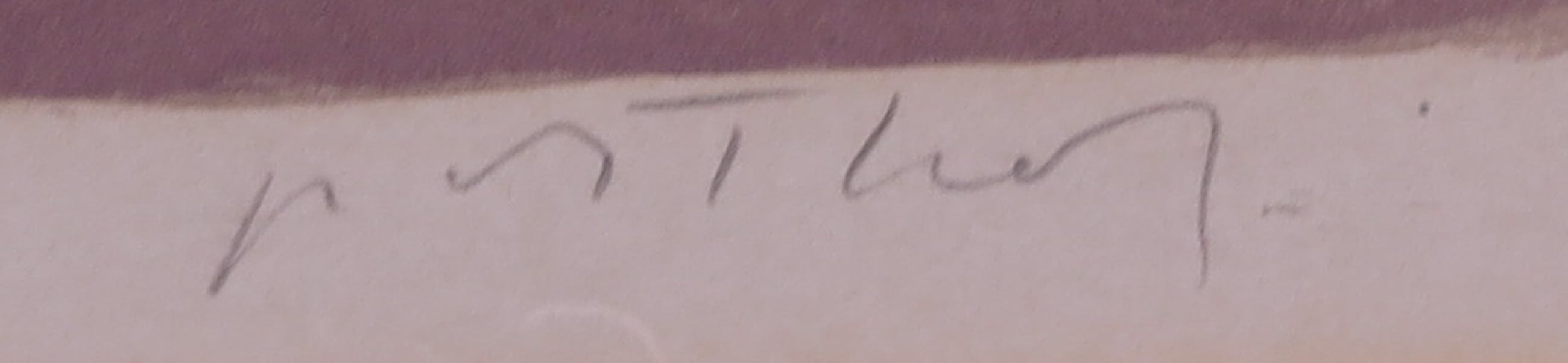 Het werk heeft een lichte golving en is enigszins verkleurd. Daarnaast is het passe-partout licht beschadigd hier en daar en het werk bevat geen glasplaat. | |