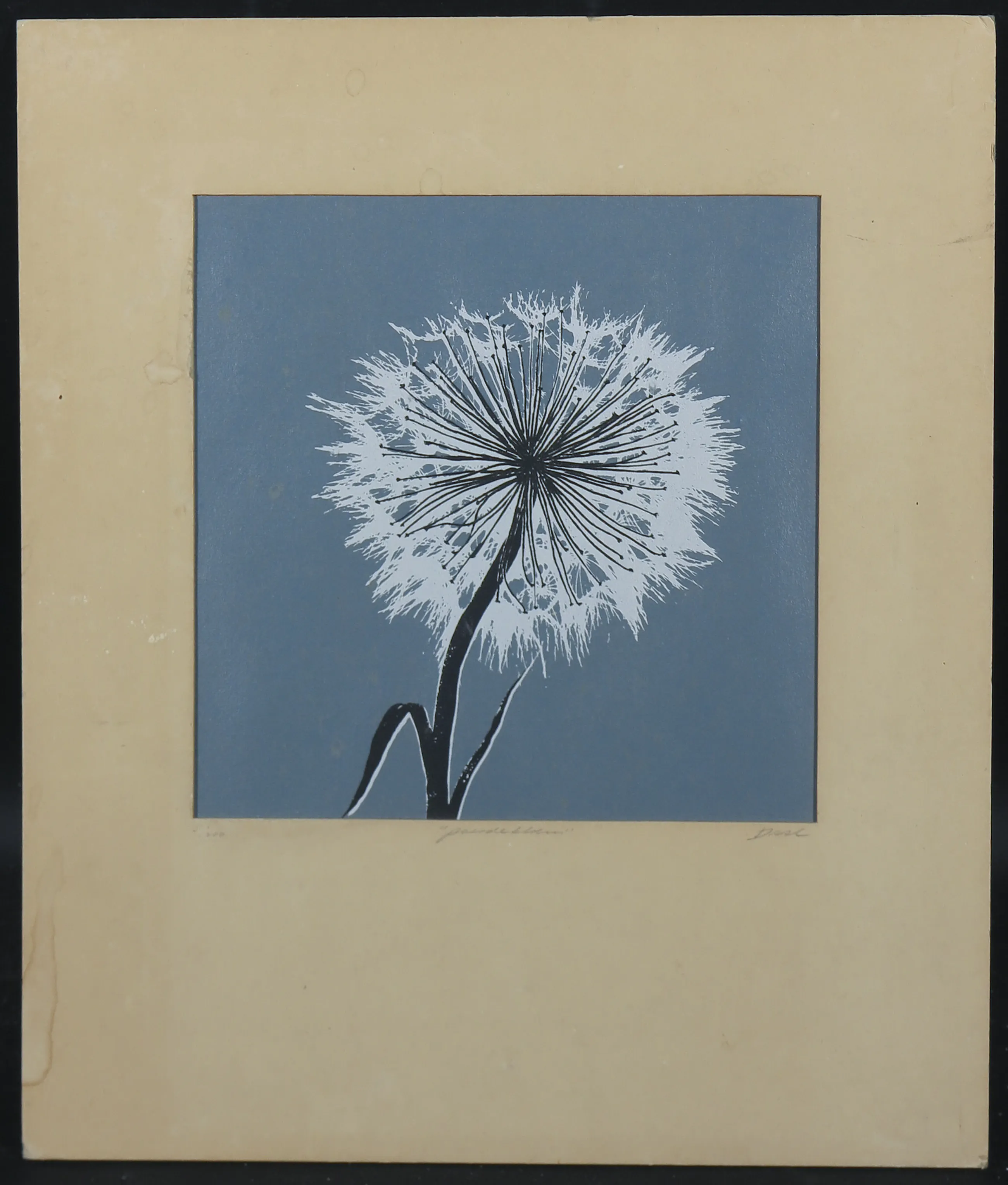 Enkele doffe plekjes in het werk (zichtbaar bij strijklicht). Passe-partout heeft verkleuringen. | |||||||||||
