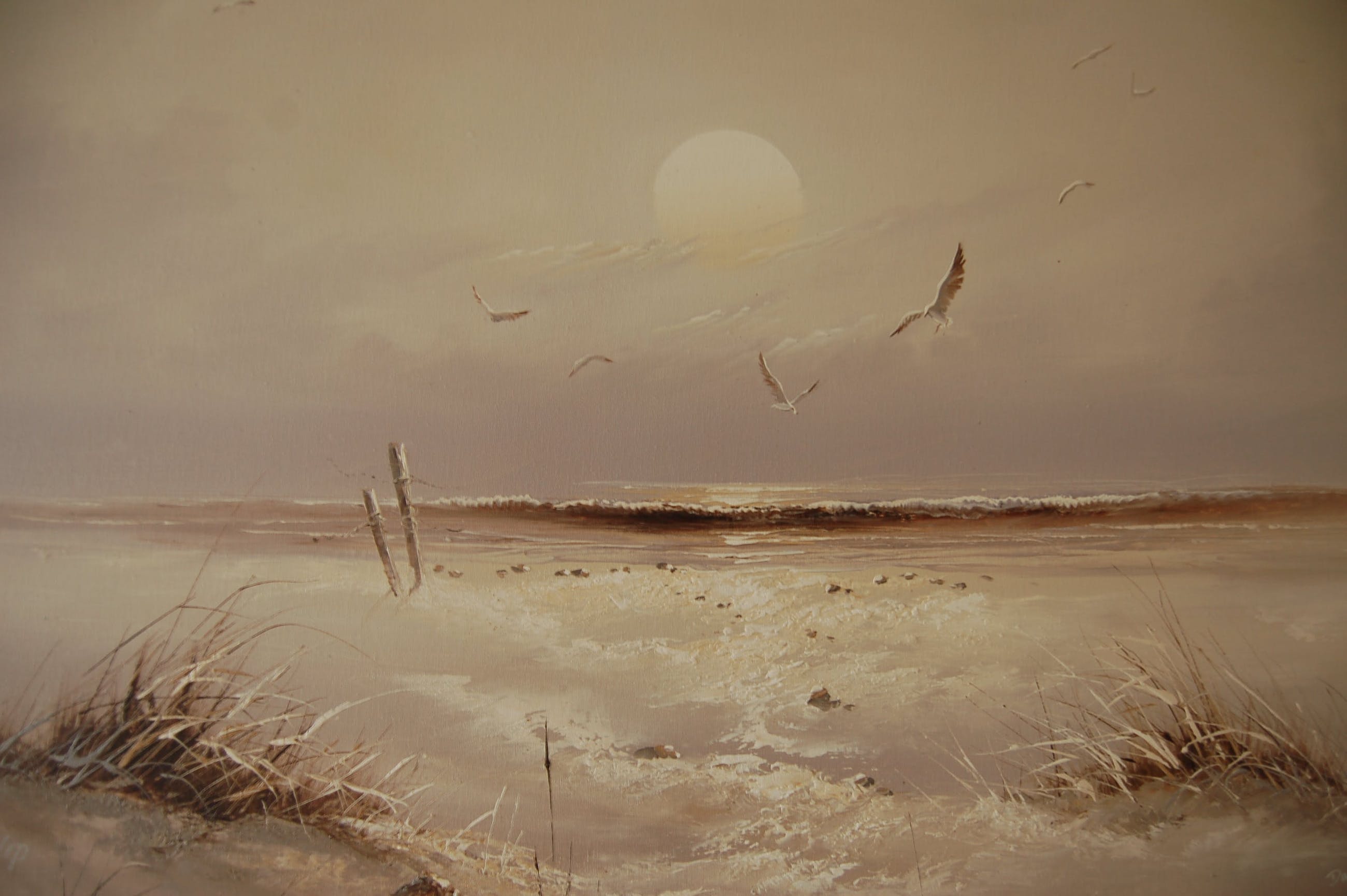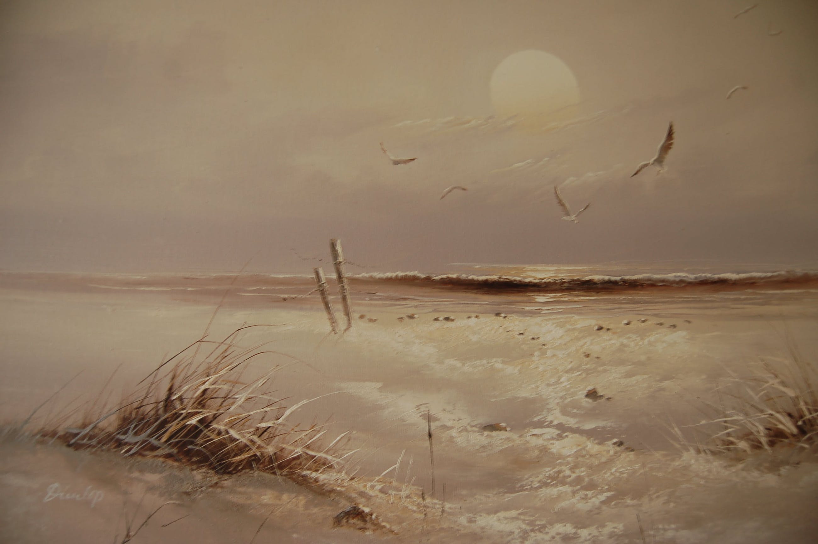 Een groot schilderij van een bruisende zee in de avondgloed, linksonder gesigneerd met Dunlop en rechtsonder met David.