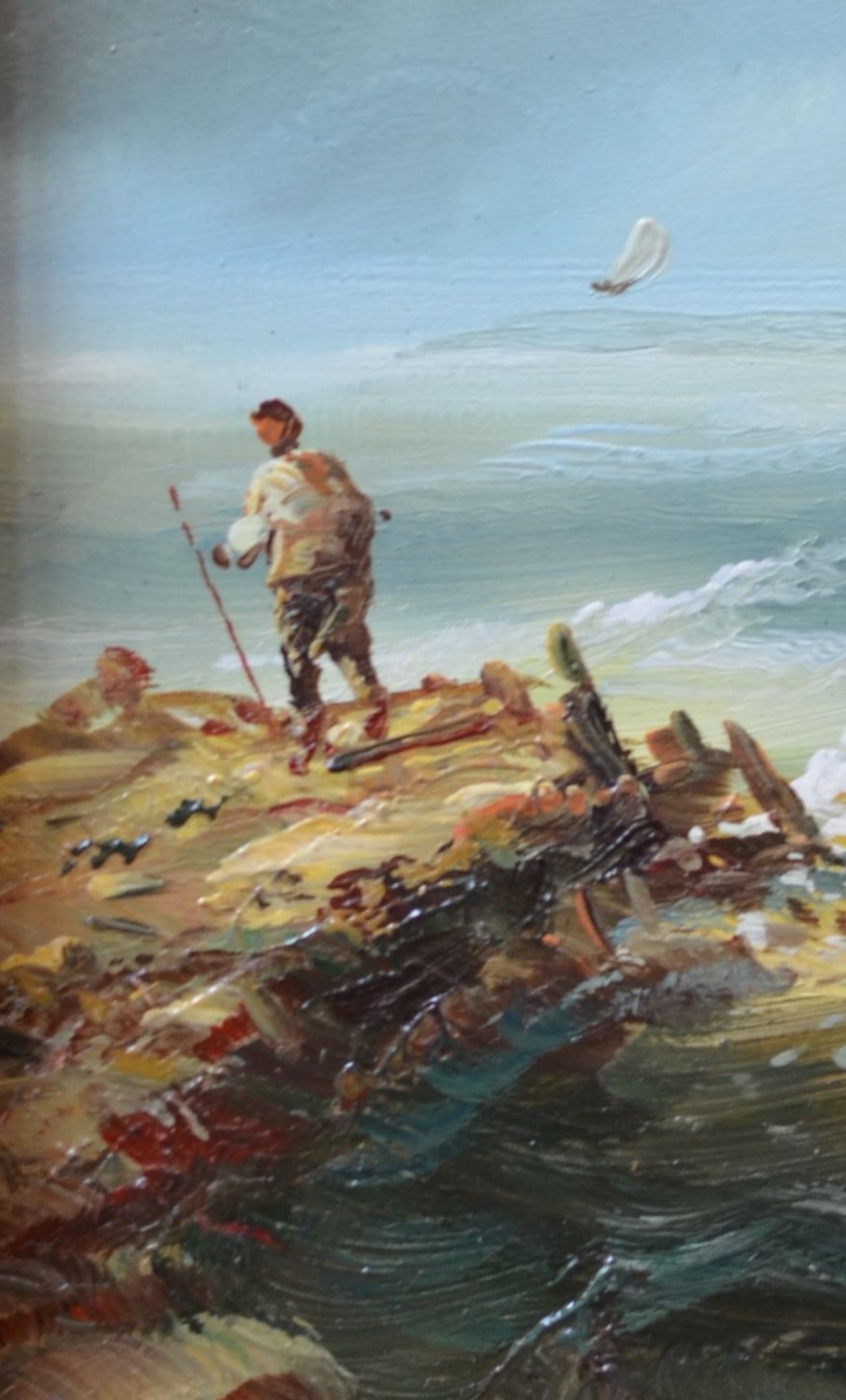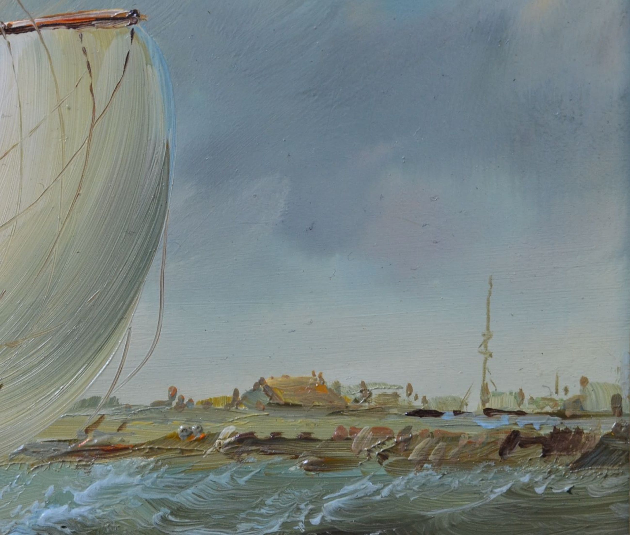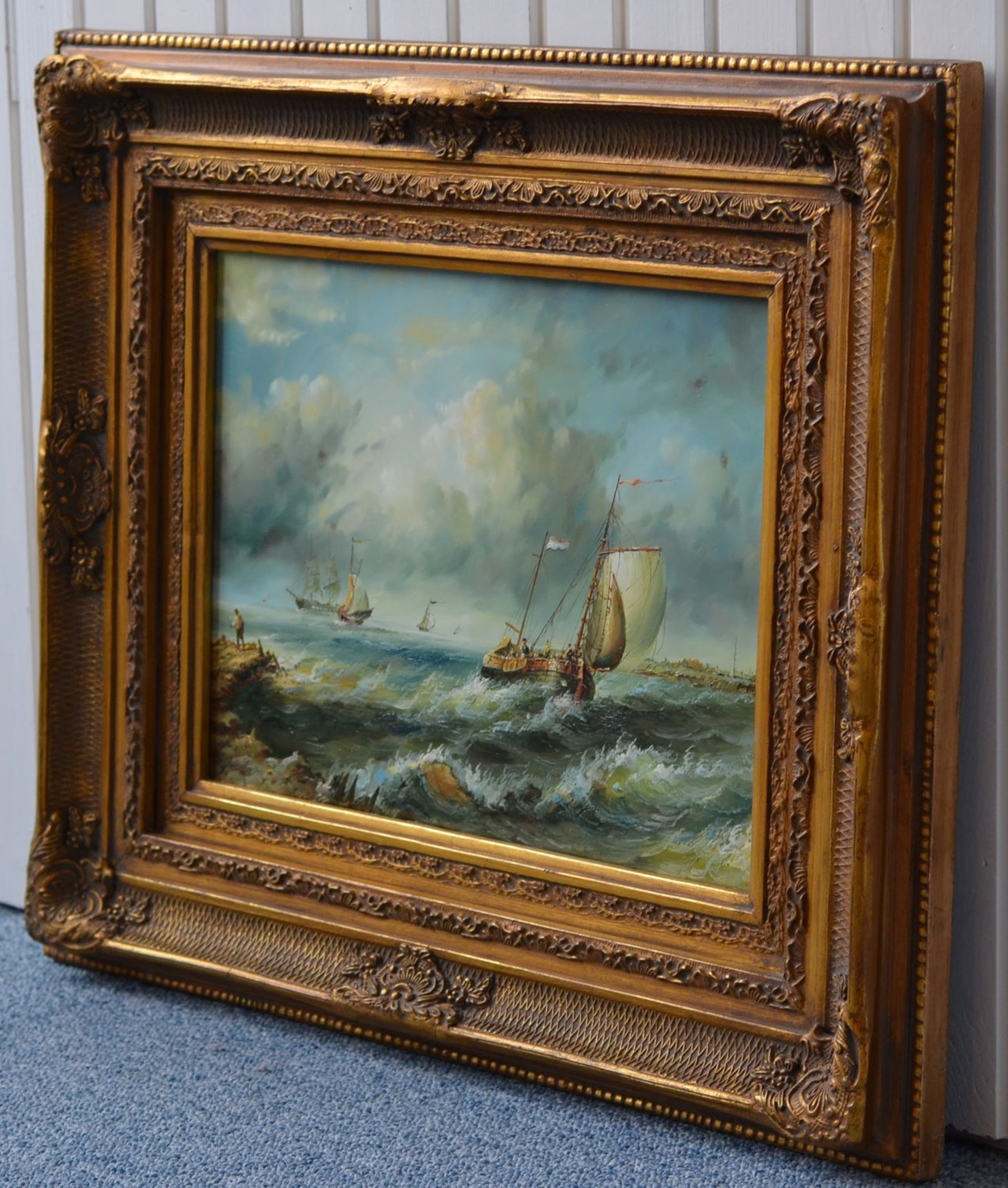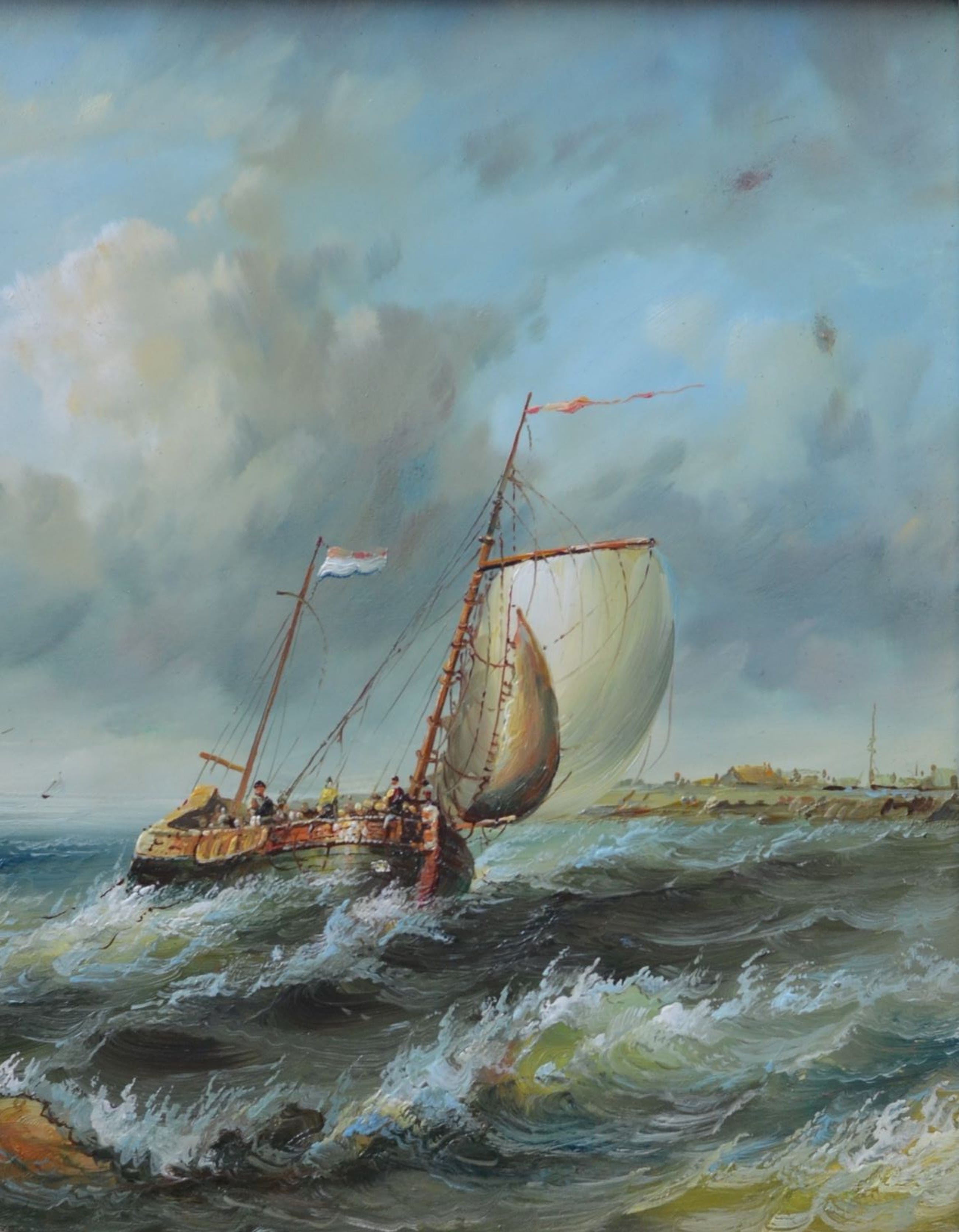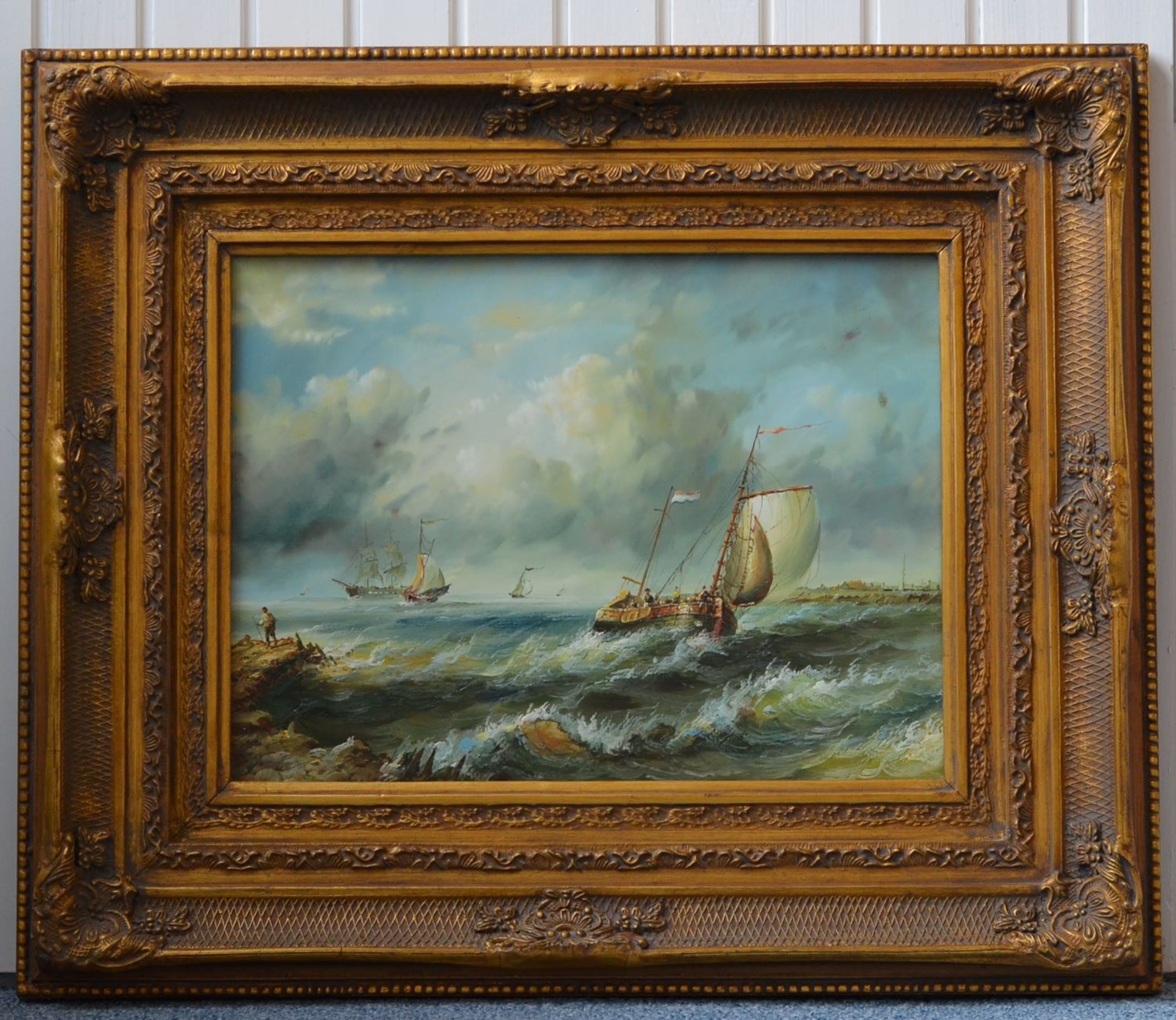 Een Hollands zeegezicht met diverse soorten zeilschepen op zee nabij een zeehaven. In de mast van het visserschip wappert de Nederlandse driekleur. Het schilderij is niet gesigneerd en vermoedelijk uit het einde van de twintigste eeuw. De mooie ornament lijst is van een degelijke kwaliteit.