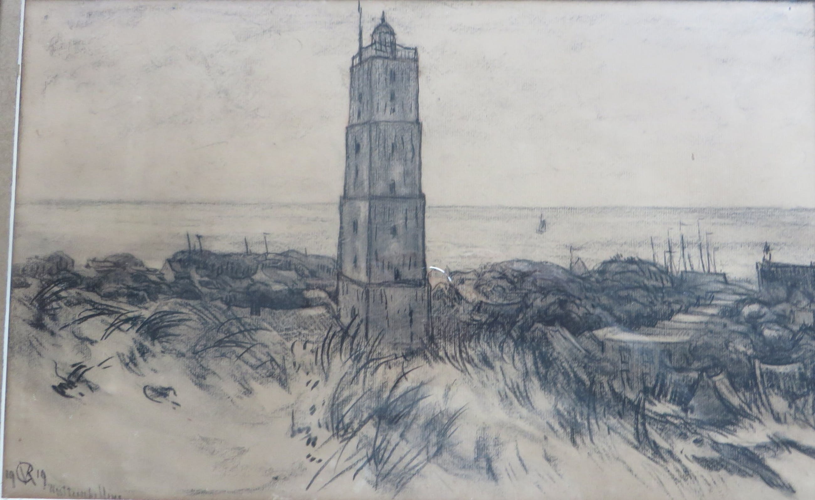 Zeegezicht met vuurtoren in de duinen en daarachter een dorp. Gemonogrammeerd: V.R. 1919.