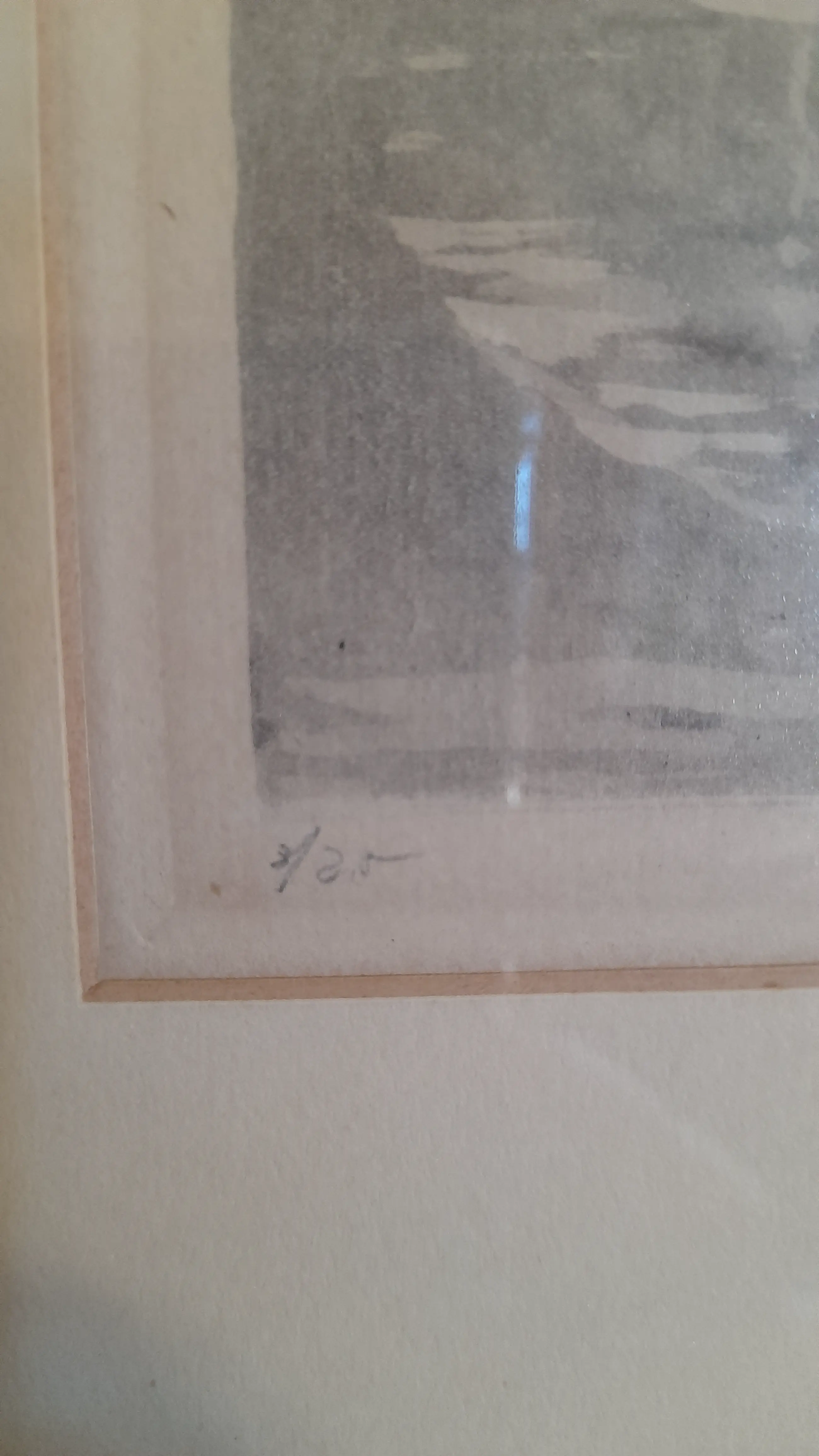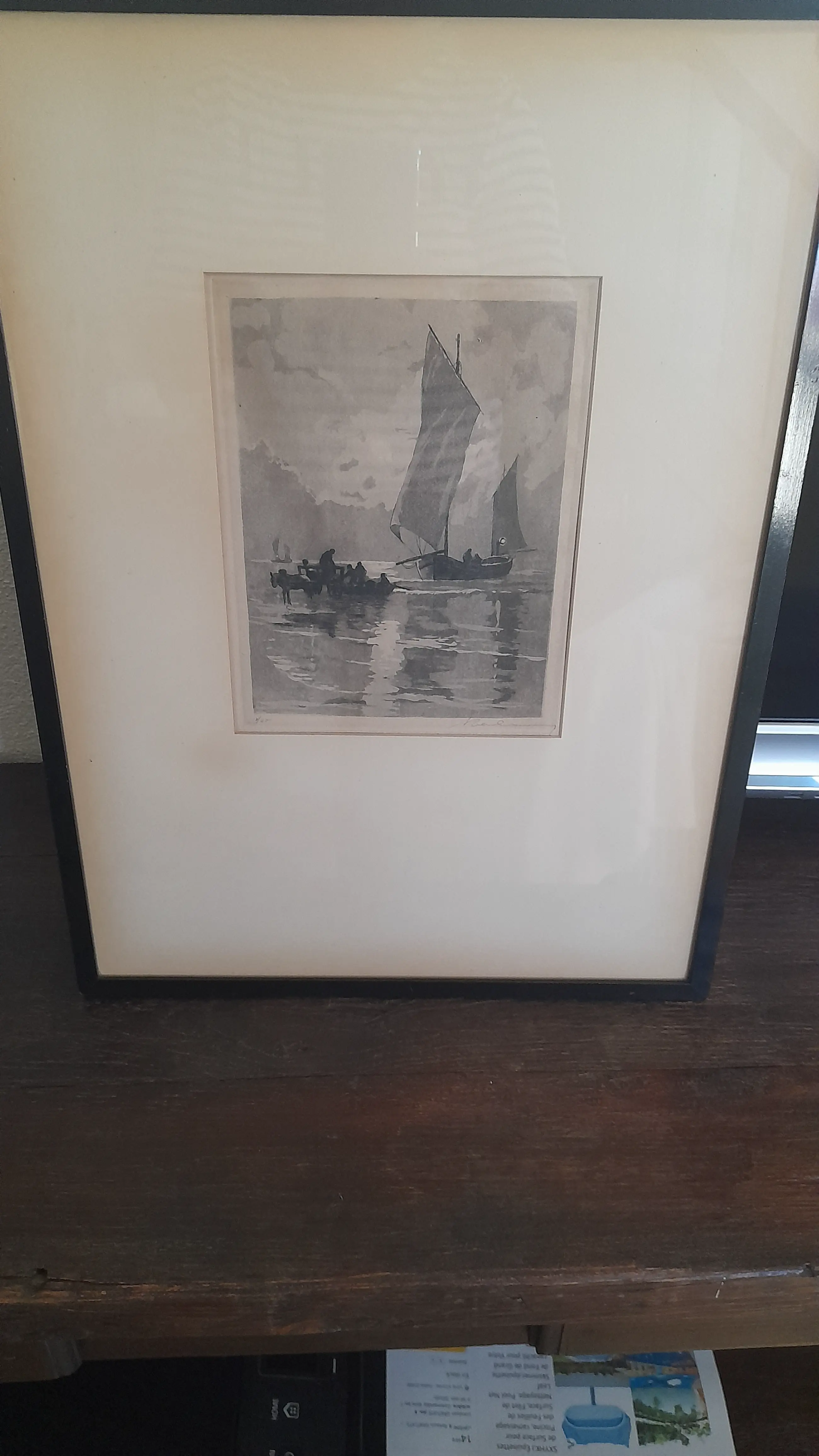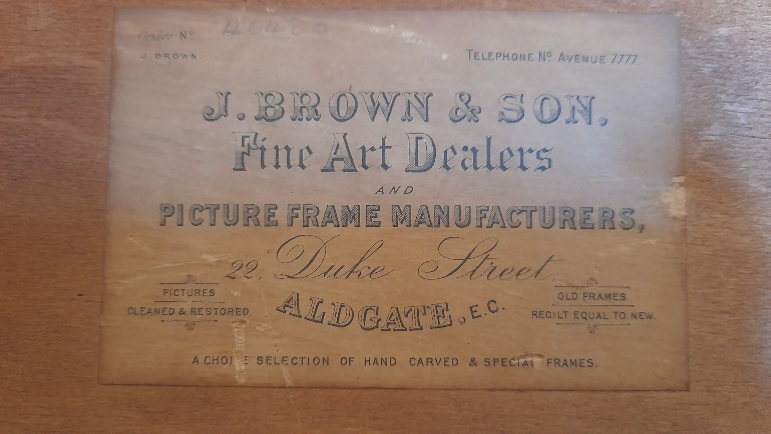 Het kunstwerk verkeert in goede staat.  Is achter glas ingelijst door J. Brown & Son, fine artdealers. Zie foto.