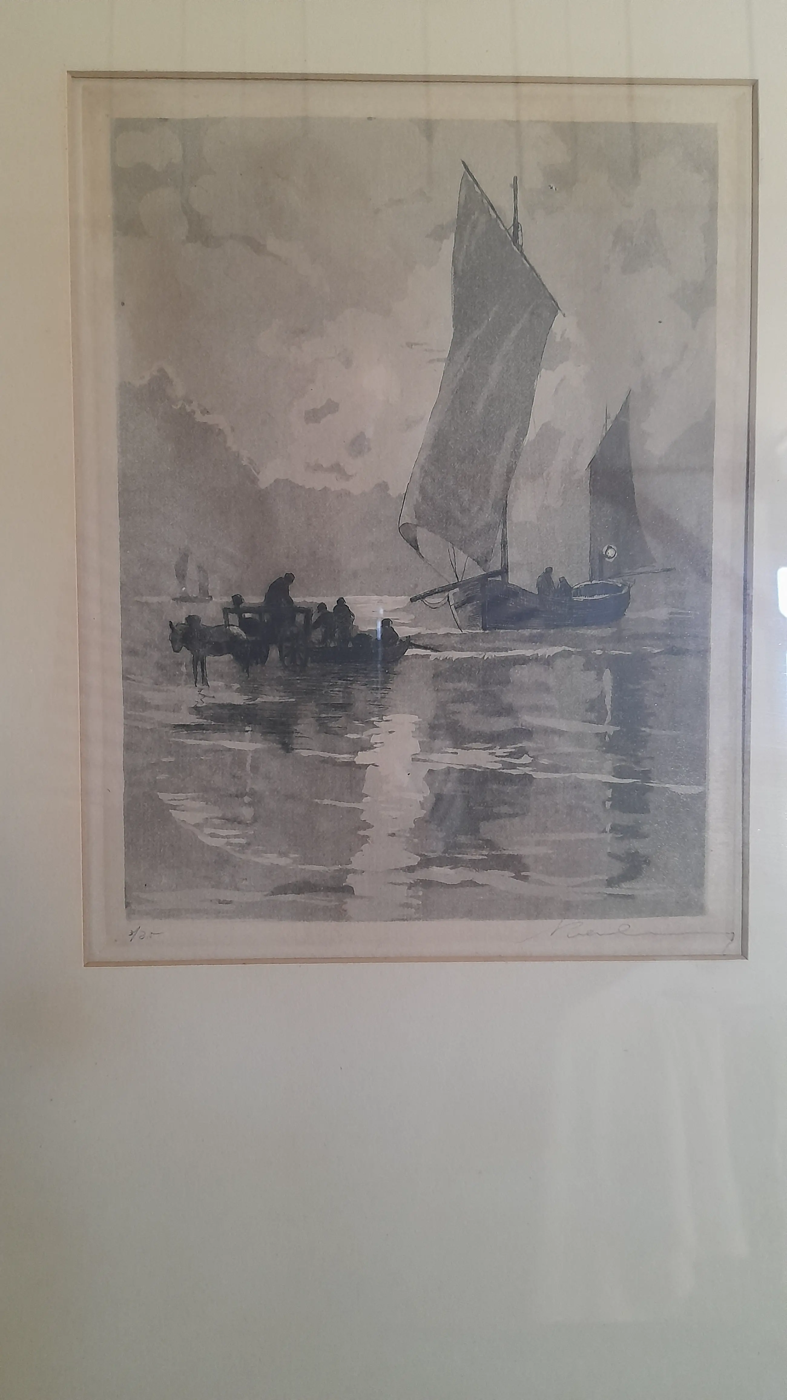 Mooie tekening in potlood/houtskool. Zeezicht met zeilboot en werkende mensen. Signatuur onleesbaar.
