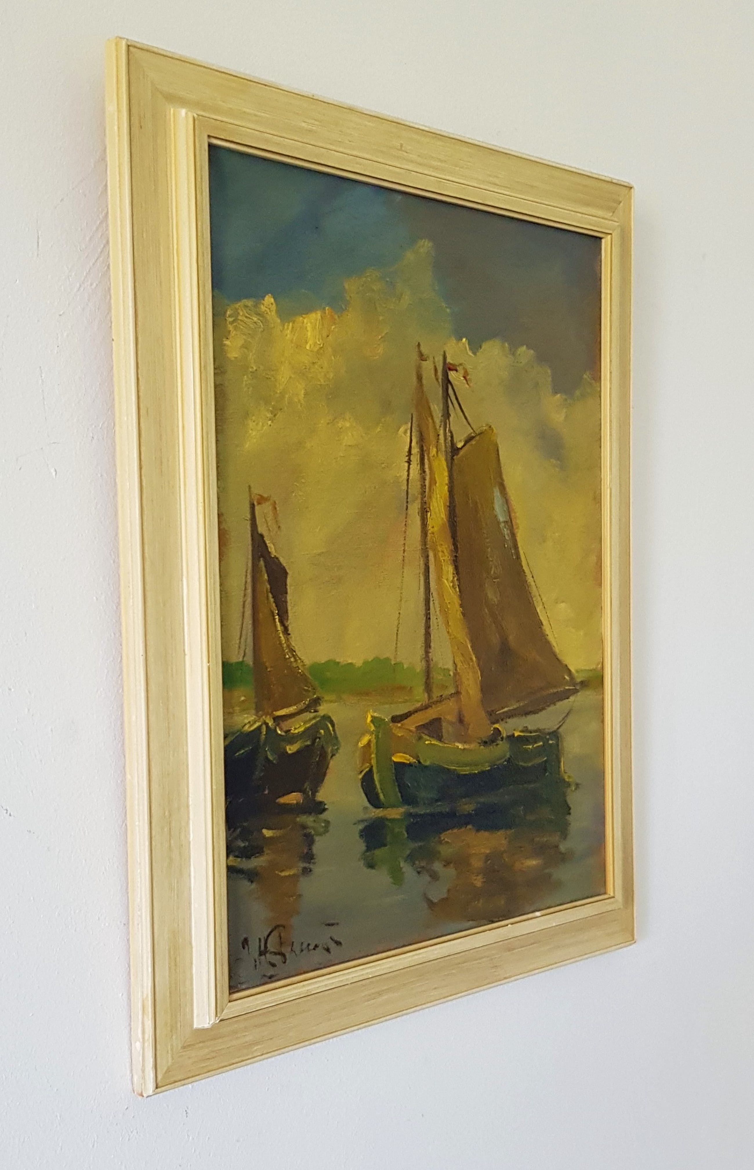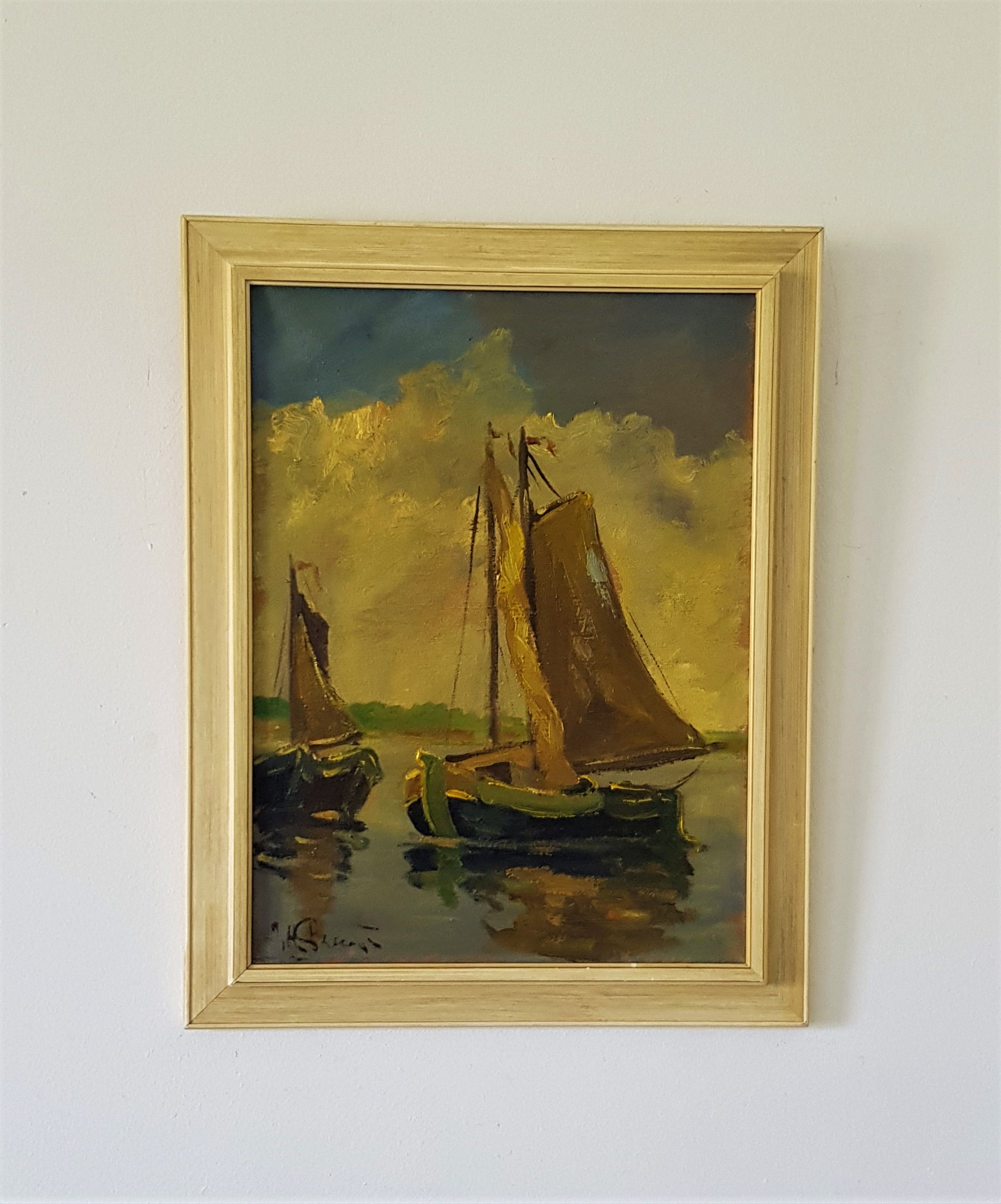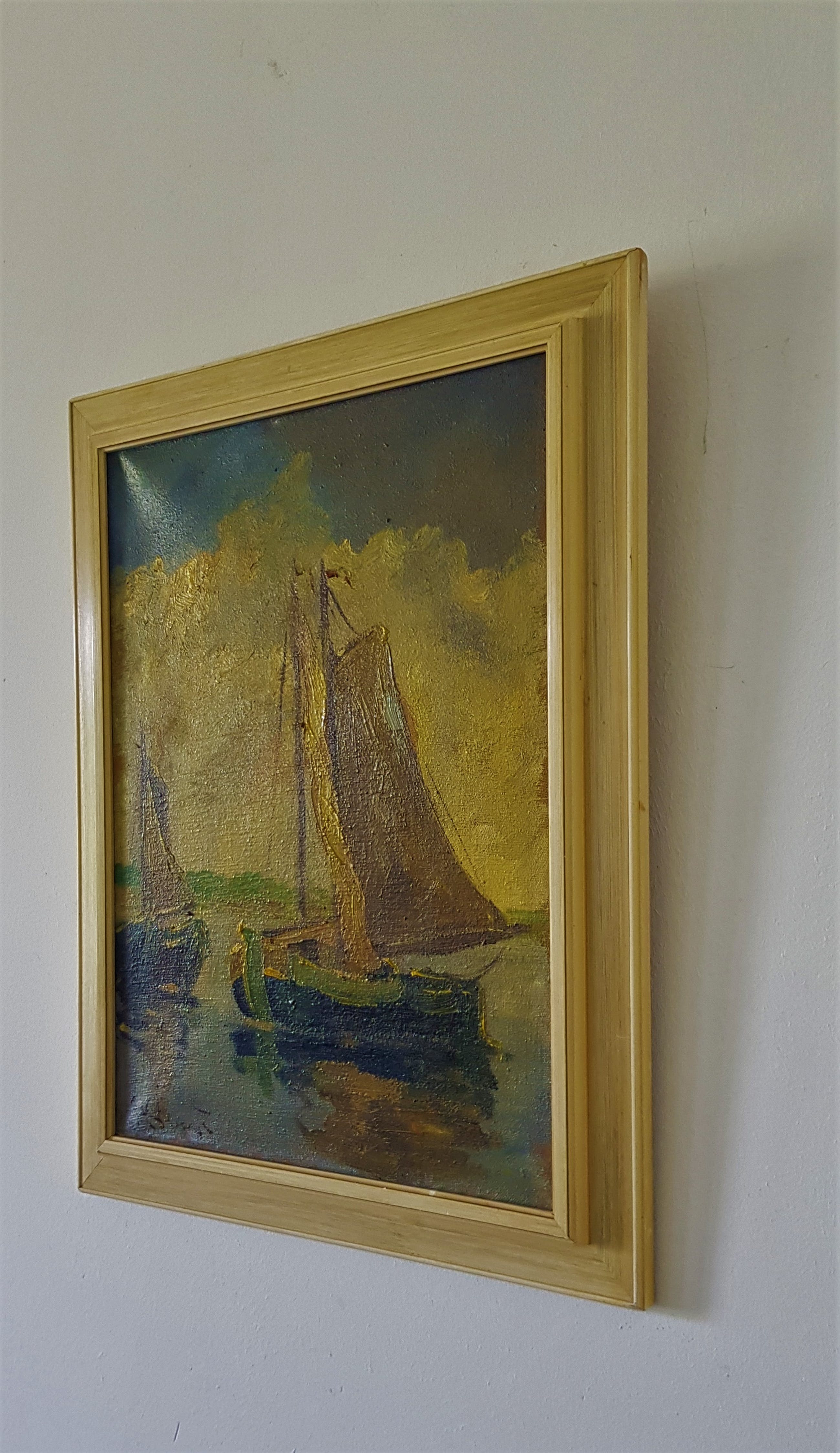 Onduidelijk gesigneerd, zeilboten aan land, Afmeting:40X30 cm - met lijs 47X37 cm In goede staat