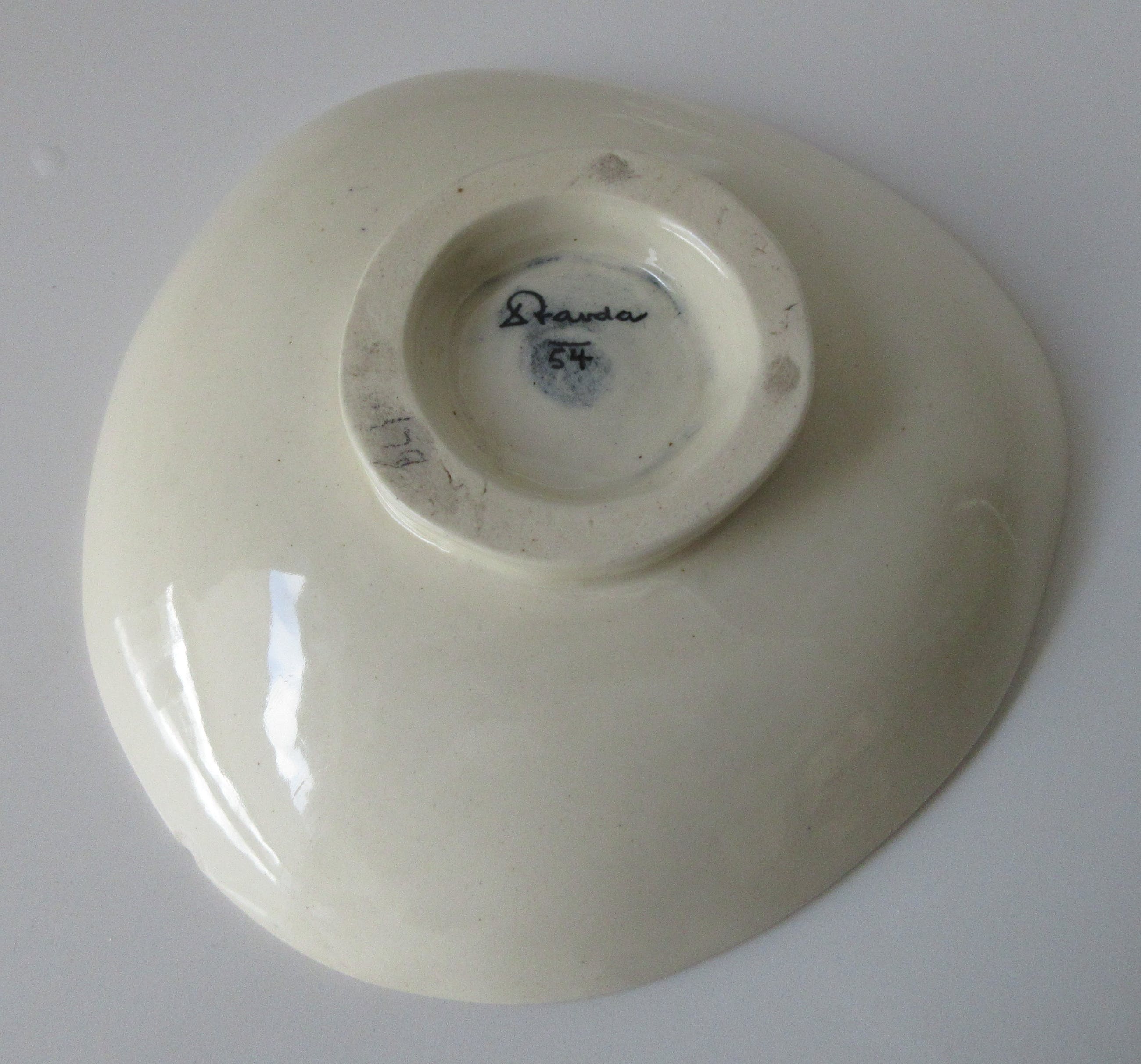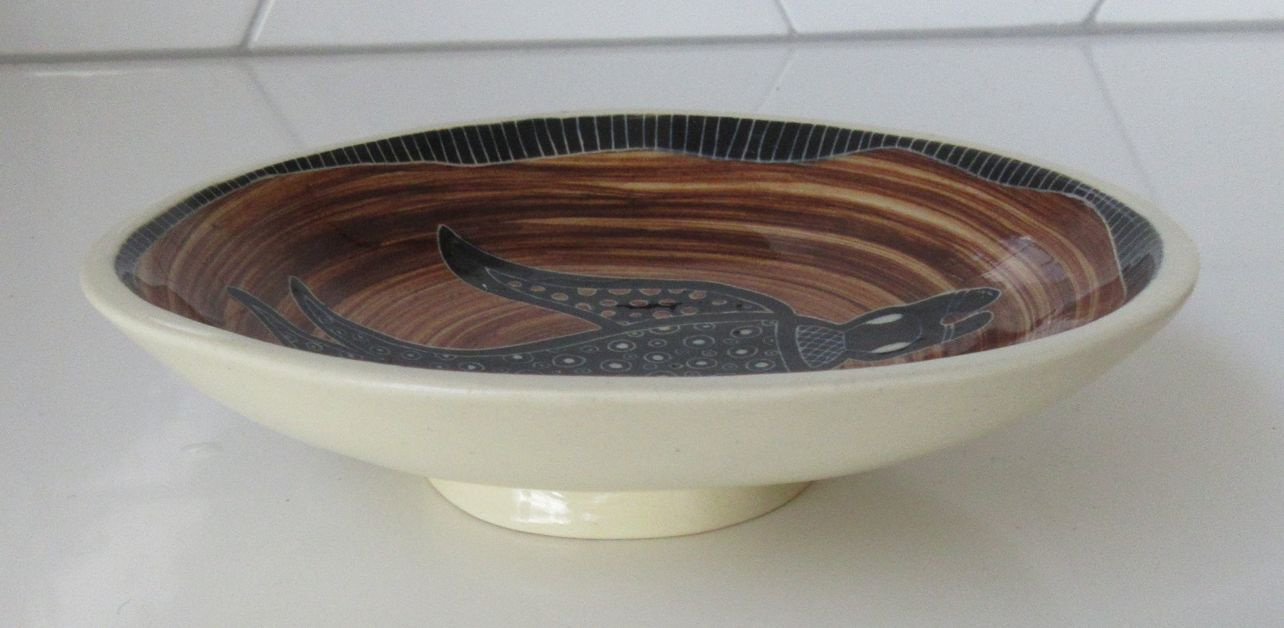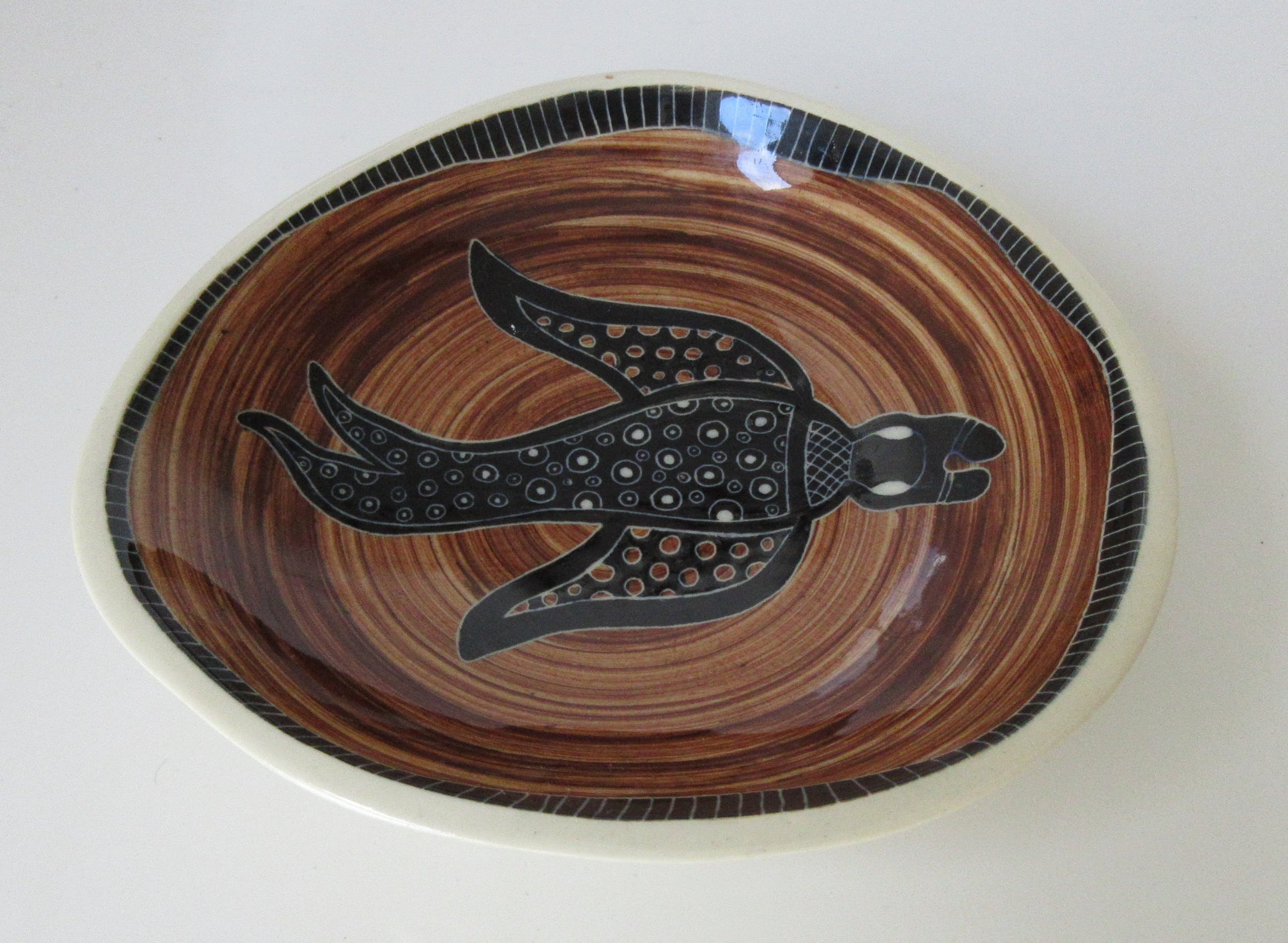 Zeldzaam hand gedecoreerd aardewerk schaaltje uitgevoerd door George Pravda (Tsjech. Acteur). De schaal is gemaakt in de jaren'50 en heeft een faux aboriginal decor wat in die tijd mode was in Australie. Aan de achterzijde hand gesigneerd G Pravda en voorzien van een modelnummer 54.