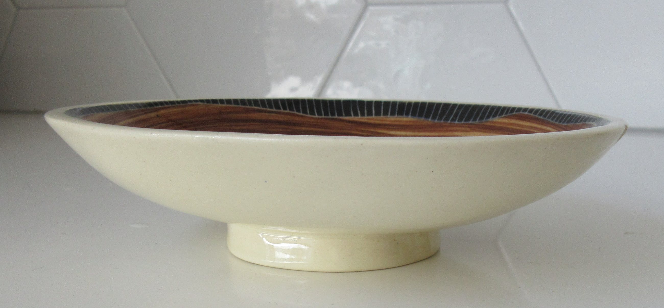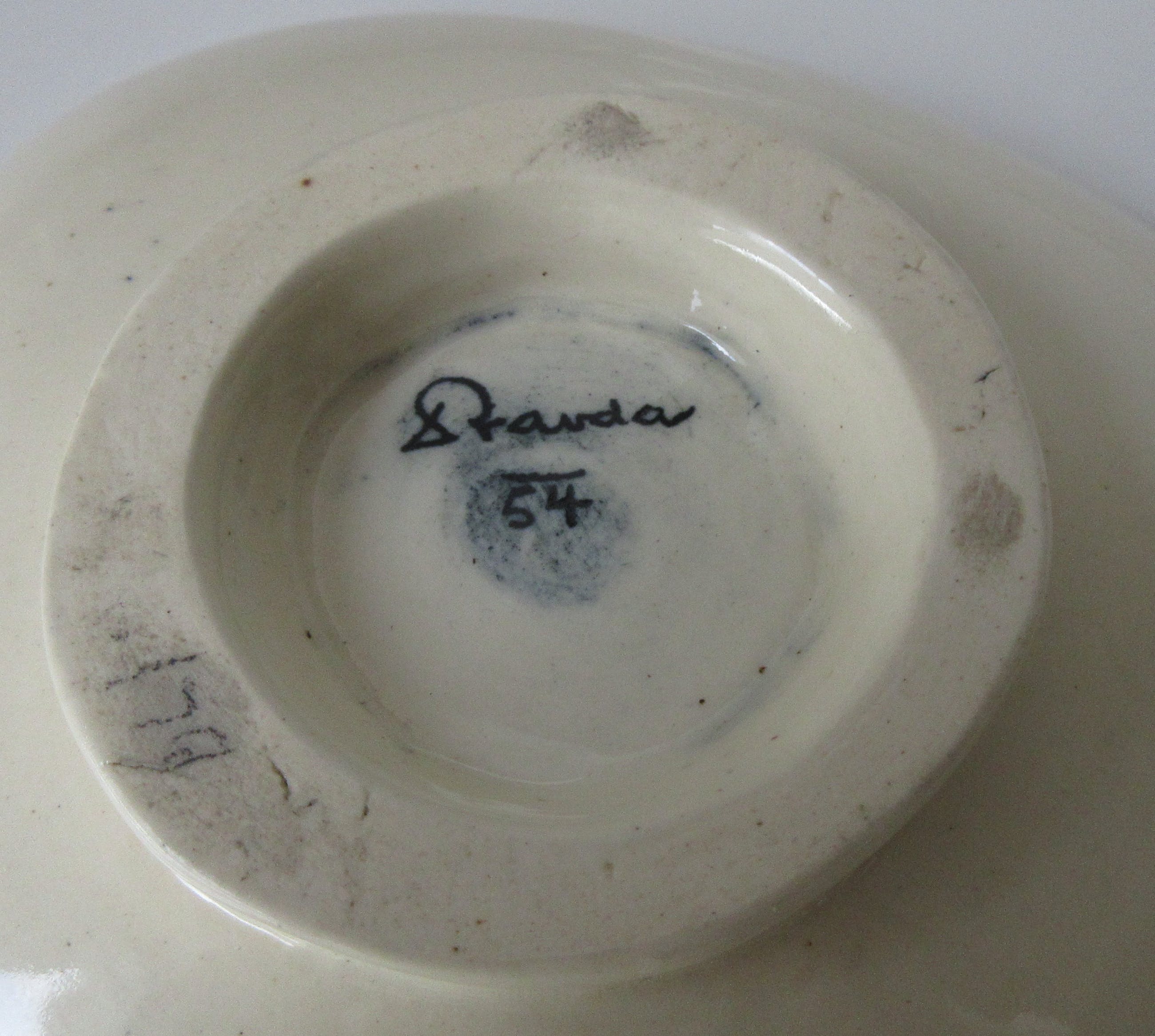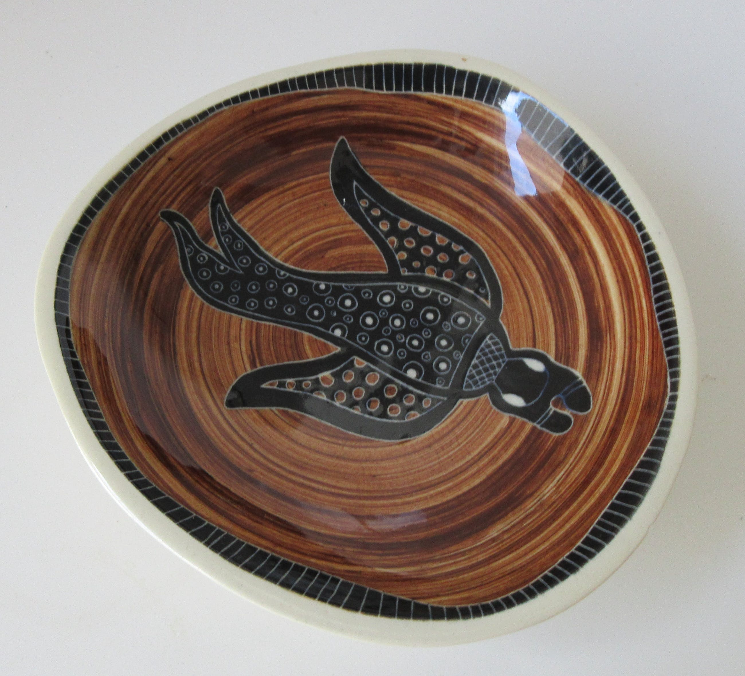 Zeldzaam hand gedecoreerd aardewerk schaaltje uitgevoerd door George Pravda (Tsjech. Acteur). De schaal is gemaakt in de jaren'50 en heeft een faux aboriginal decor wat in die tijd mode was in Australie. Aan de achterzijde hand gesigneerd G Pravda en voorzien van een modelnummer 54.