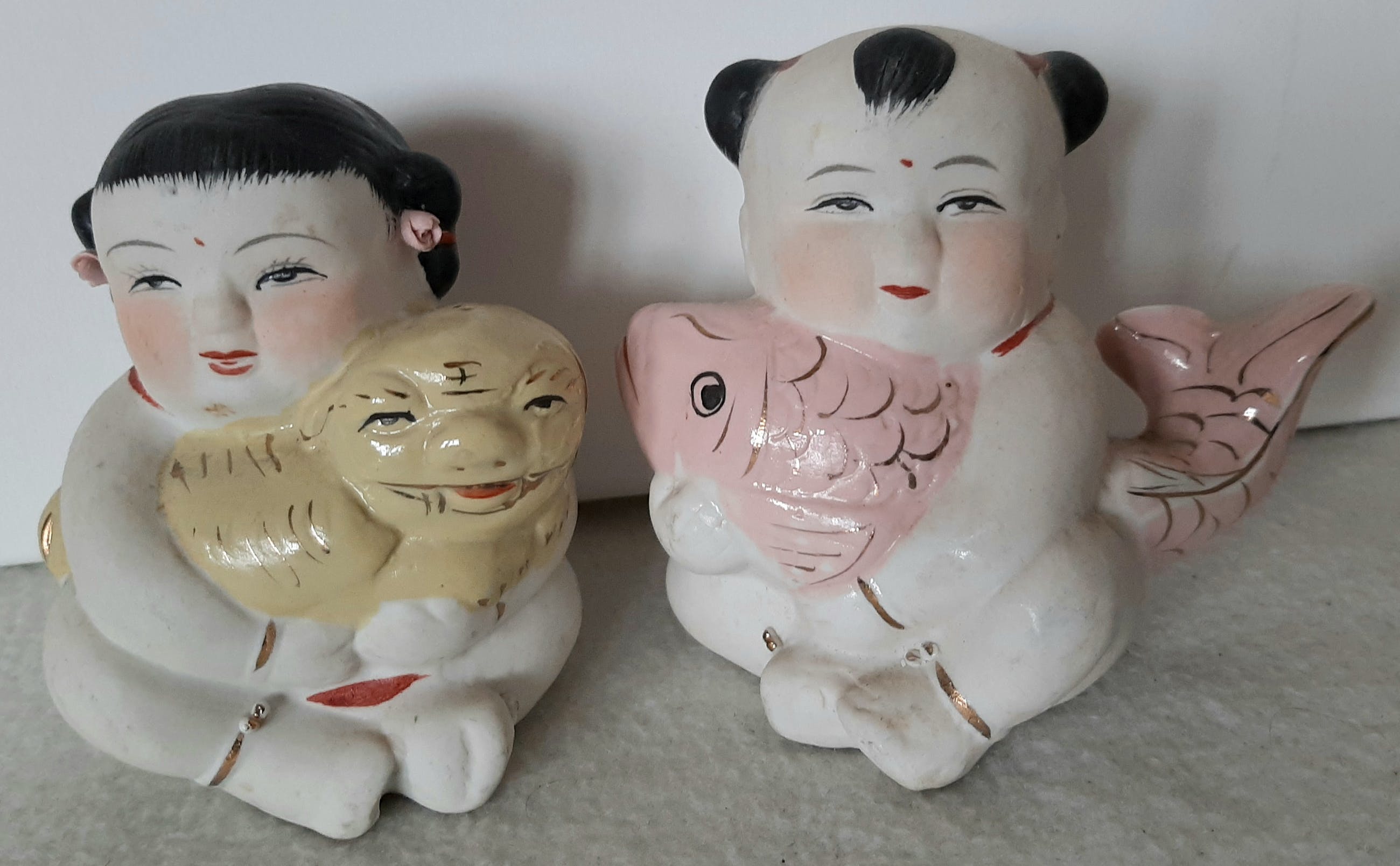 Een meisje met een Pekinees hond 10 x 10 cm en een jongen met een vis in haar armen 11 x 12cm. Ze worden in paren weergegeven. Deze beeldjes zullen liefde, rijkdom en gezondheid bij u thuis brengen. Zeldzame beeldjes uit Japan. Netsuke beeldje ontwerp.