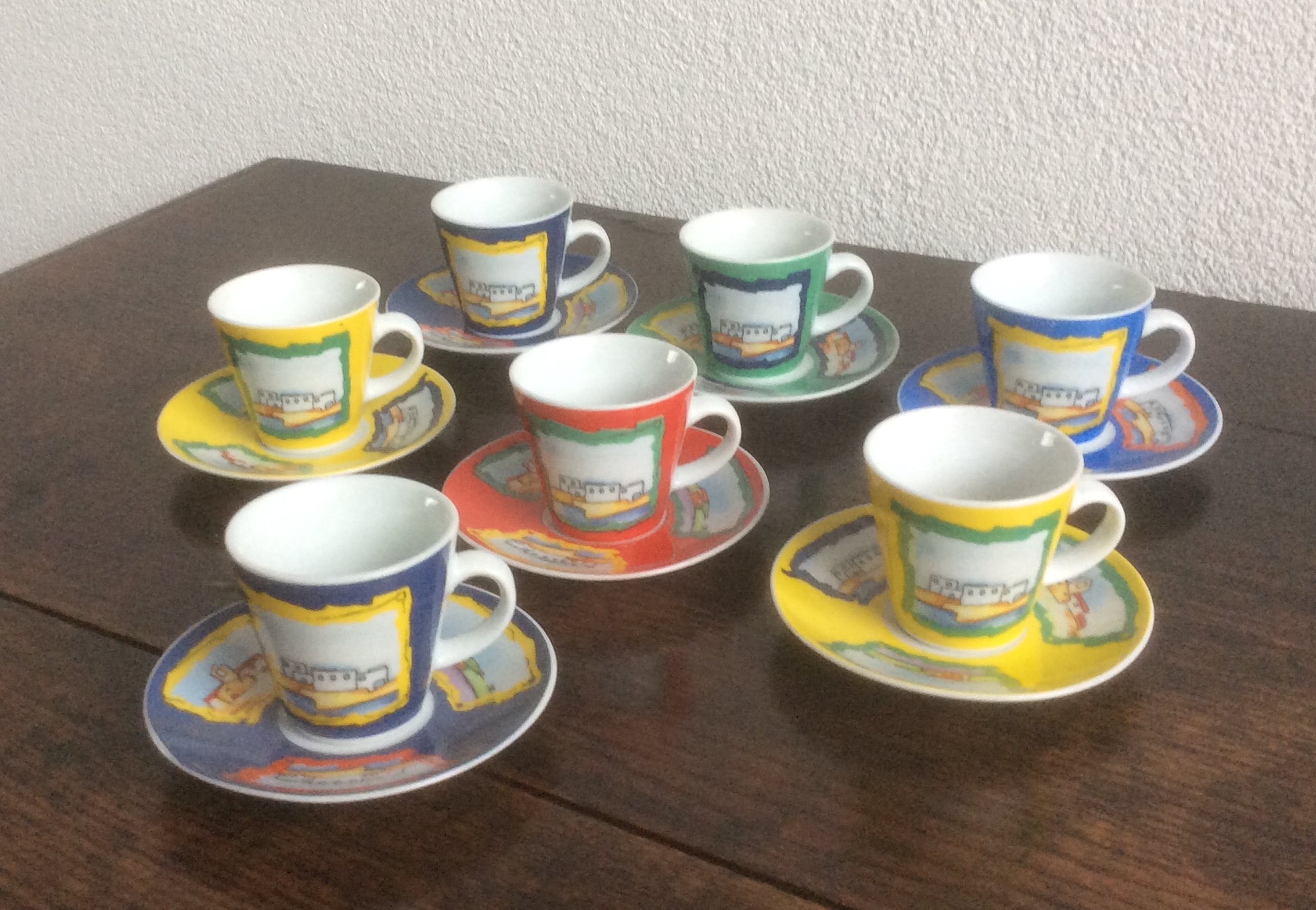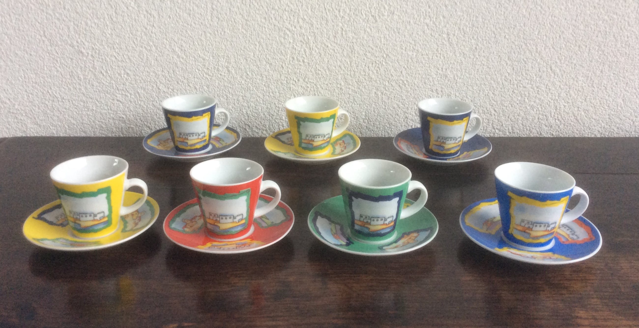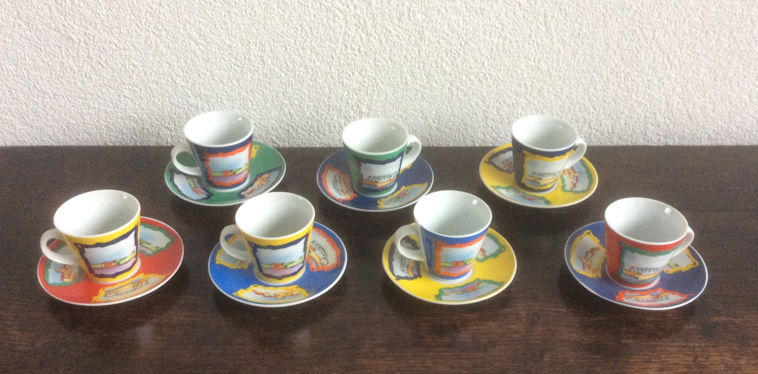 Zeven espresso kop en schotels in verschillende kleuren.