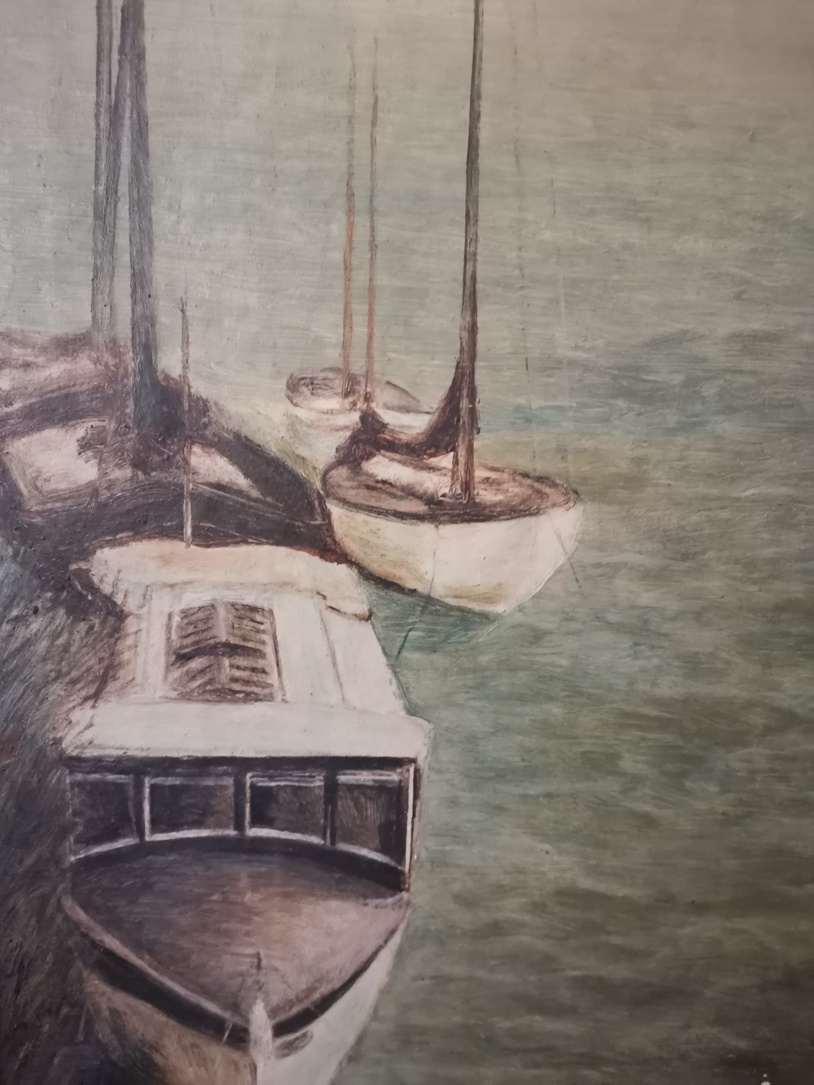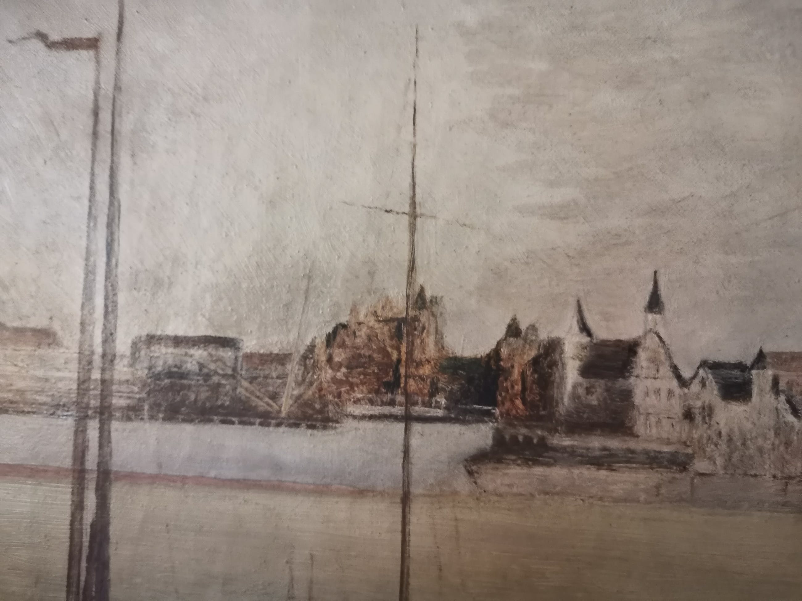 het schilderij stelt de jachthaven van Antwerpen voor met het historisch stadscentrum op de achtergrond,