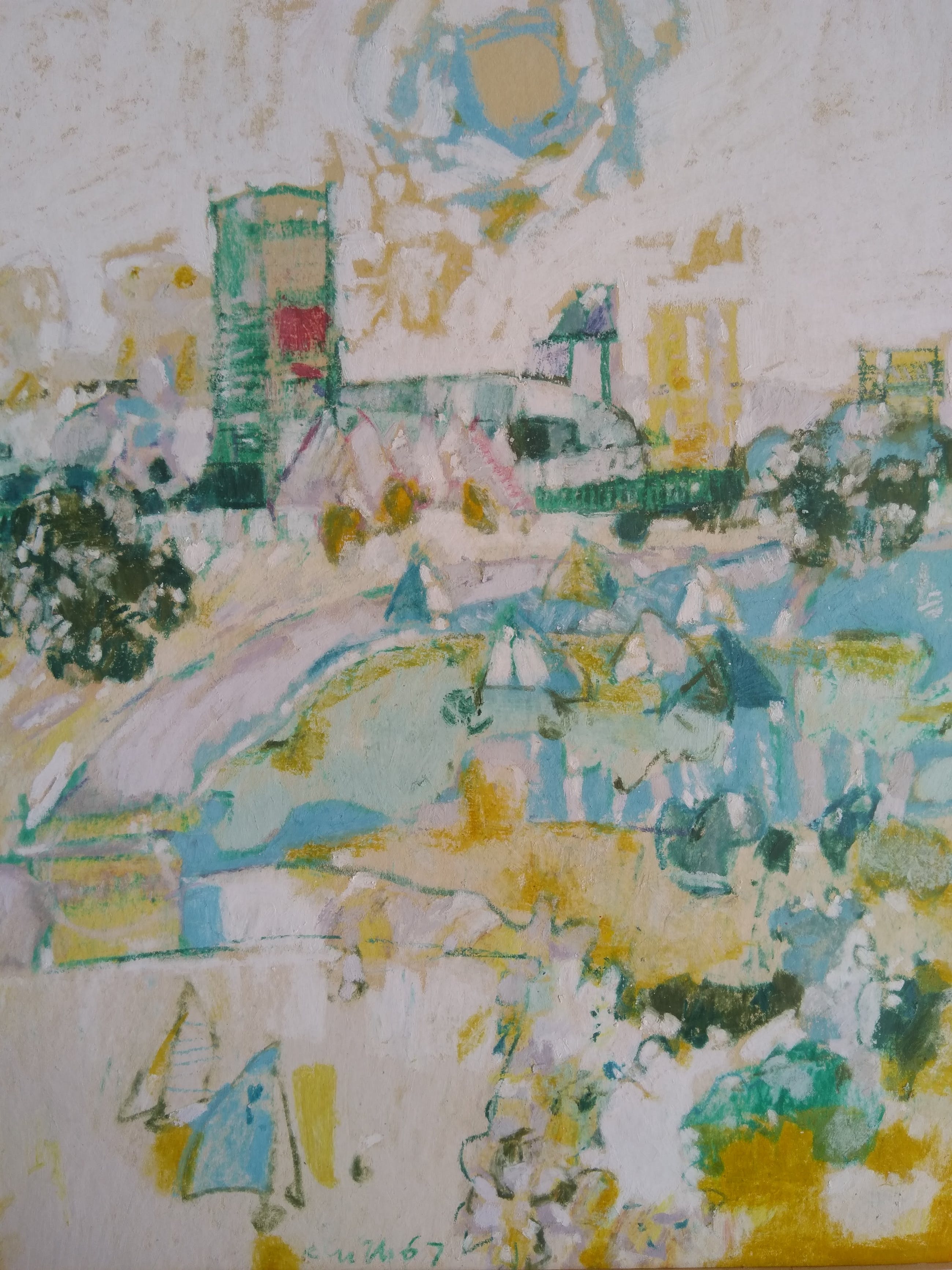 En vlot en expressievol getekende krijttekening (vetkrijt). Voorstellend een zicht op Dordrecht, op een zonnige dag. Op de voorgrond allerlei zeilbootjes en op de achtergrond de stad.Tekening is uit de lijst geweest om binnekant glas te reinigen. Werk zit nog in originele lijst.