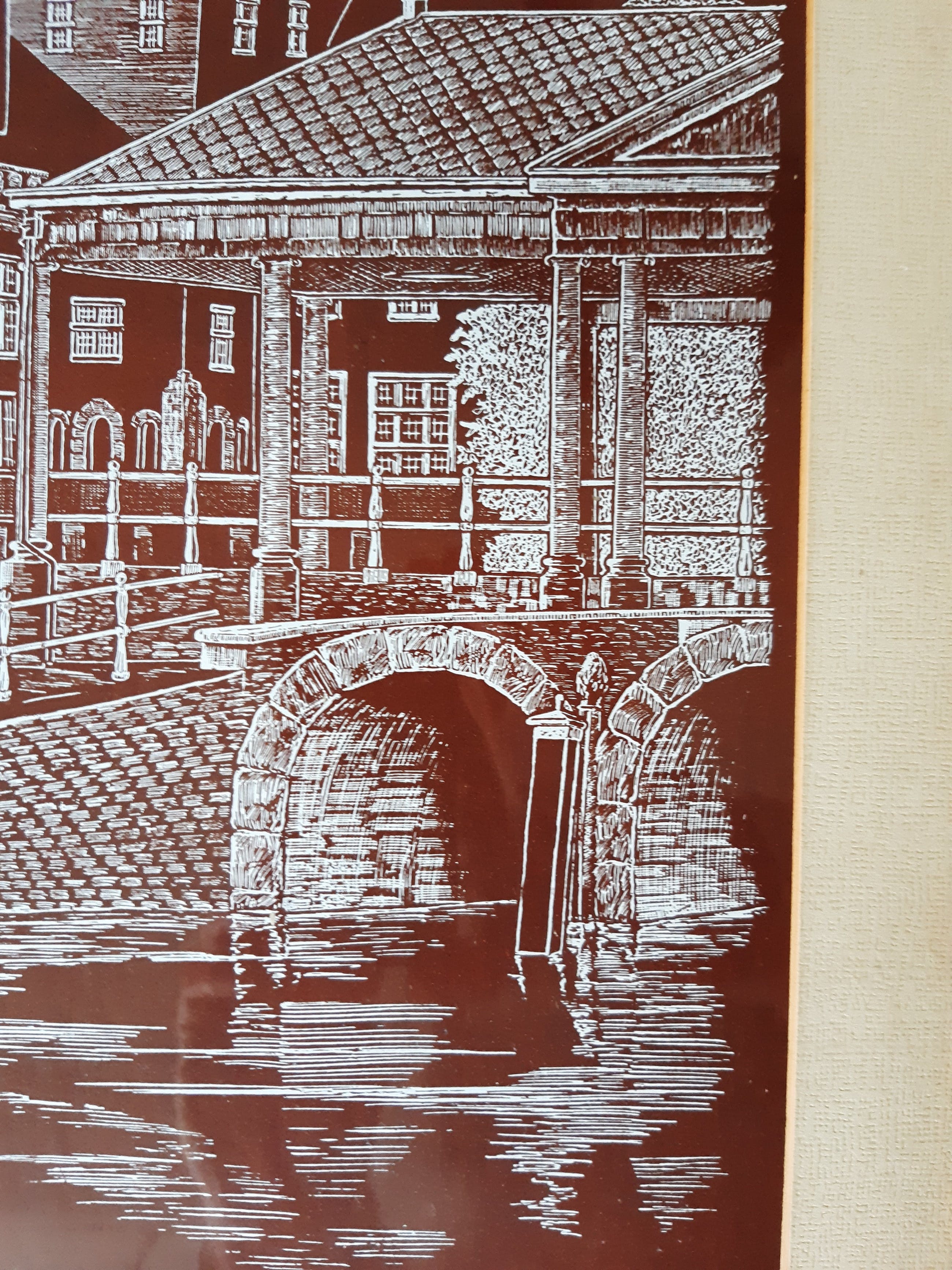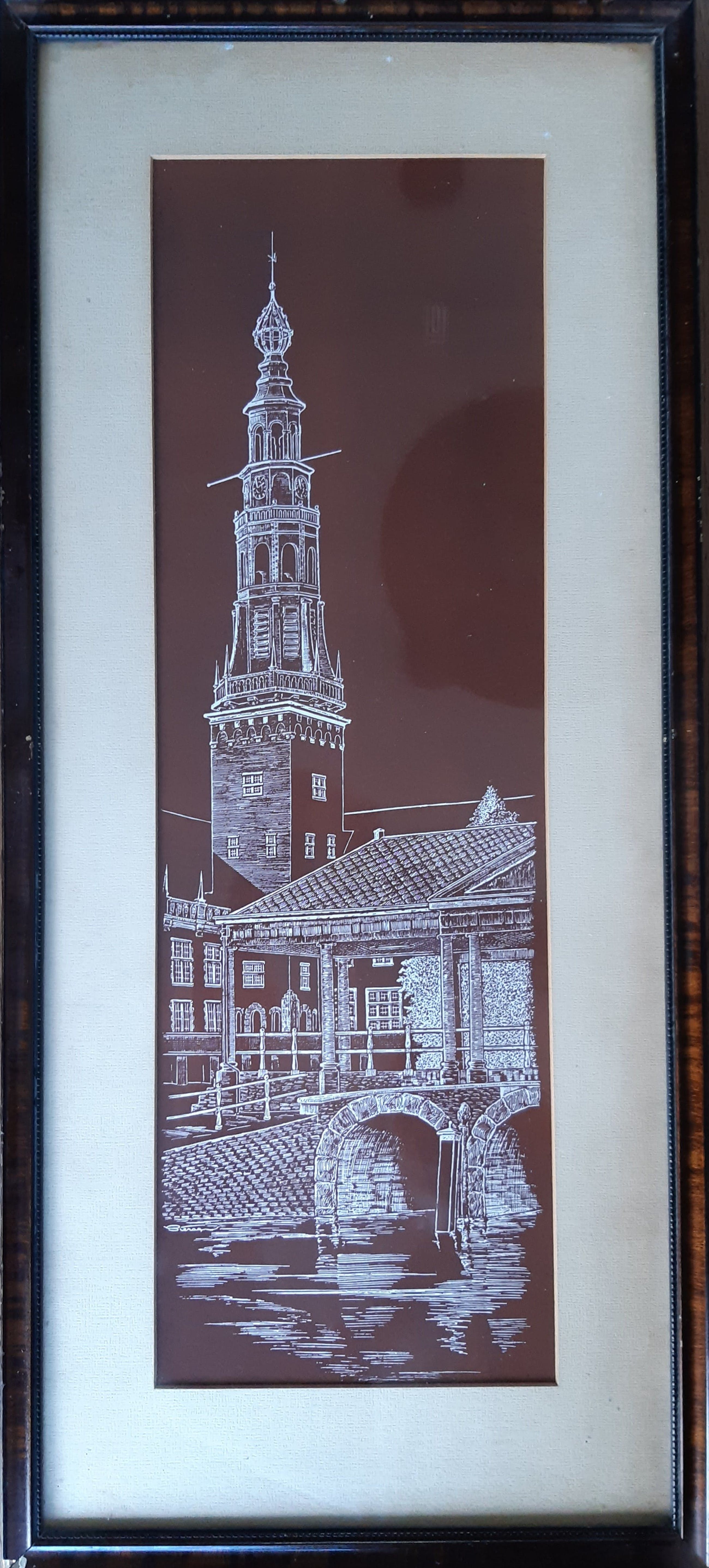 Een prachtige, grote, ingelijste houtsnede van een kerktoren en boogbrug over water.