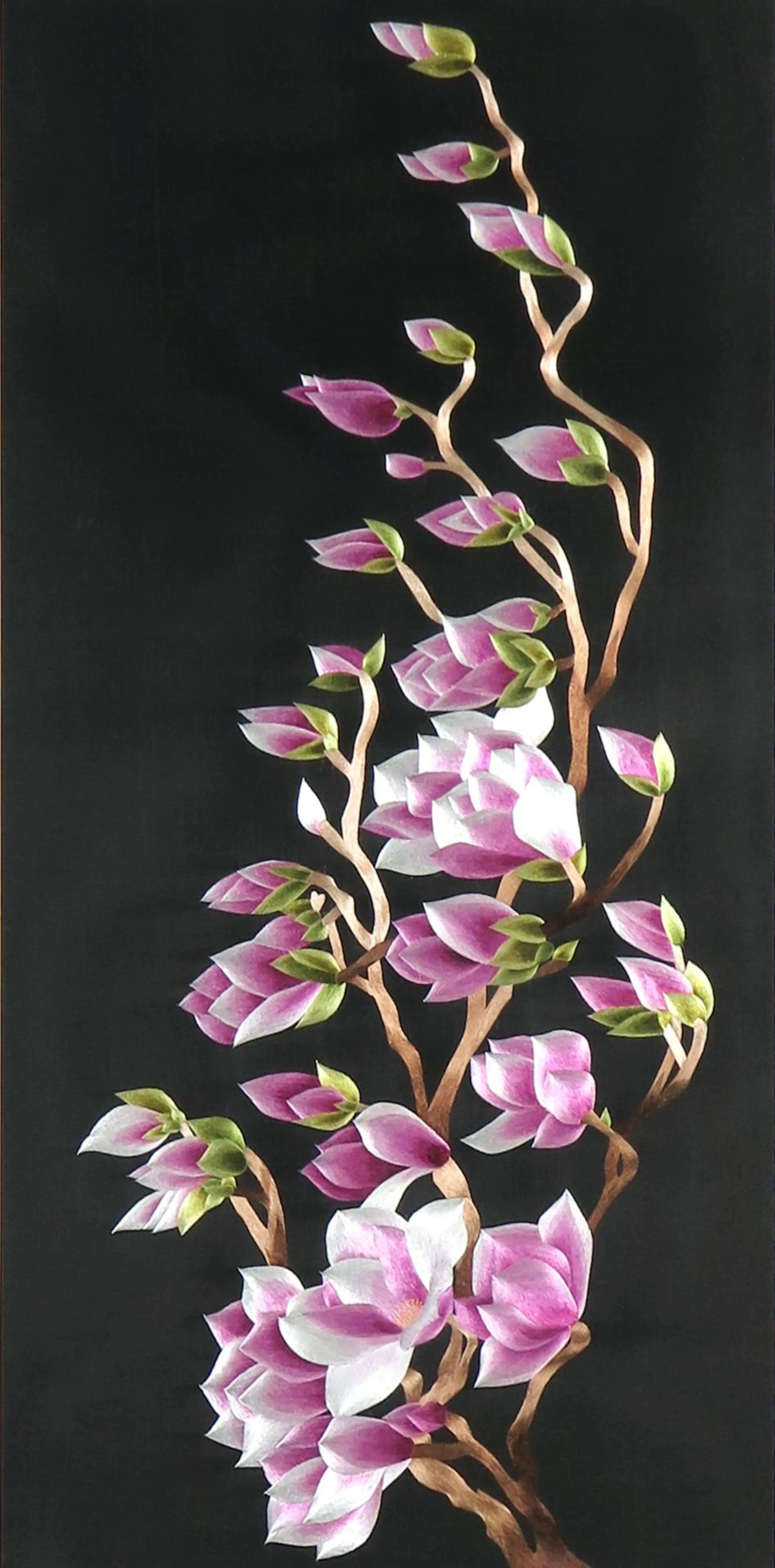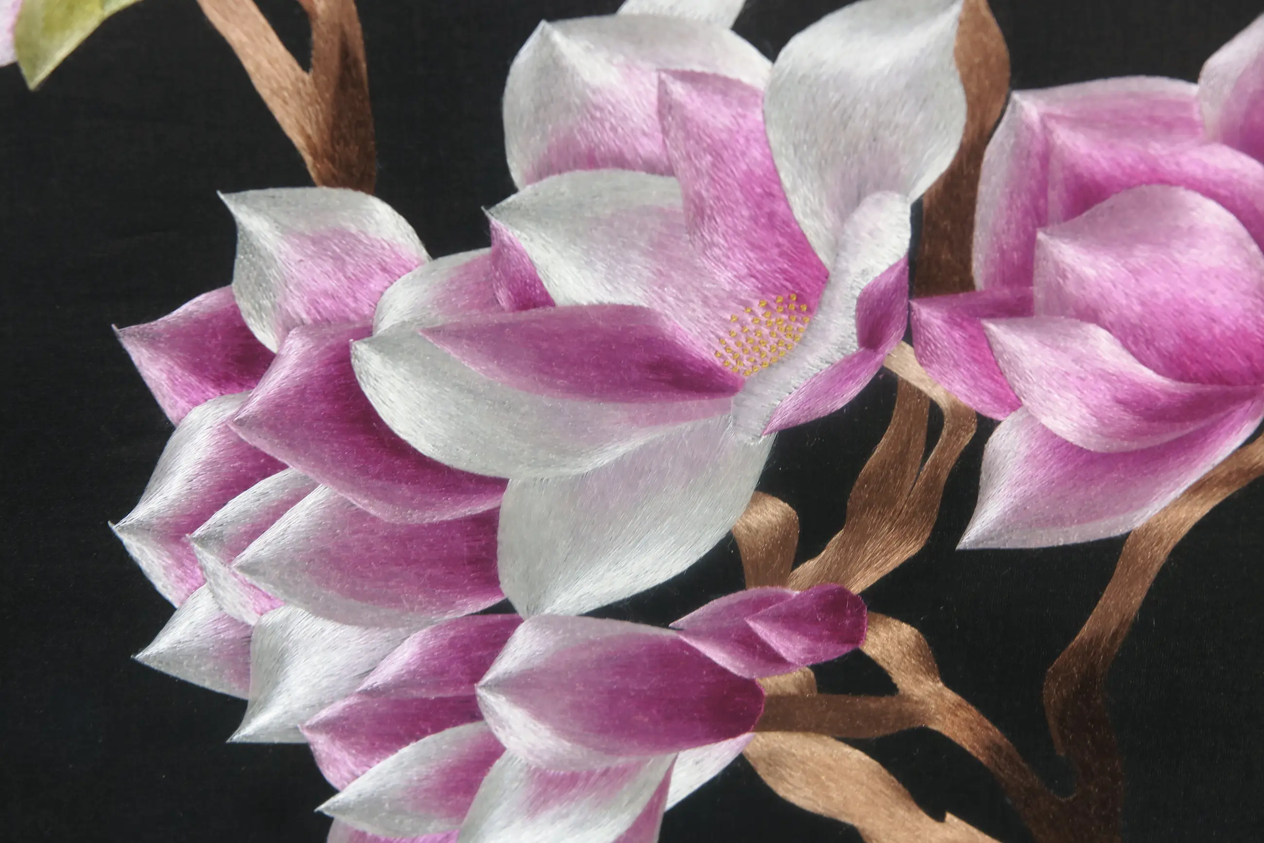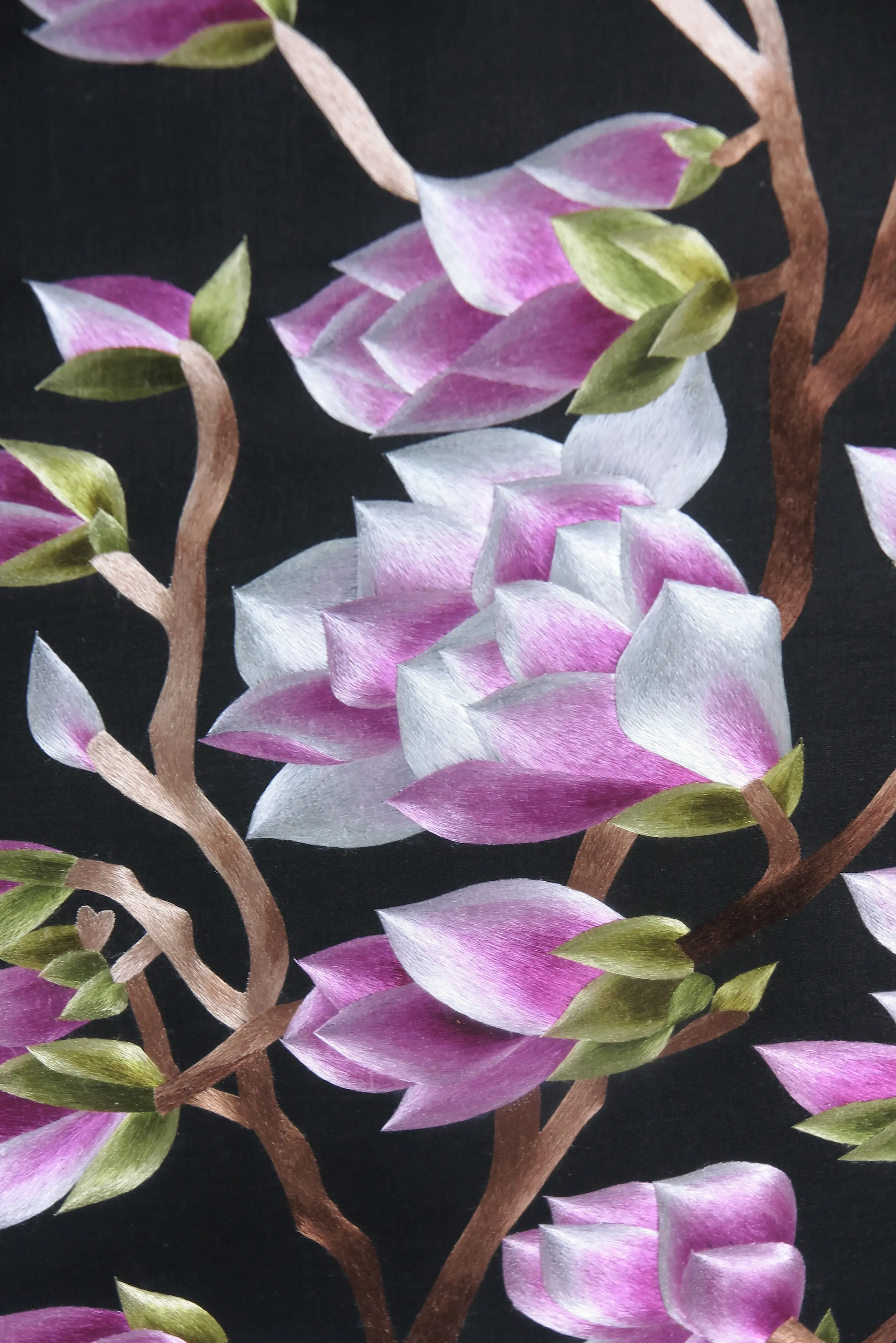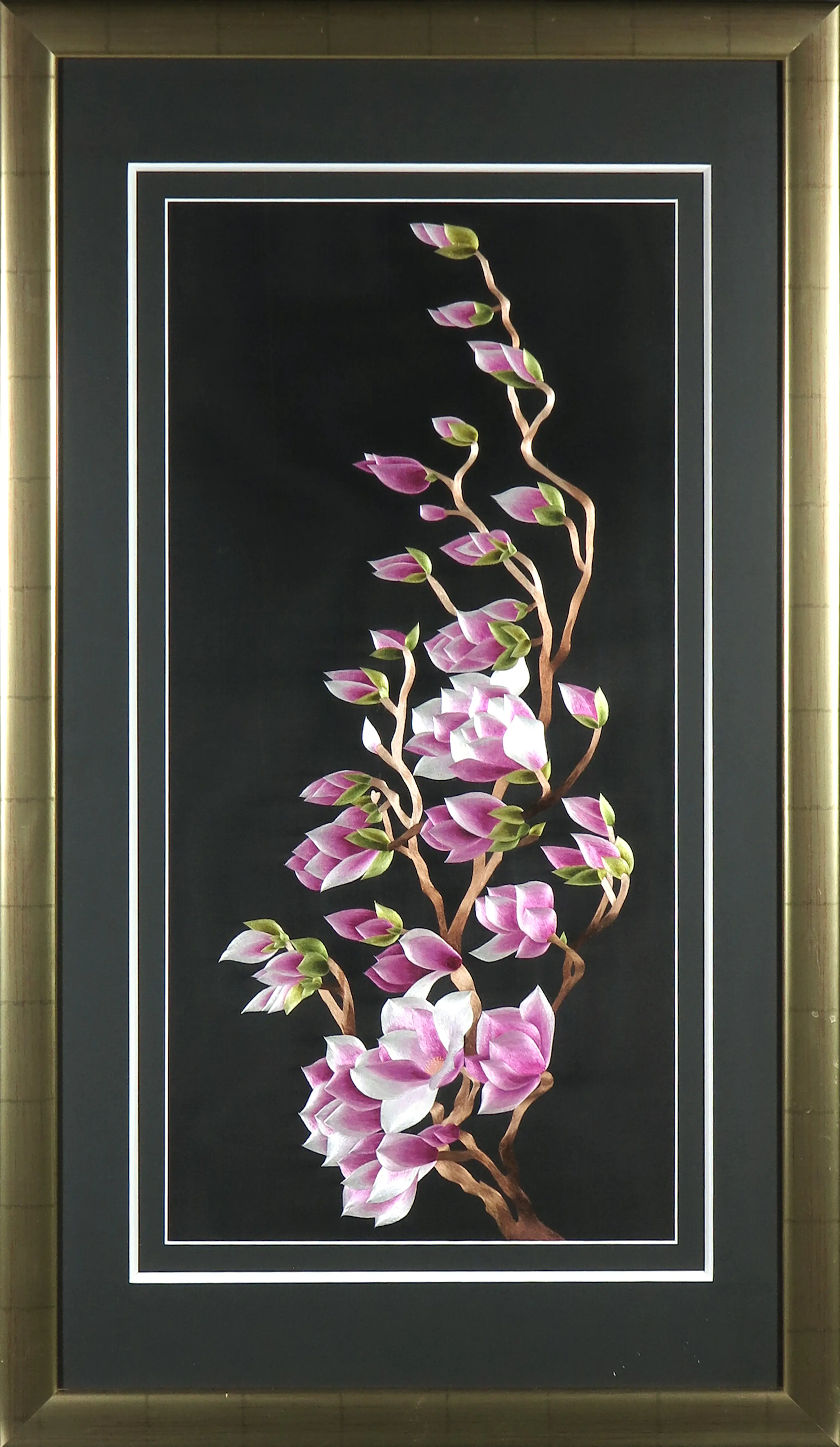 Oosters borduurwerk vervaardigd met zijde. Ingelijst achter dubbel passe-partout in een goudkleurige lijst.