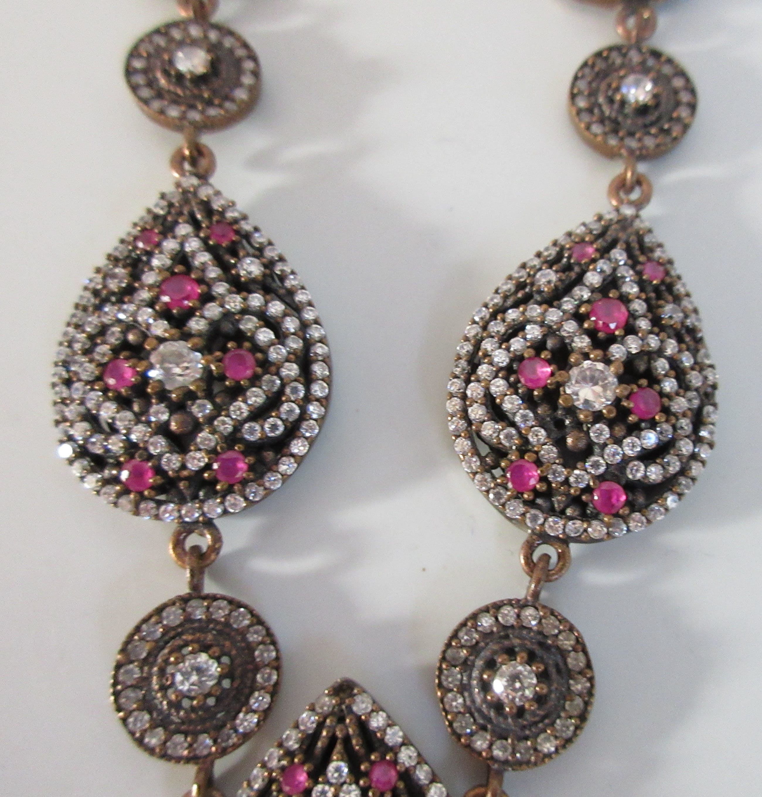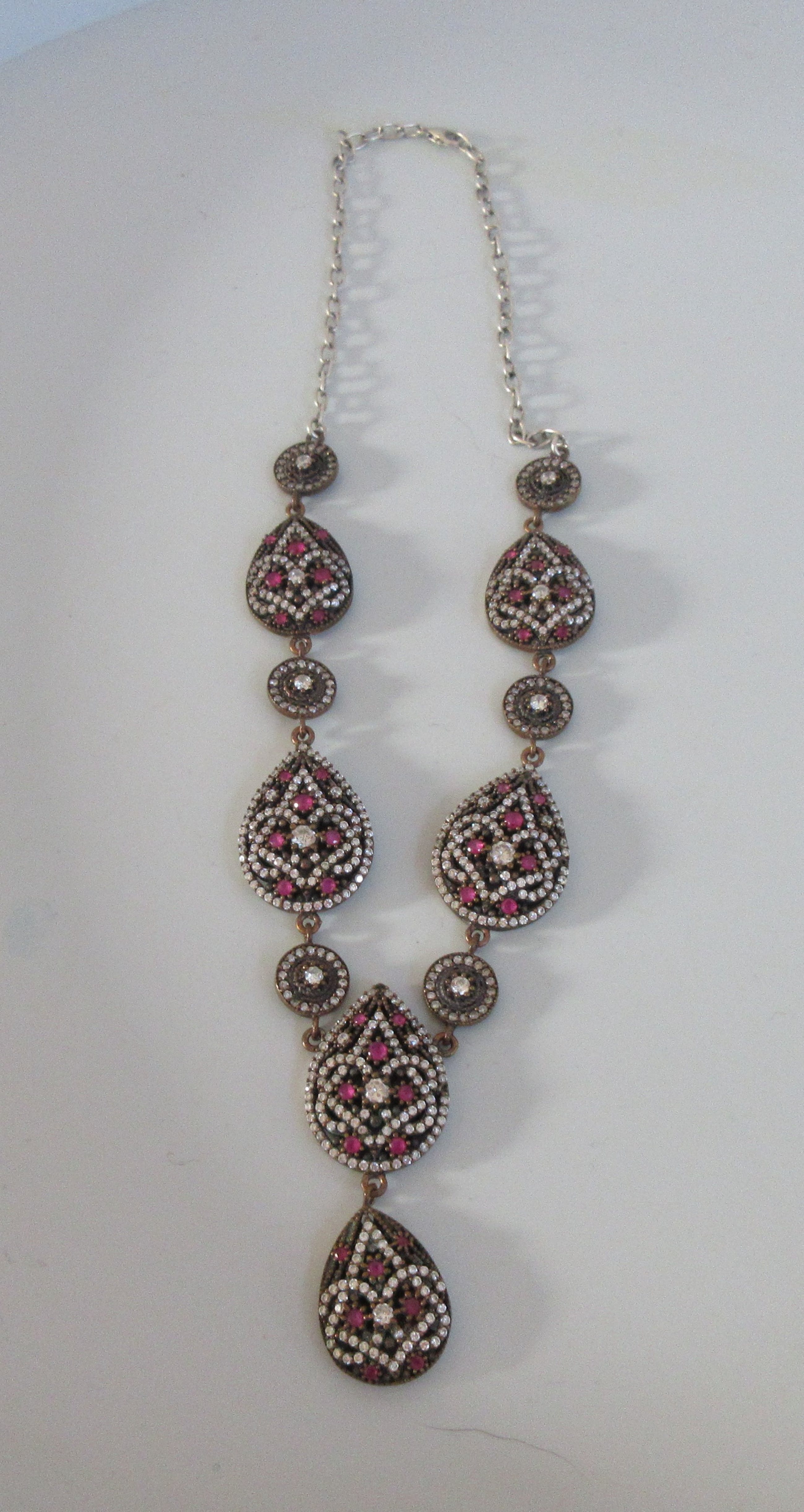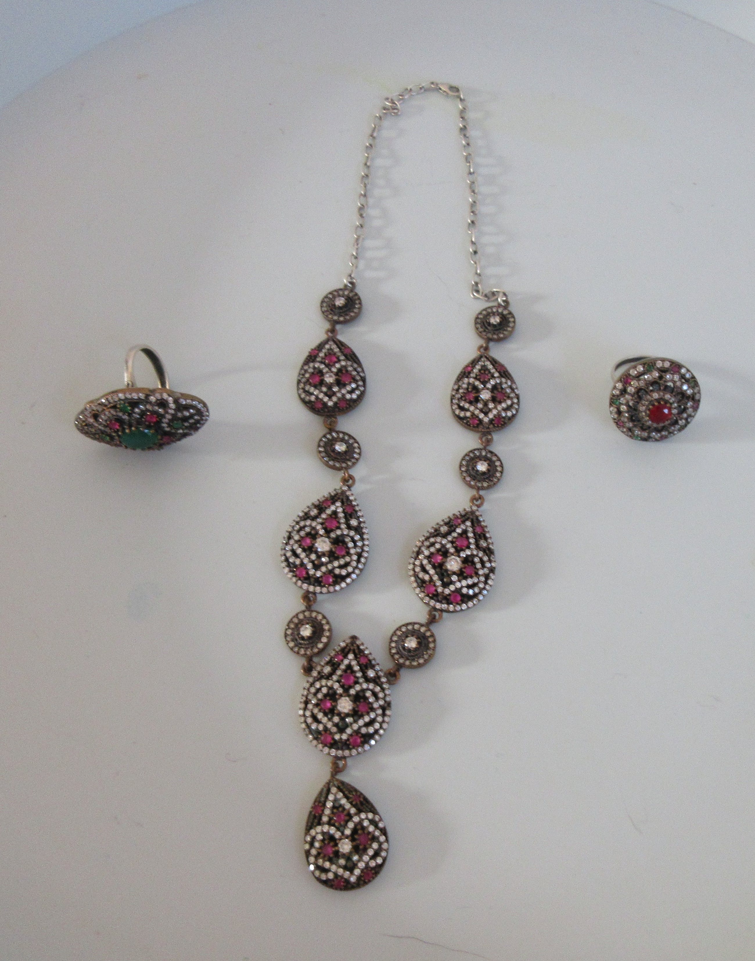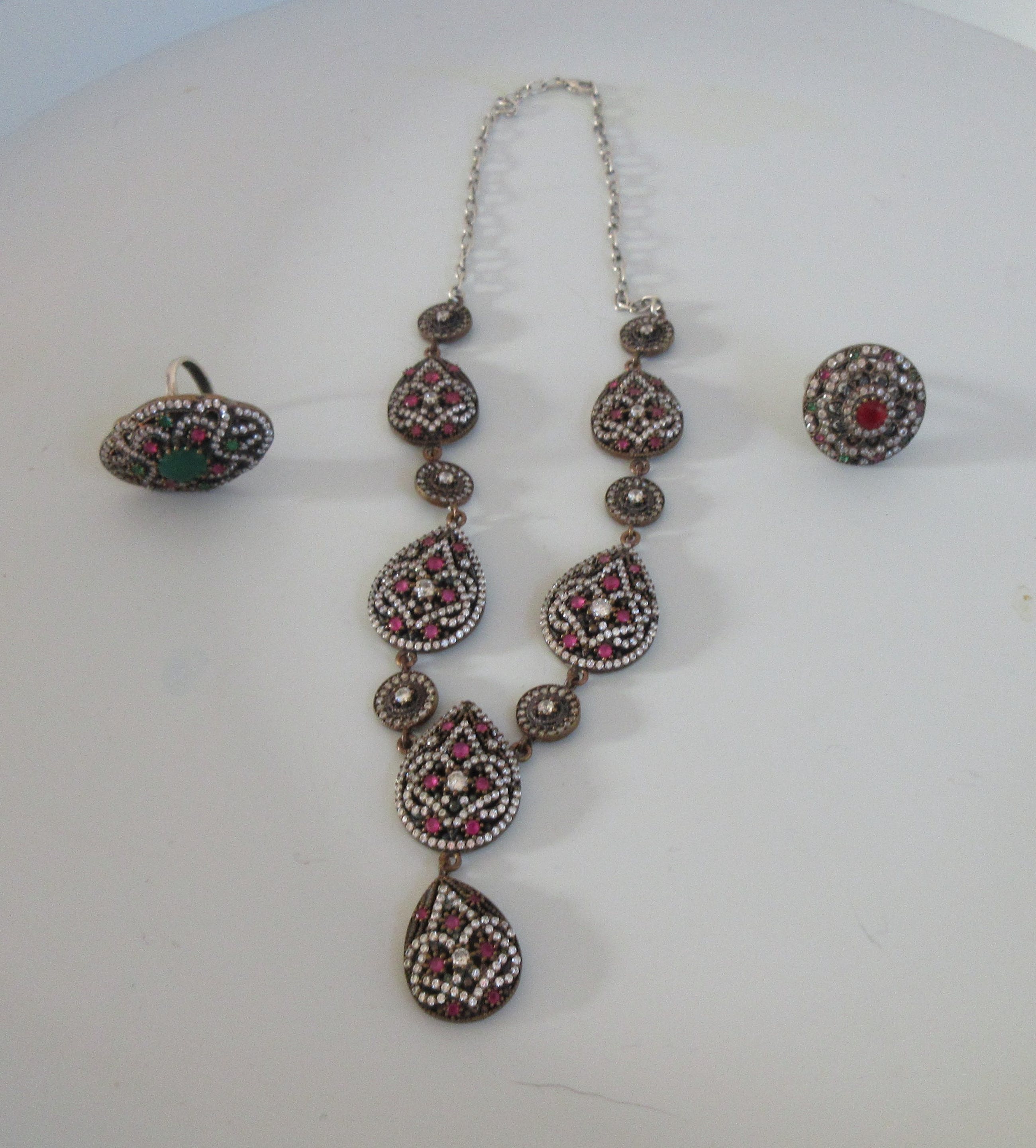 Antieke zilveren Afghaanse Kuchi Halsketting met hanger en twee ringen. In zeer goede gebruikte conditie, de ronde ring mist drie steentjes. De halsketting is van eerste gehalte .925 zilver en de de hangers zijn bezet met witte diamantvormige en roze steentjes. Er is een ovale ring en een ronde ring beide hebben ringmaat 56 = 55,9 - 56,9 omtrek in mm. De ronde ring heeft als hoofdsteen een rode steen op de vier hoeken vier groene en roze steentjes en verder voorzien diamantvormige steentjes. De ovale ring heeft als hoofdsteen een groene steen en is daaromheen ook voorzien van vier groene en vier roze steentjes en is voor de rest ook bezet met diamantvormige steentjes. De ringen zijn van eerste gehalte zilver en voorzien van ingedrukte keur .925.