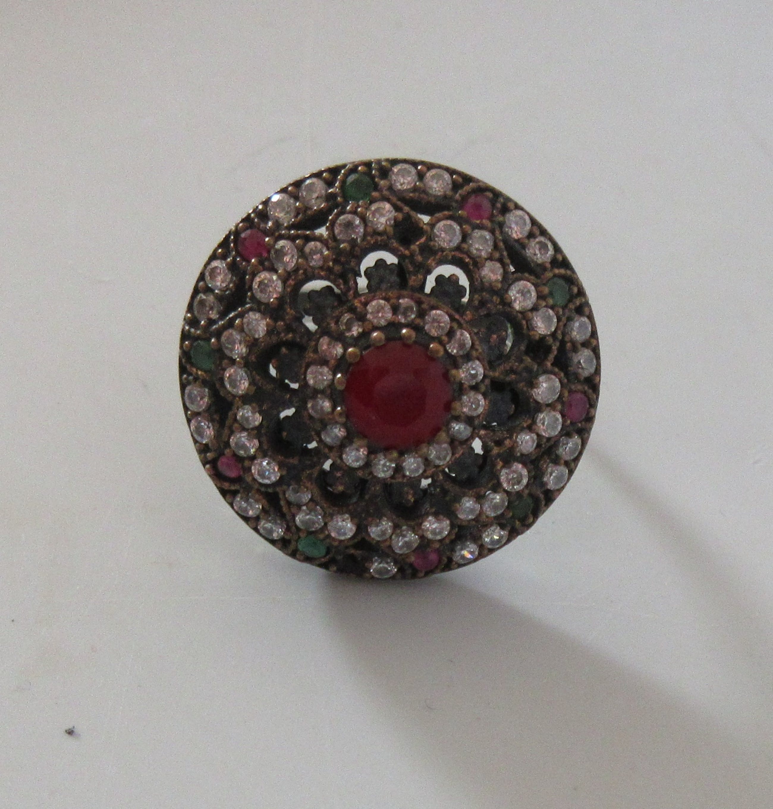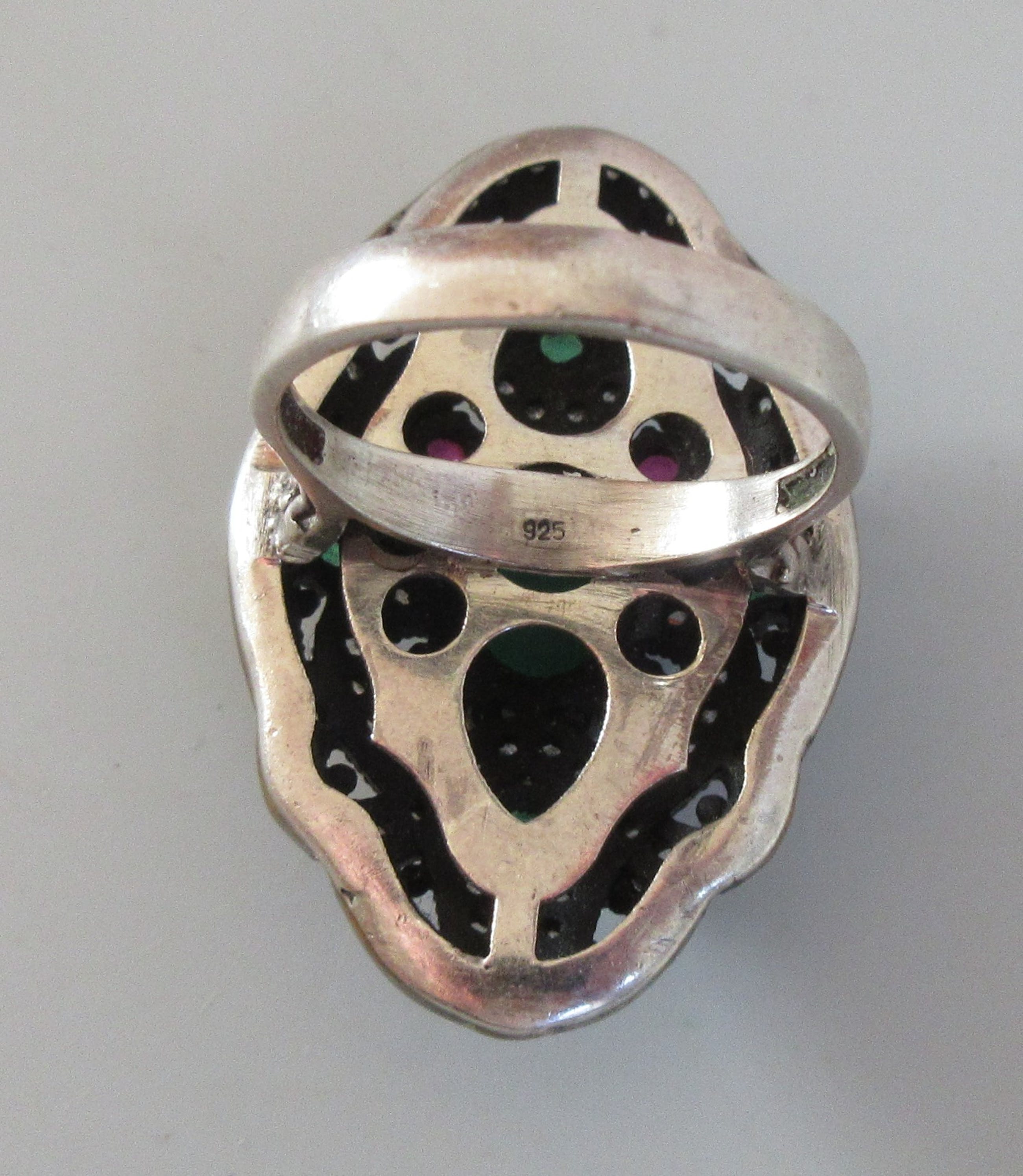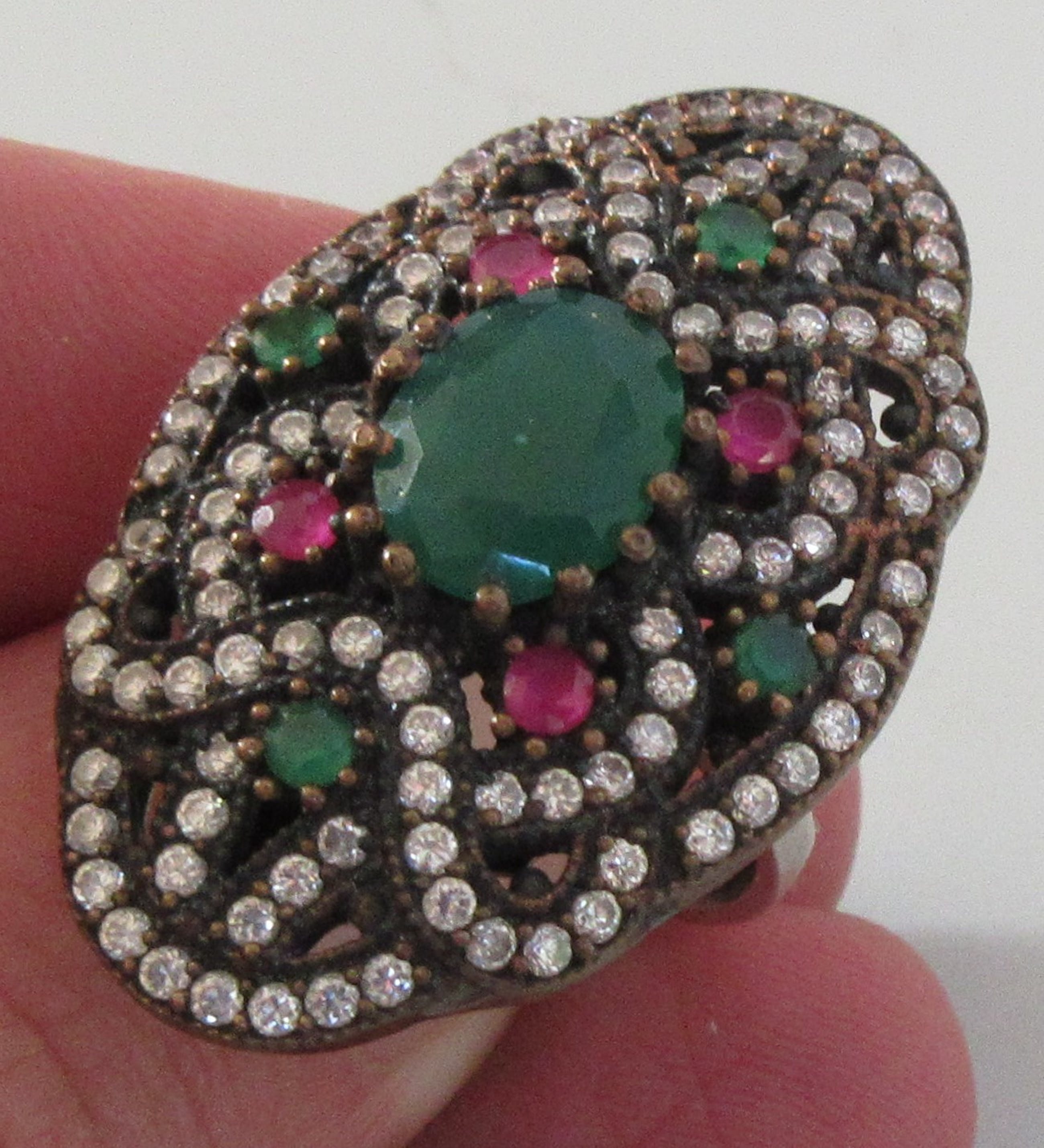 Antieke zilveren Afghaanse Kuchi Halsketting met hanger en twee ringen. In zeer goede gebruikte conditie, de ronde ring mist drie steentjes. De halsketting is van eerste gehalte .925 zilver en de de hangers zijn bezet met witte diamantvormige en roze steentjes. Er is een ovale ring en een ronde ring beide hebben ringmaat 56 = 55,9 - 56,9 omtrek in mm. De ronde ring heeft als hoofdsteen een rode steen op de vier hoeken vier groene en roze steentjes en verder voorzien diamantvormige steentjes. De ovale ring heeft als hoofdsteen een groene steen en is daaromheen ook voorzien van vier groene en vier roze steentjes en is voor de rest ook bezet met diamantvormige steentjes. De ringen zijn van eerste gehalte zilver en voorzien van ingedrukte keur .925.